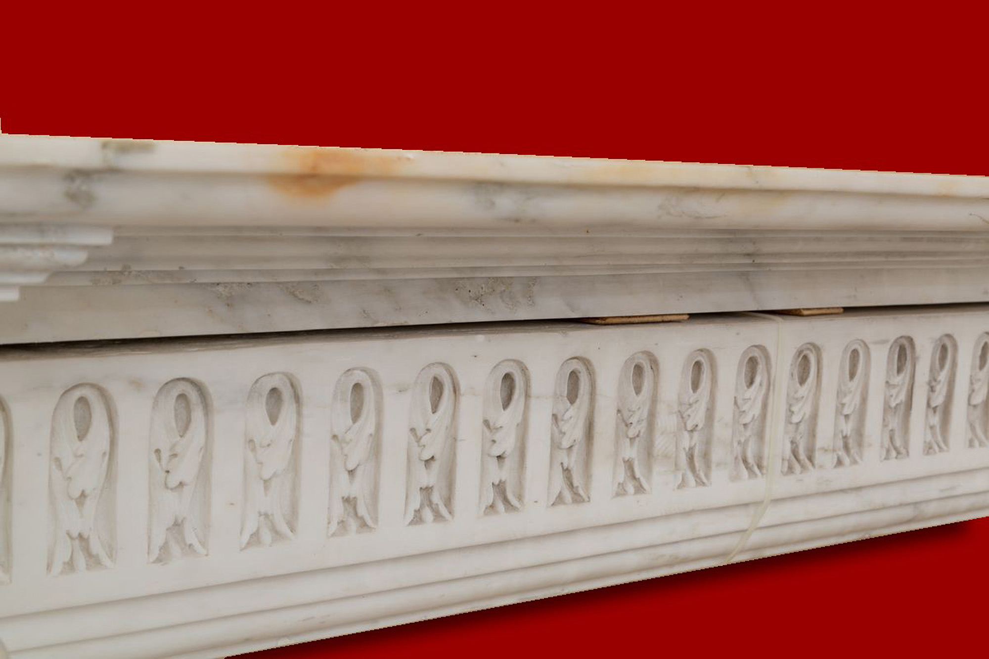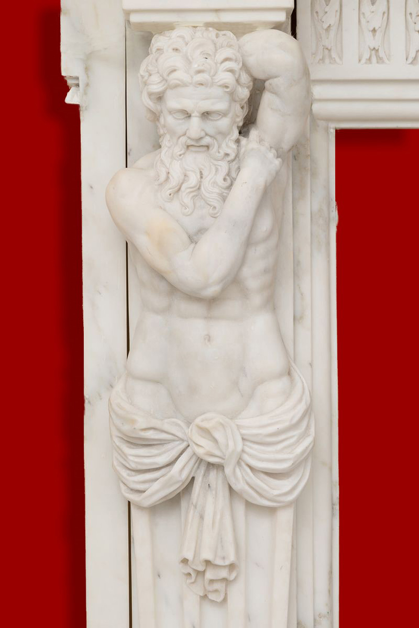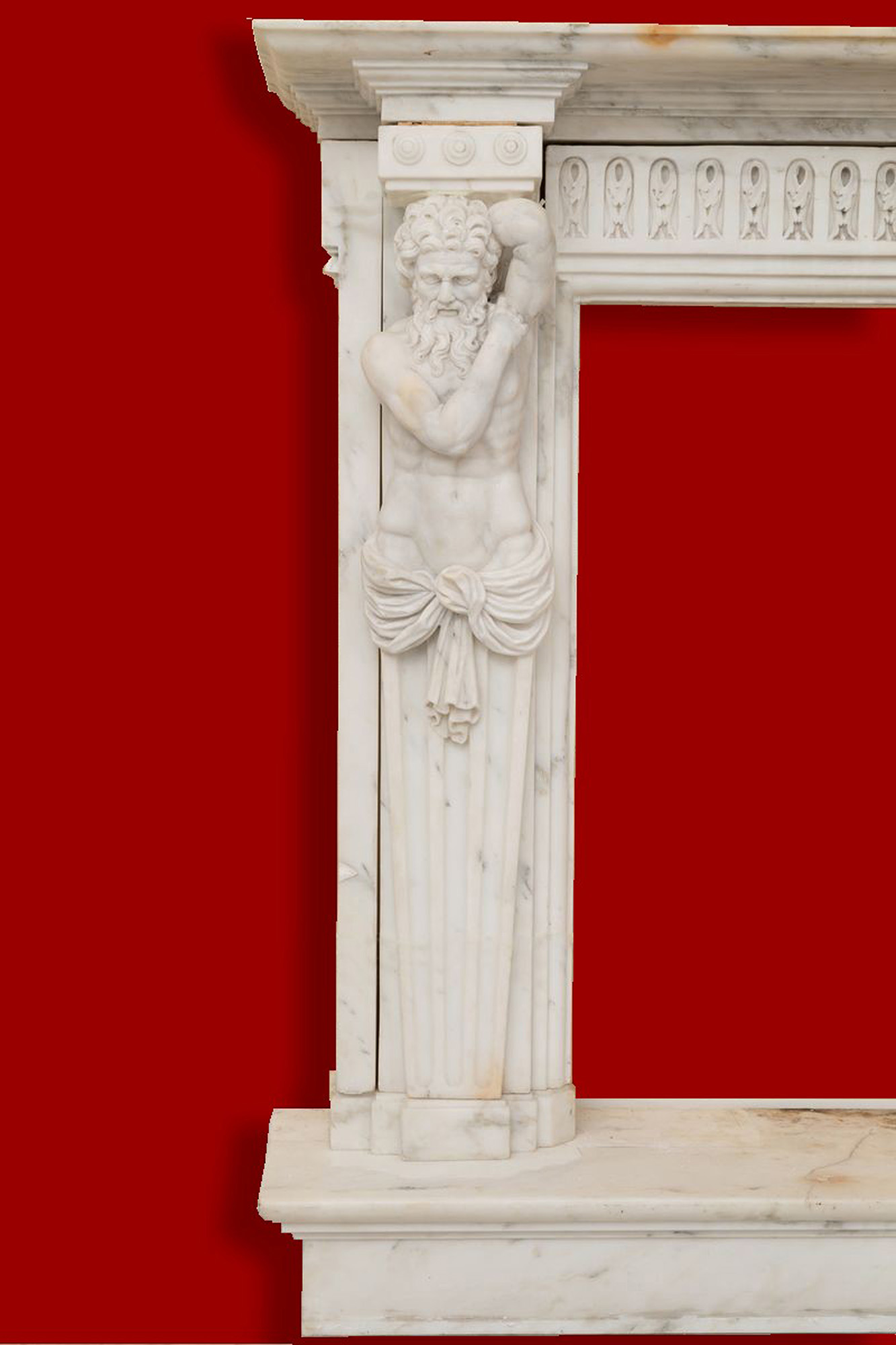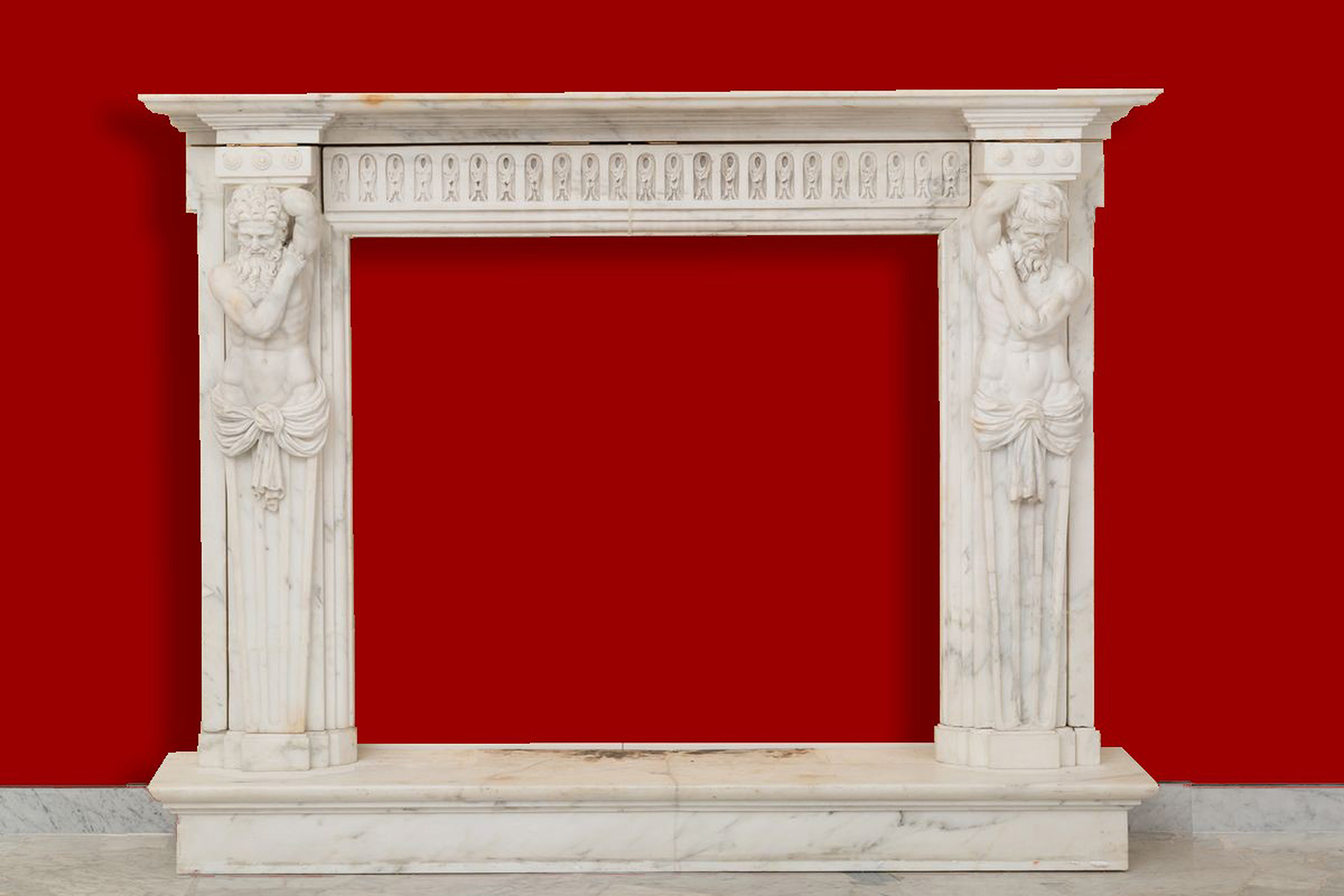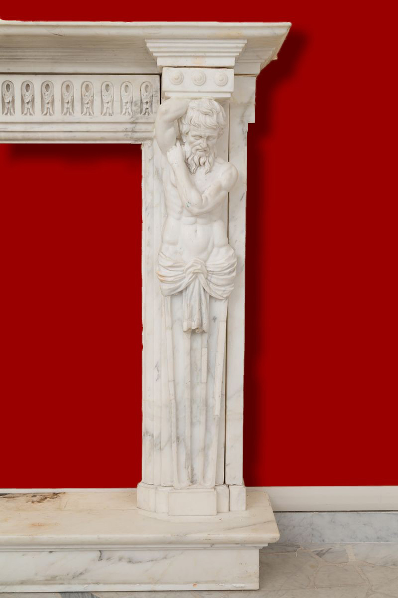 Fireplace in white Carrara marble decorated with lateral Telamons. 19th century. 128x165x30 cm approx. Camino in marmo bianco di Carrara decorato con telamoni laterali. XIX secolo. 128x165x30 cm ca.