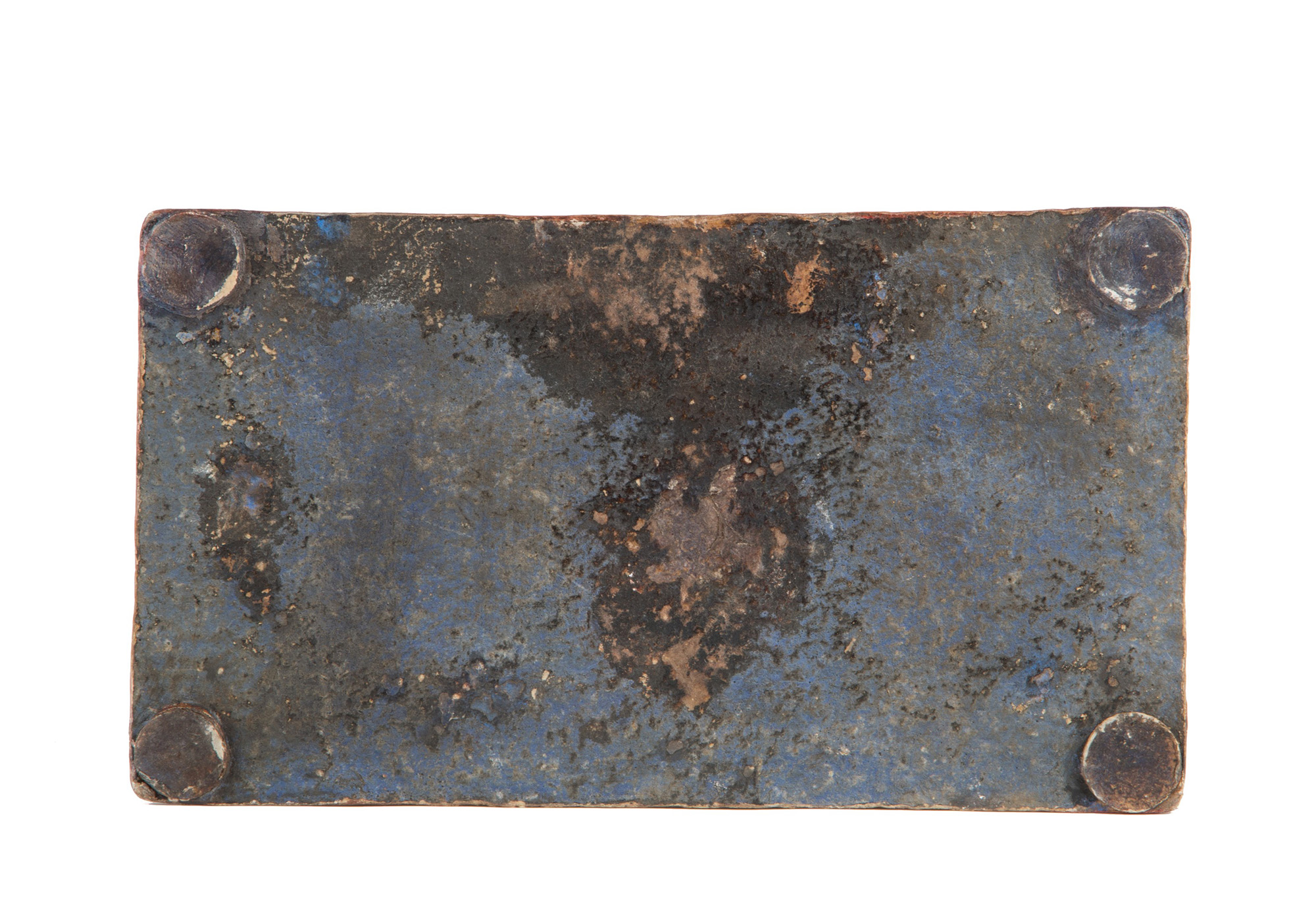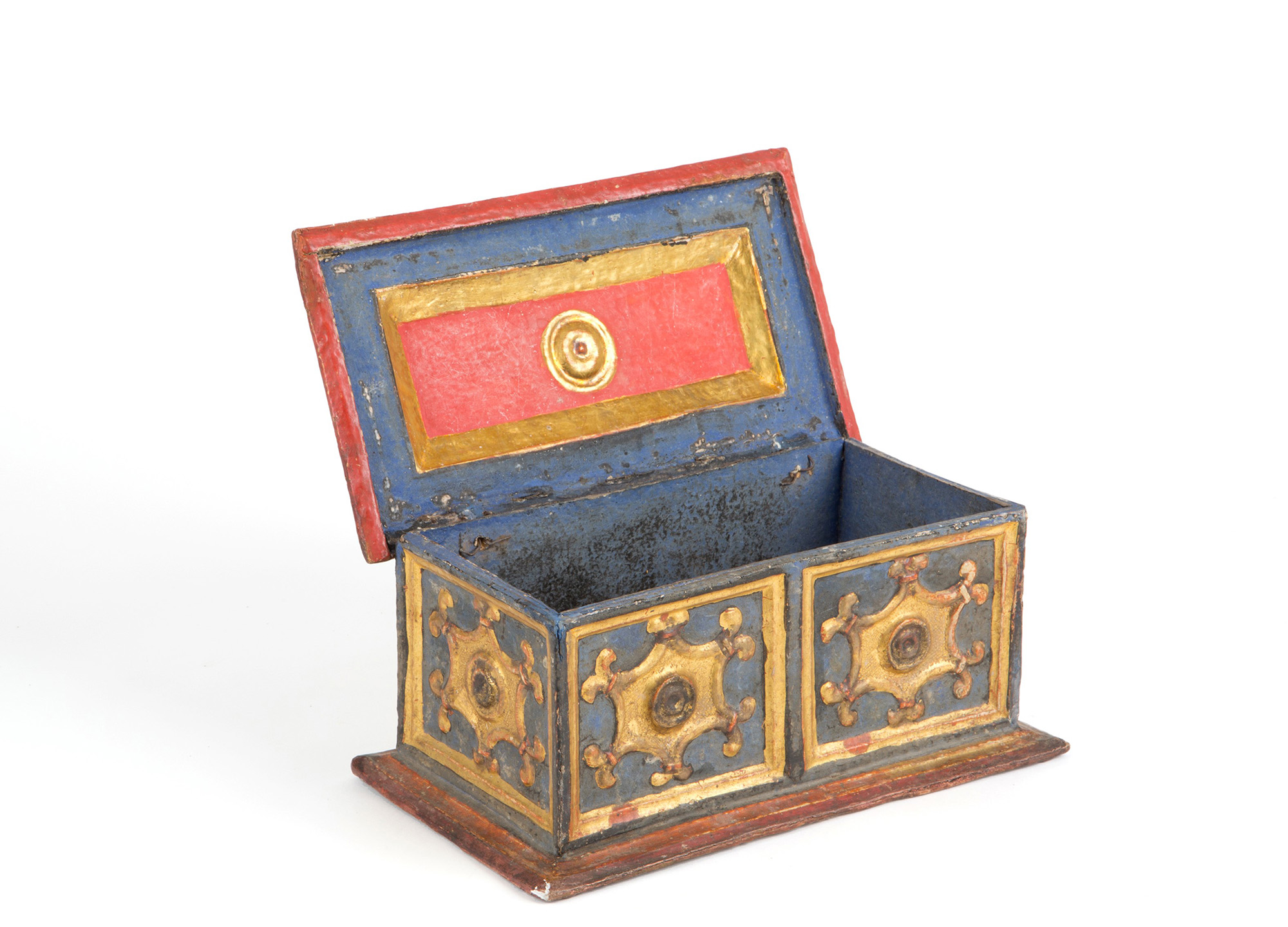 Golden paper mache casket and lacquered in blue and red. Siena. 16th century. Defects. 13x15.5x27 cm approx. Cofanetto in carta pesta dorato e laccato in azzurro e rosso. Siena. XVI secolo. Difetti. 13x15,5x27 cm ca.