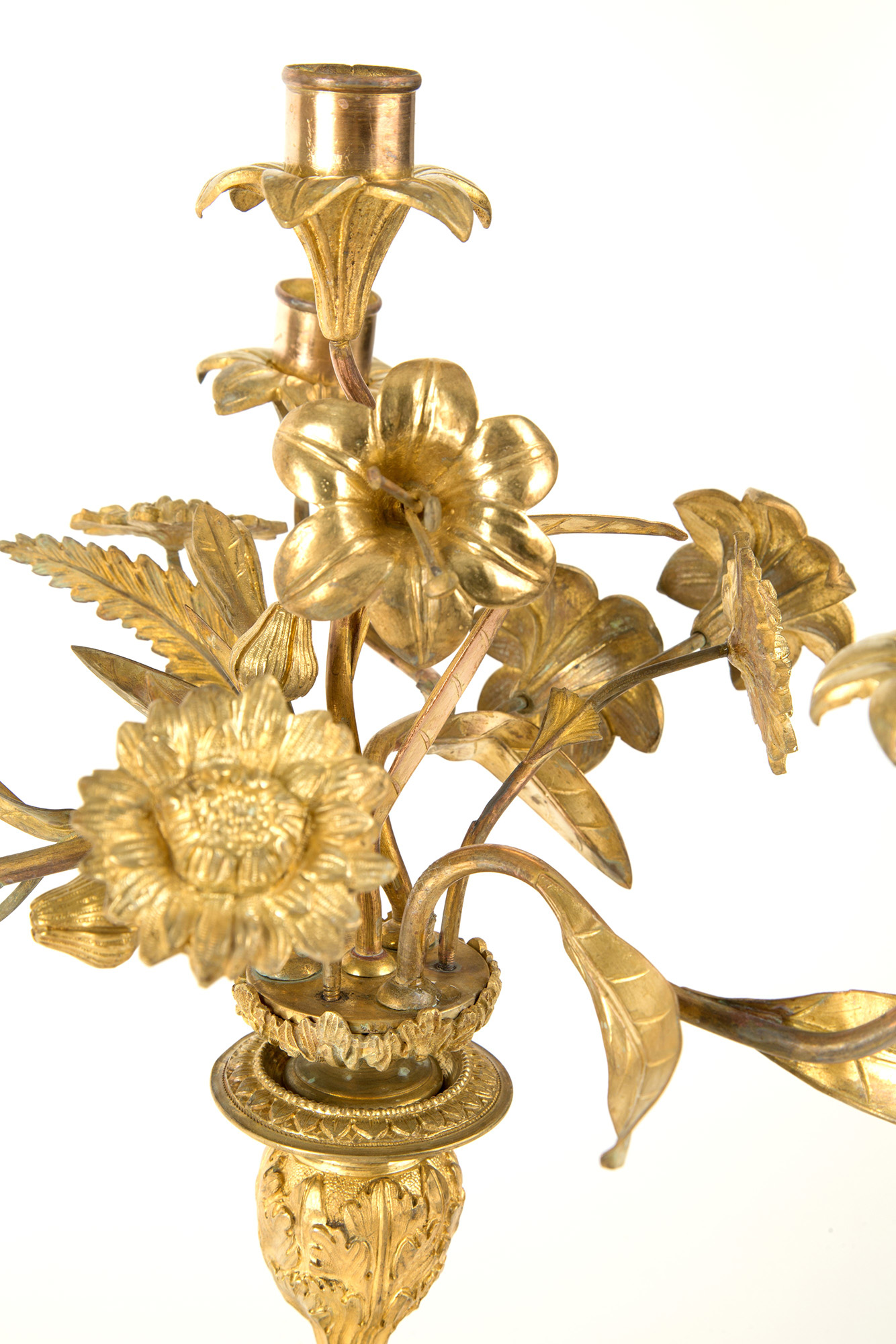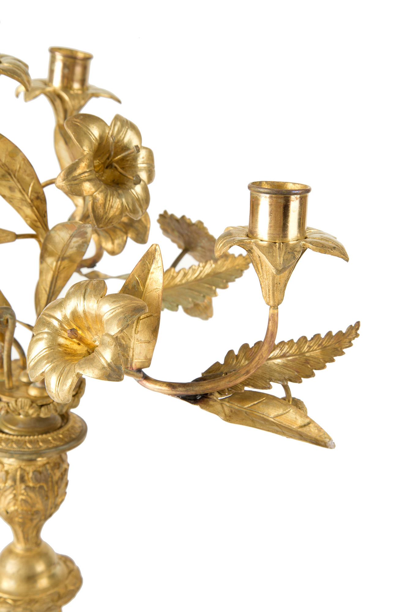 Due candelieri trasformabili in candelabri a quattro fiamme in bronzo cesellato e dorato. XIX secolo.