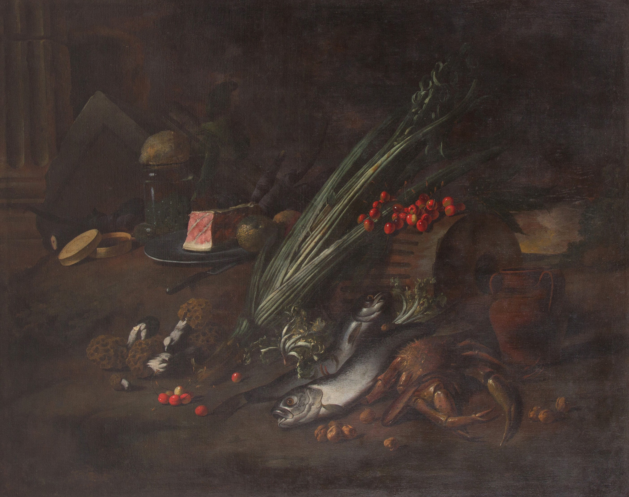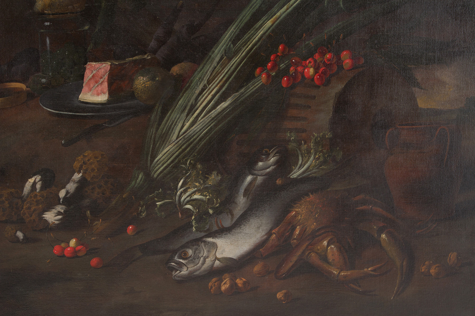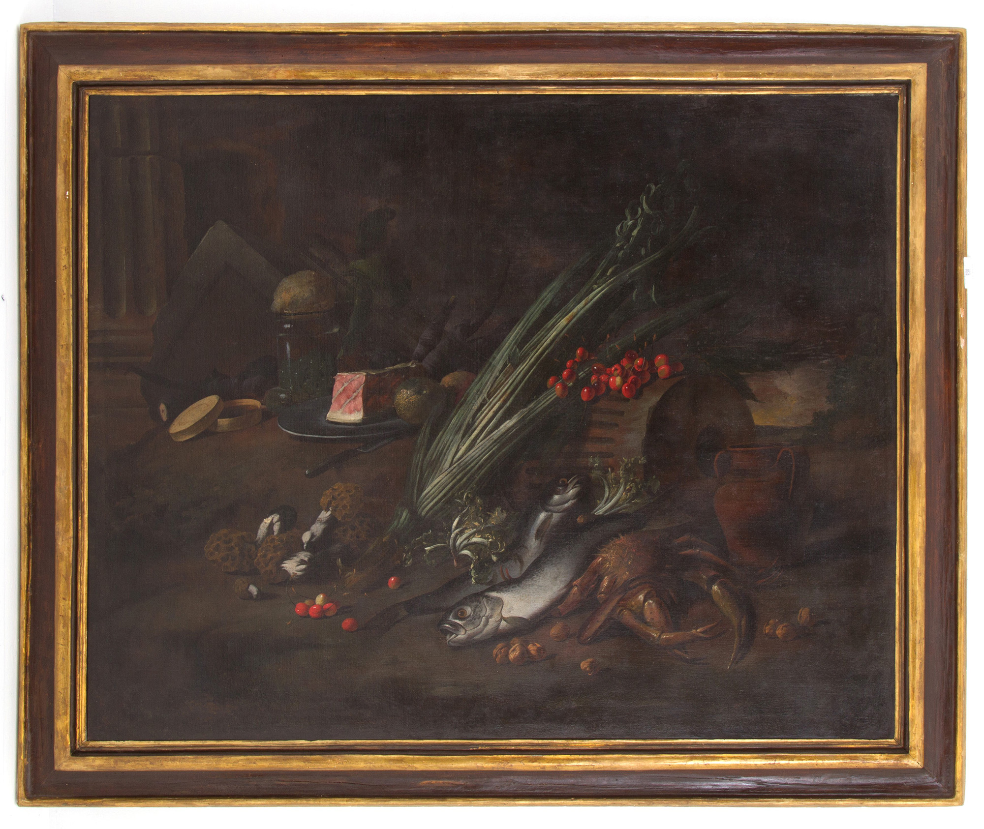 ANGELO MARIA ROSSI PSEUDO FARDELLA o PITTORE DI CARLO TORRE (Attivo a Milano tra il 1662 e il 1675). Oil painting on canvas depicting "FRUITS, VEGETABLES, MUSHROOMS, SWEETS AND FISH FAUNA IN A LANDSCAPE". In a contemporary frame. Old relining and reframing. Restorations. With expertise from Dr. Gianluca Bocchi. 118x148.40 cm approx. ANGELO MARIA ROSSI PSEUDO FARDELLA o PITTORE DI CARLO TORRE (Attivo a Milano tra il 1662 e il 1675). Dipinto olio su tela raffigurante "FRUTTI, VERDURE, FUNGHI, DOLCIUMI E FAUNA ITTICA IN UN PAESAGGIO". In cornice coeva. Vecchio rintelo e rintelaiatura. Restauri. Con perizia del Dr. Gianluca Bocchi. 118x148,40 cm ca.