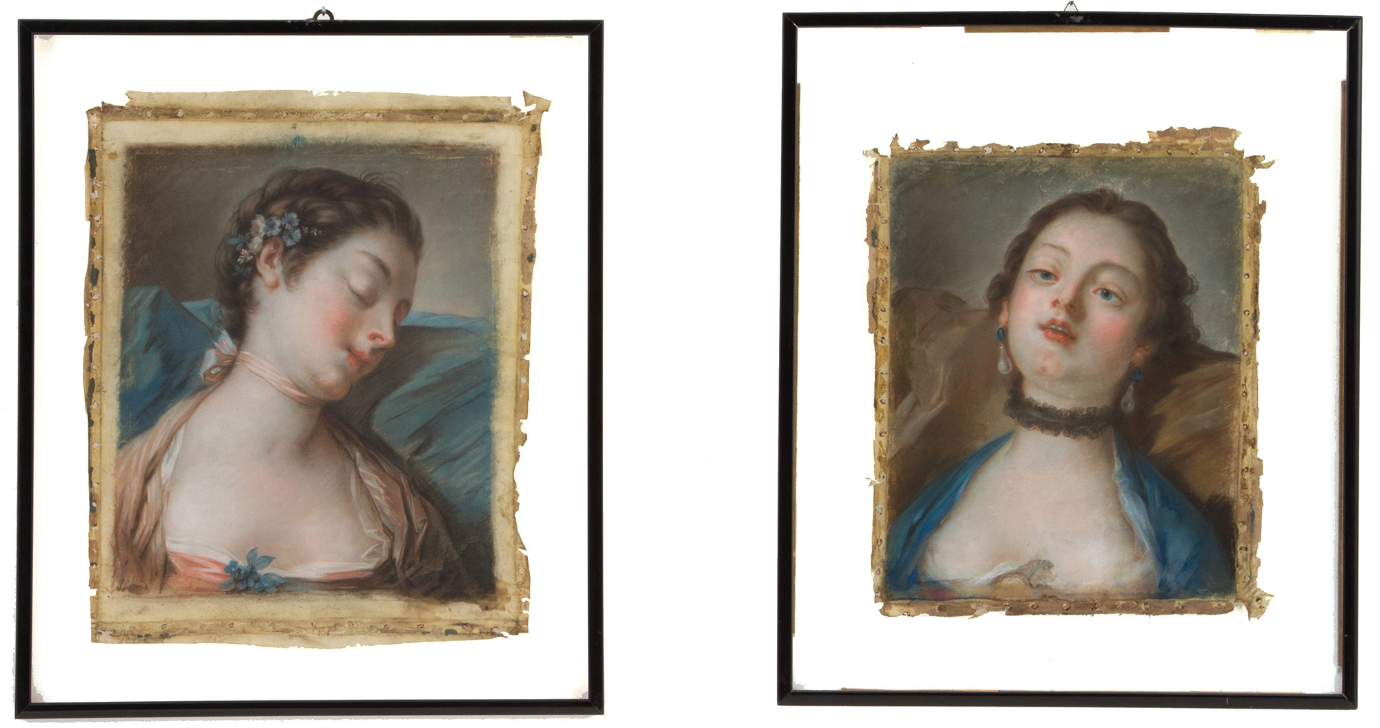 PIETRO ROTARI (Verona 1707-San Pietroburgo 1762). Pair of pastels on paper depicting "PORTRAITS OF GIRLS". Mounted on double glass. Defects. With expertise from Prof. Ferdinando Arisi. 39x48 cm approx. and 41x35 cm approx. PIETRO ROTARI (Verona 1707-San Pietroburgo 1762). Coppia di pastelli su carta raffiguranti "RITRATTI DI FANCIULLE". Montati su doppio vetro. Difetti. Con expertise del Prof. Ferdinando Arisi. 39x48 cm ca. e 41x35 cm ca.