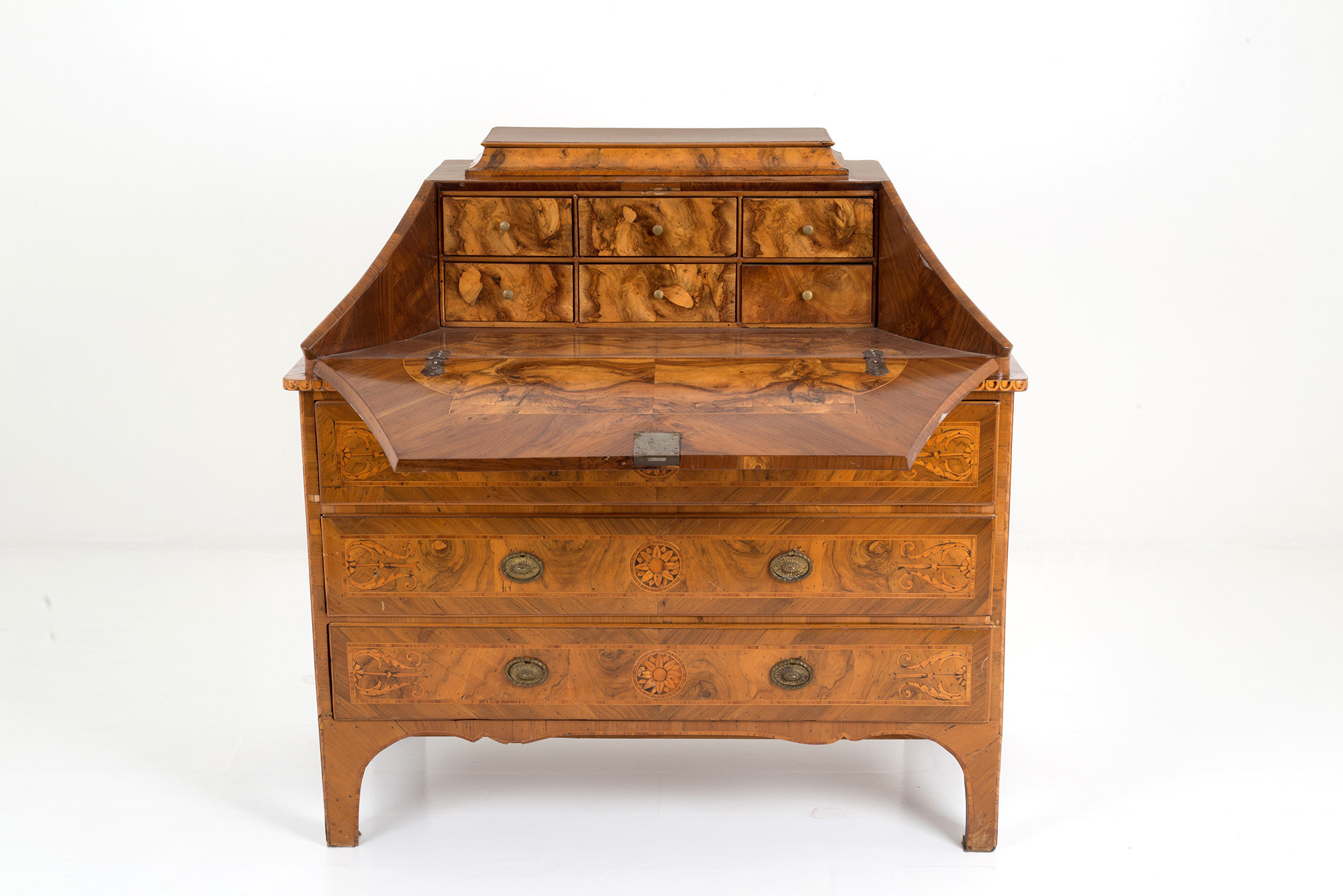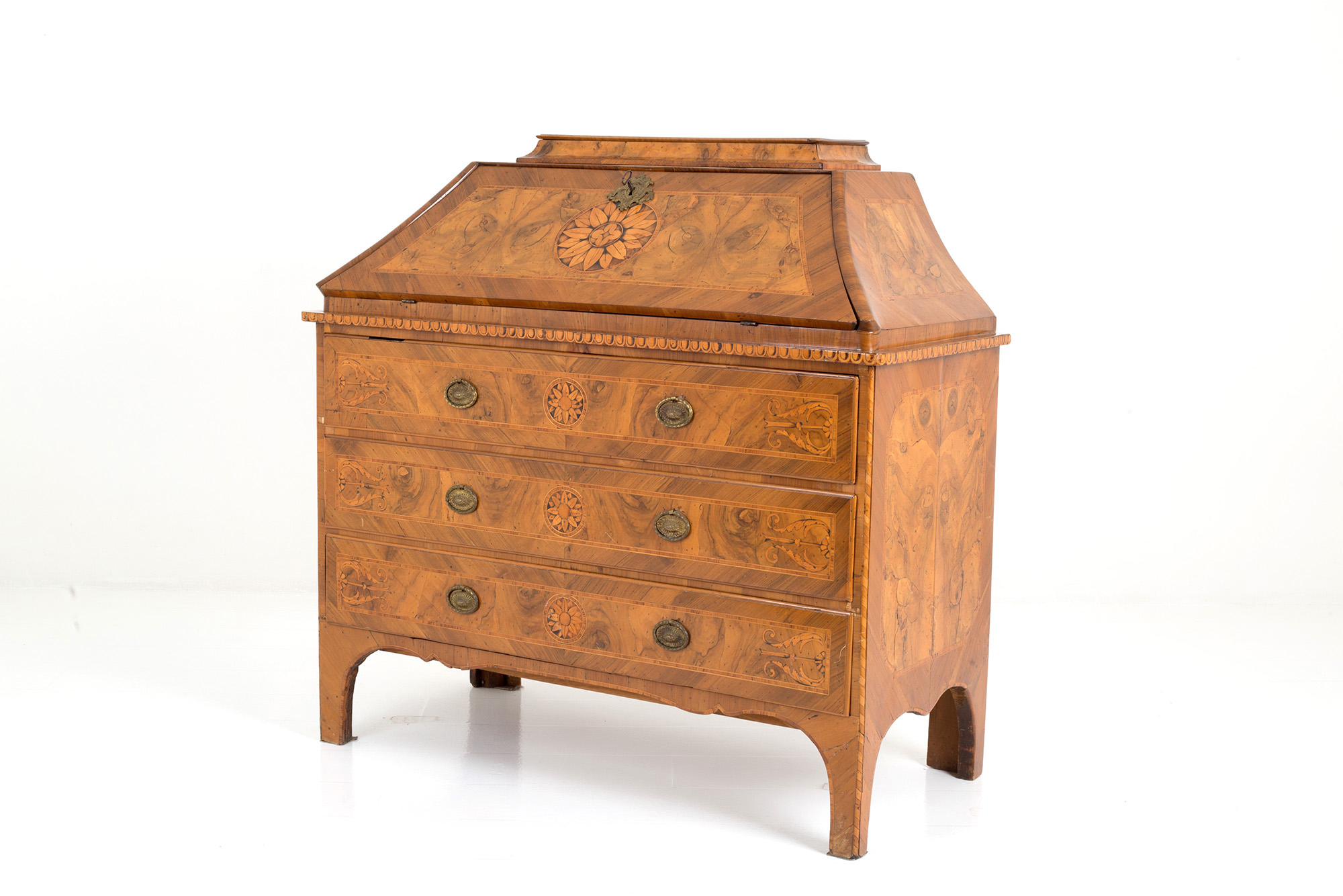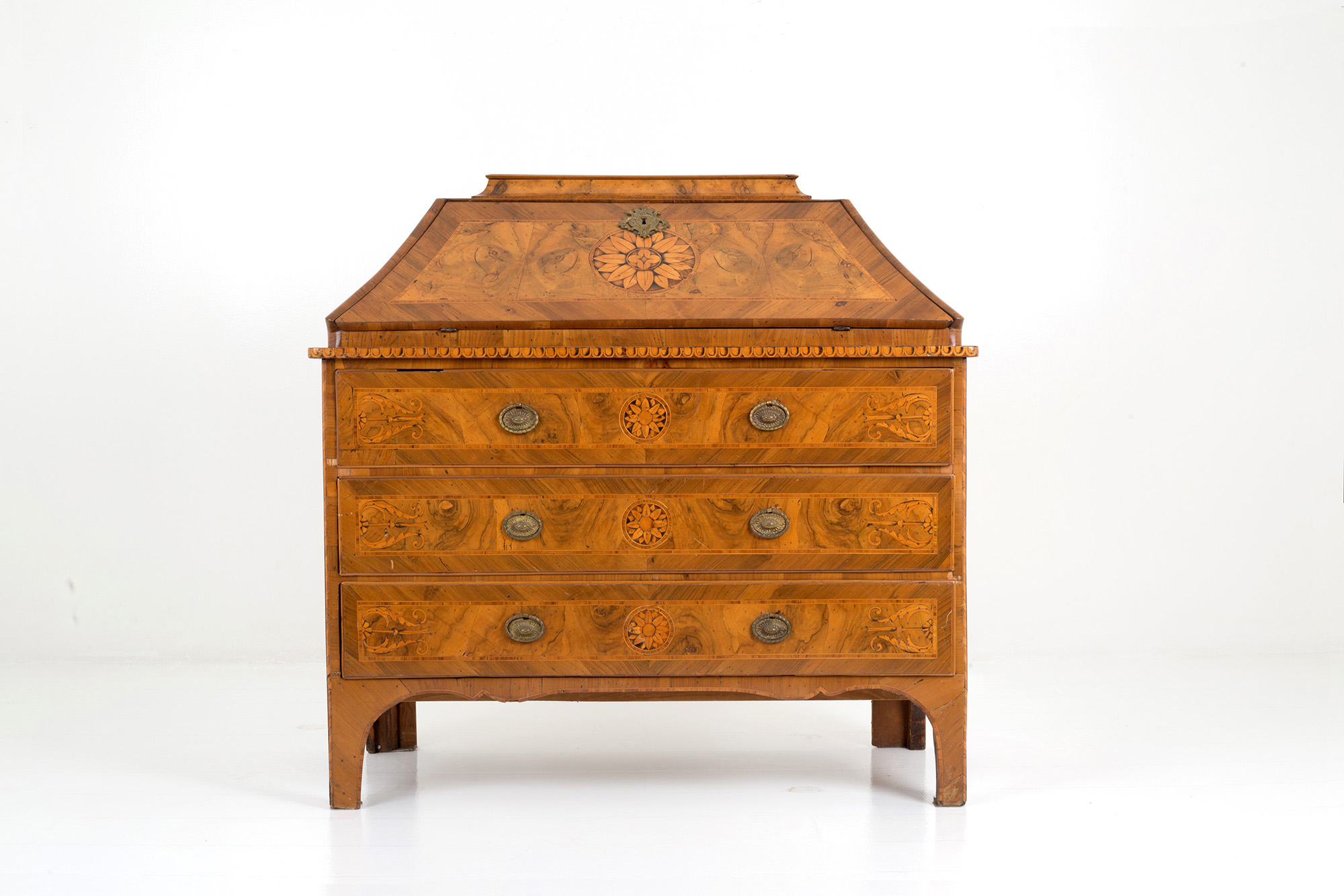 Flap inlaid in various woods with rosettes and three drawers on the front. Lombardy. Louis XVI. Small defects and shortcomings. 121x12458 cm approx. Ribalta intarsiata in legni vari a rosoni e tre cassetti sul fronte. Lombardia. Luigi XVI. Piccoli difetti e mancanze. 121x12458 cm ca.