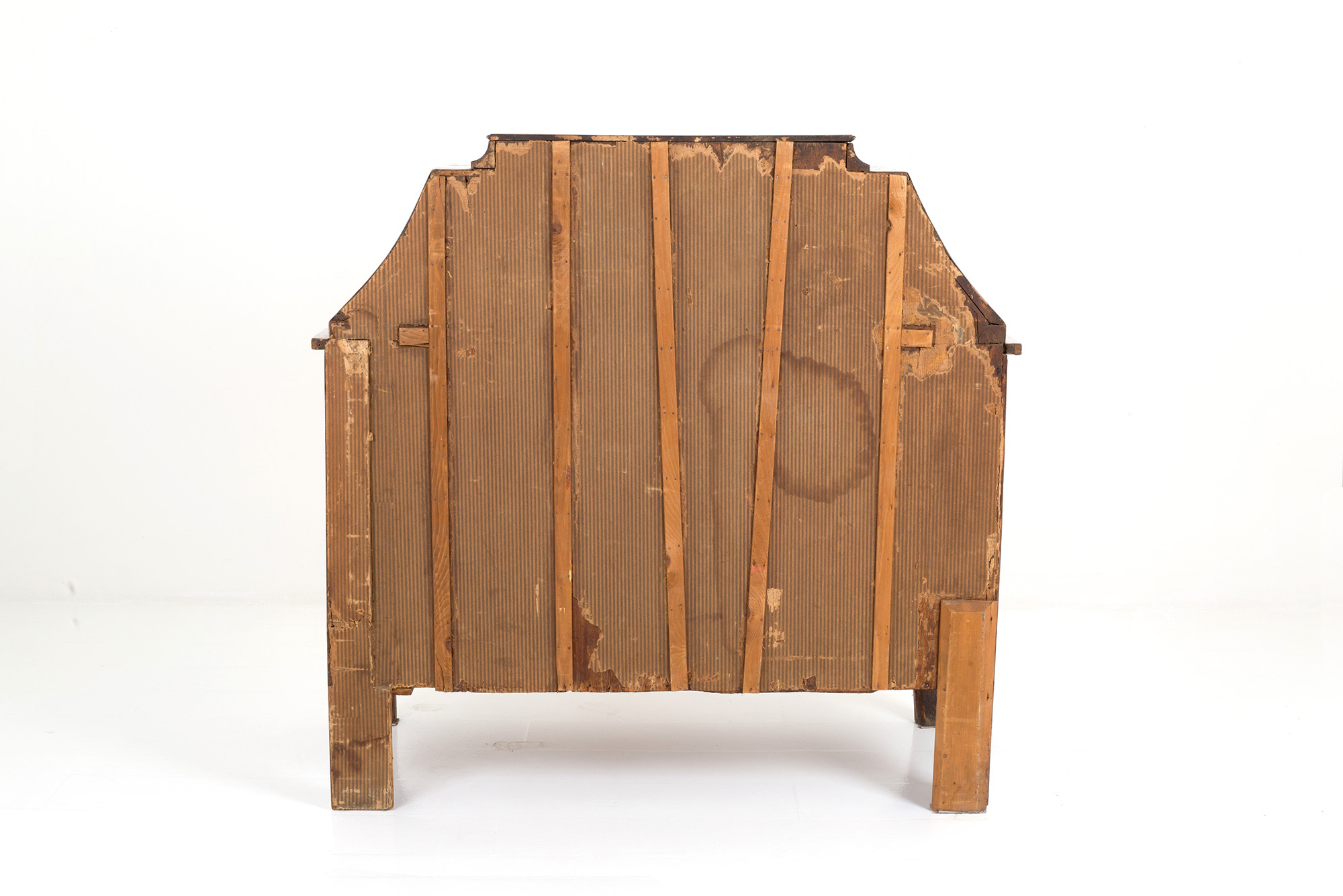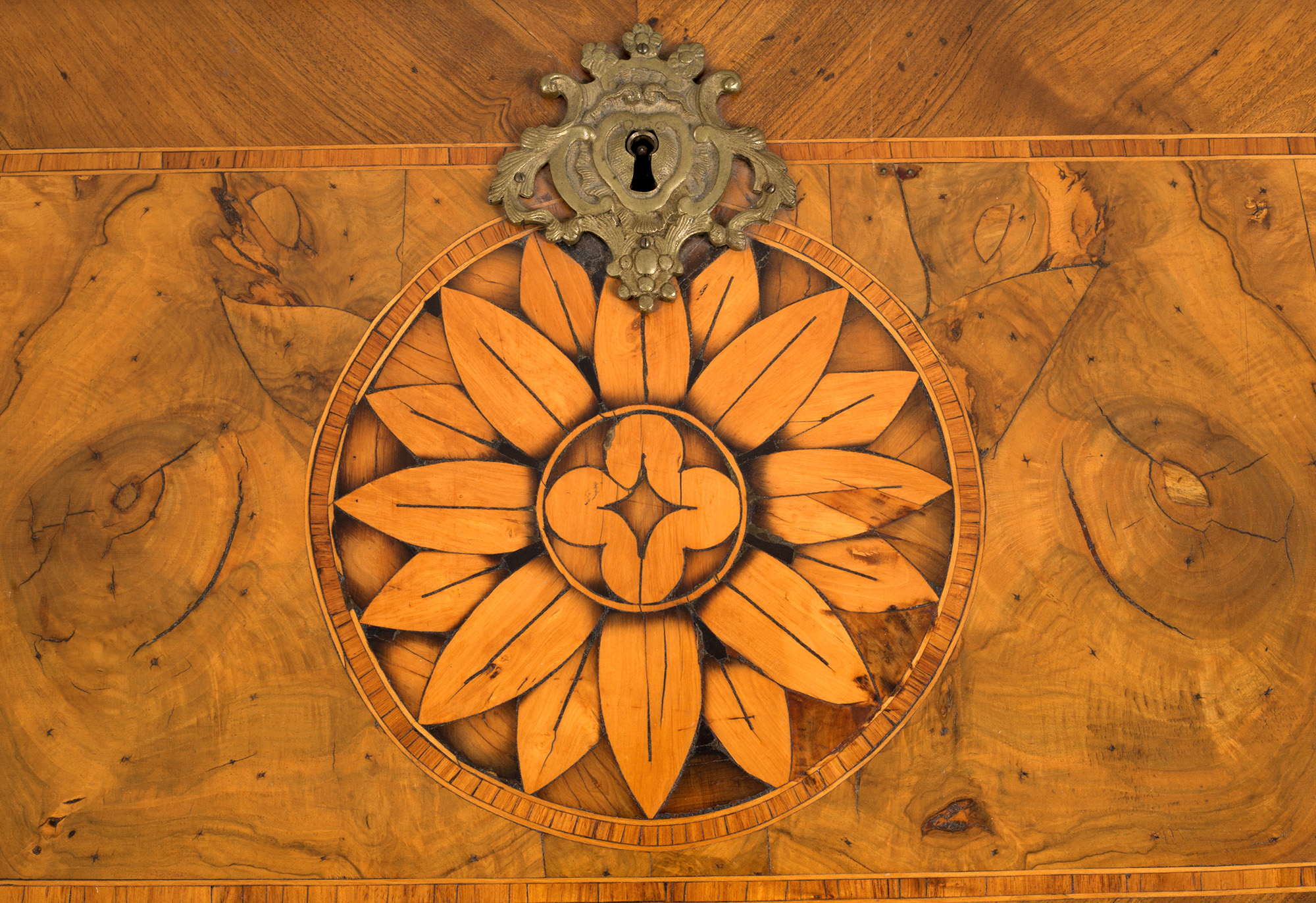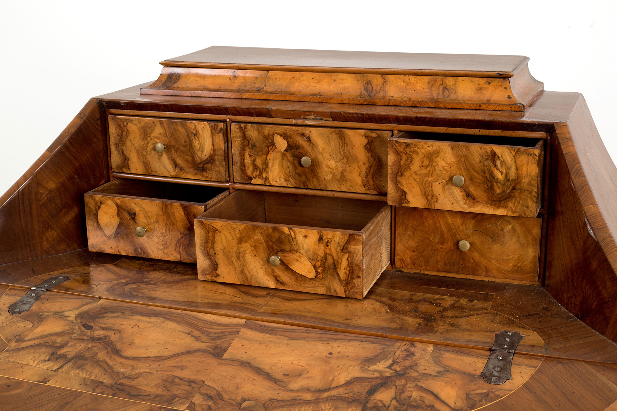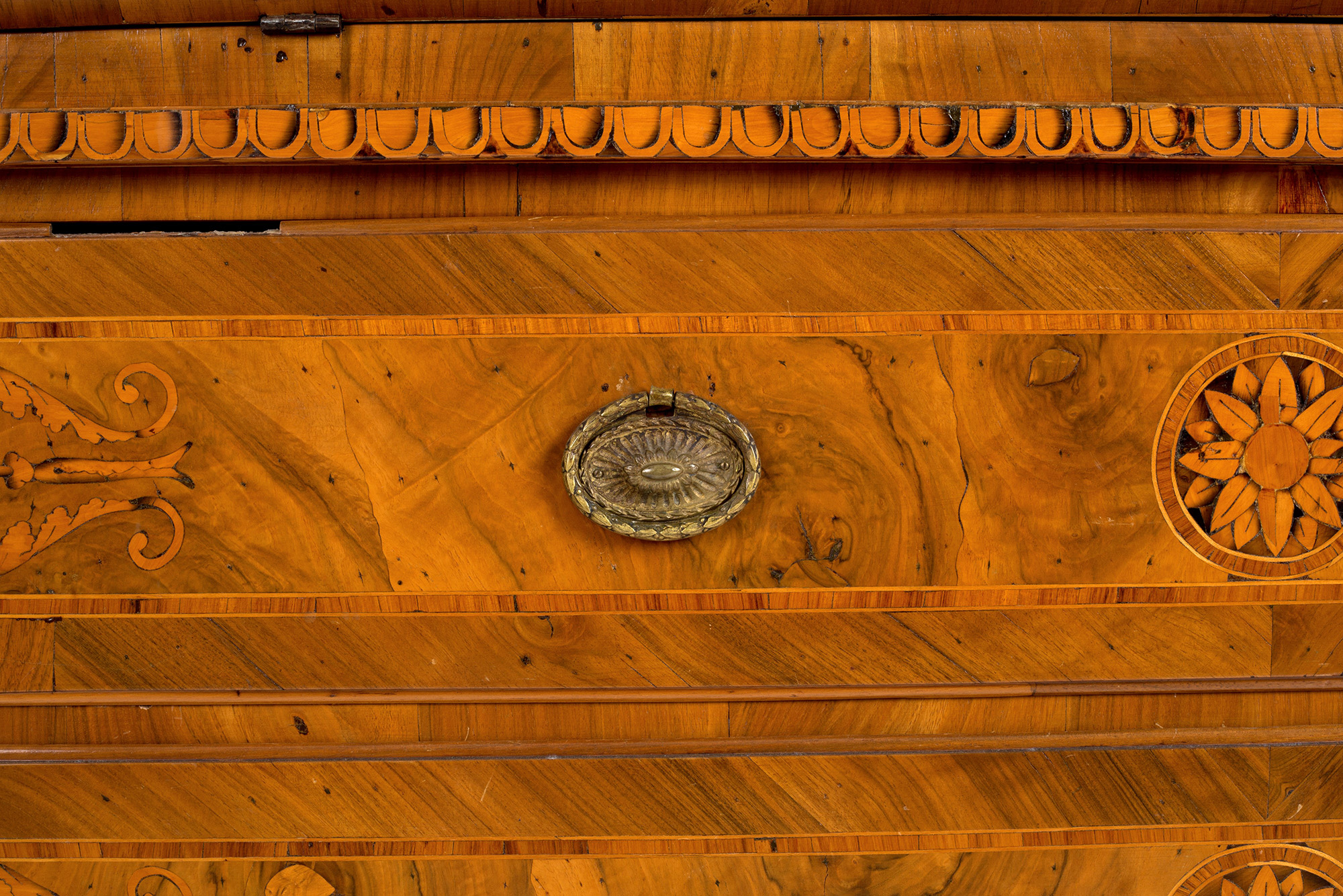 Flap inlaid in various woods with rosettes and three drawers on the front. Lombardy. Louis XVI. Small defects and shortcomings. 121x12458 cm approx. Ribalta intarsiata in legni vari a rosoni e tre cassetti sul fronte. Lombardia. Luigi XVI. Piccoli difetti e mancanze. 121x12458 cm ca.