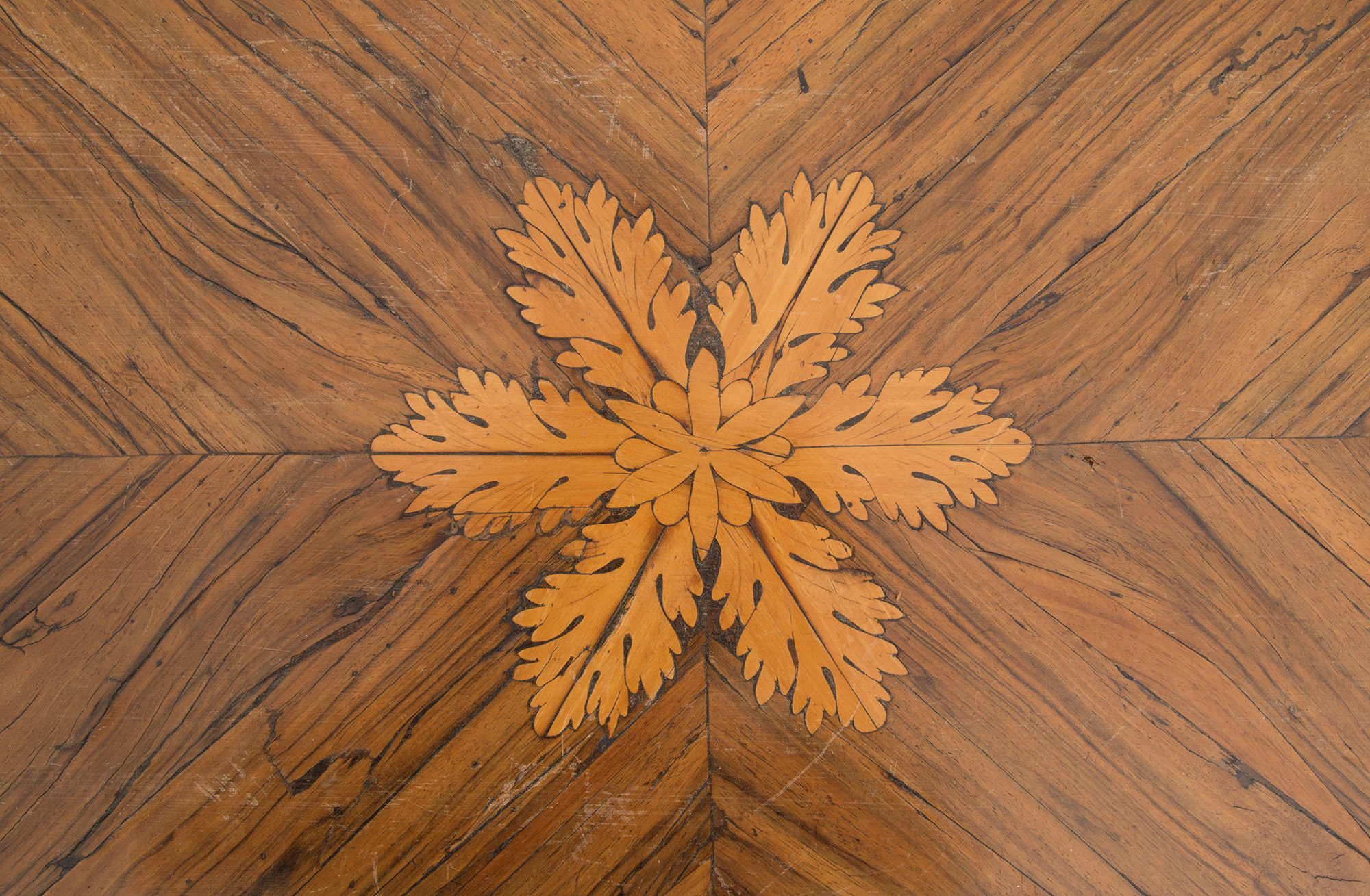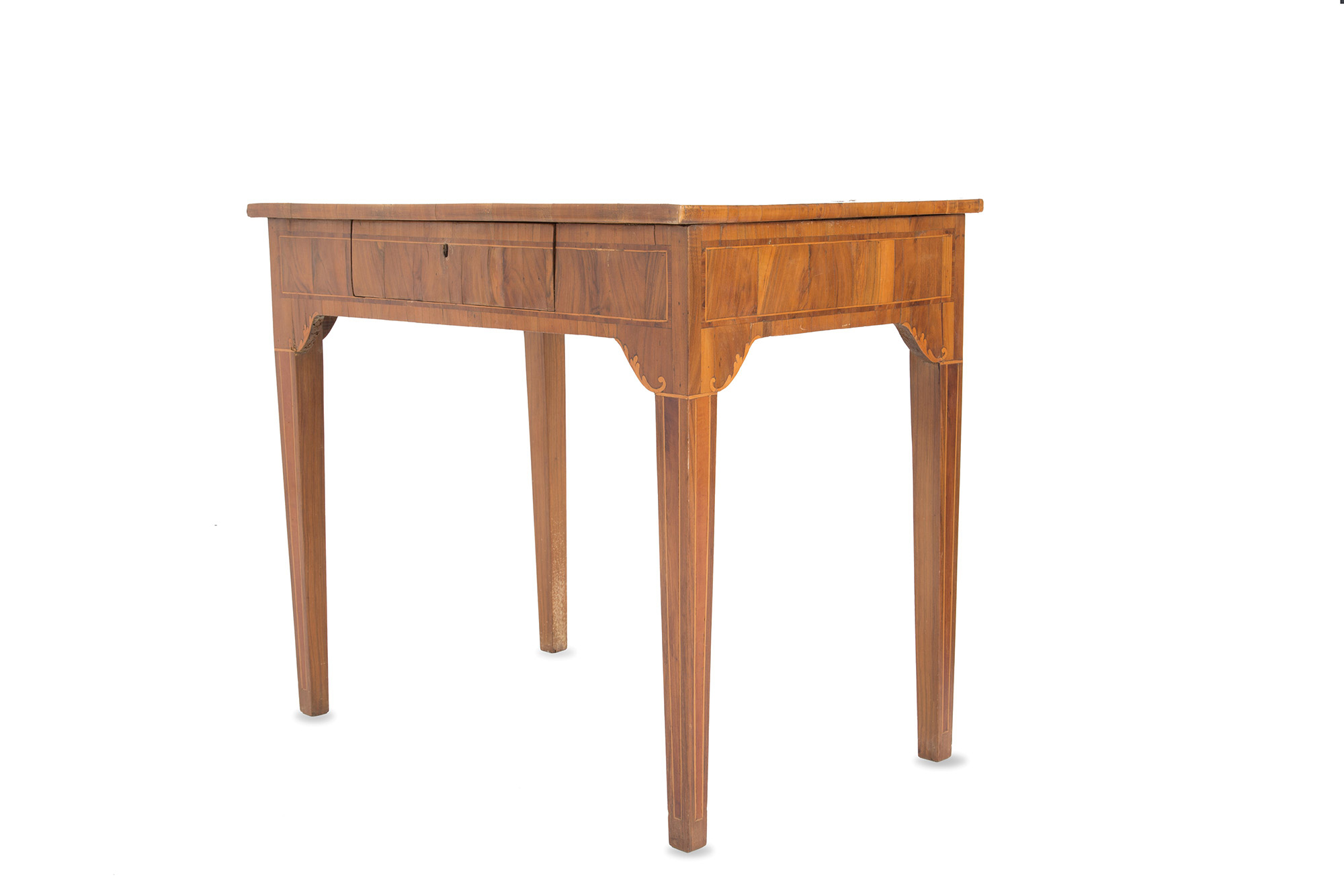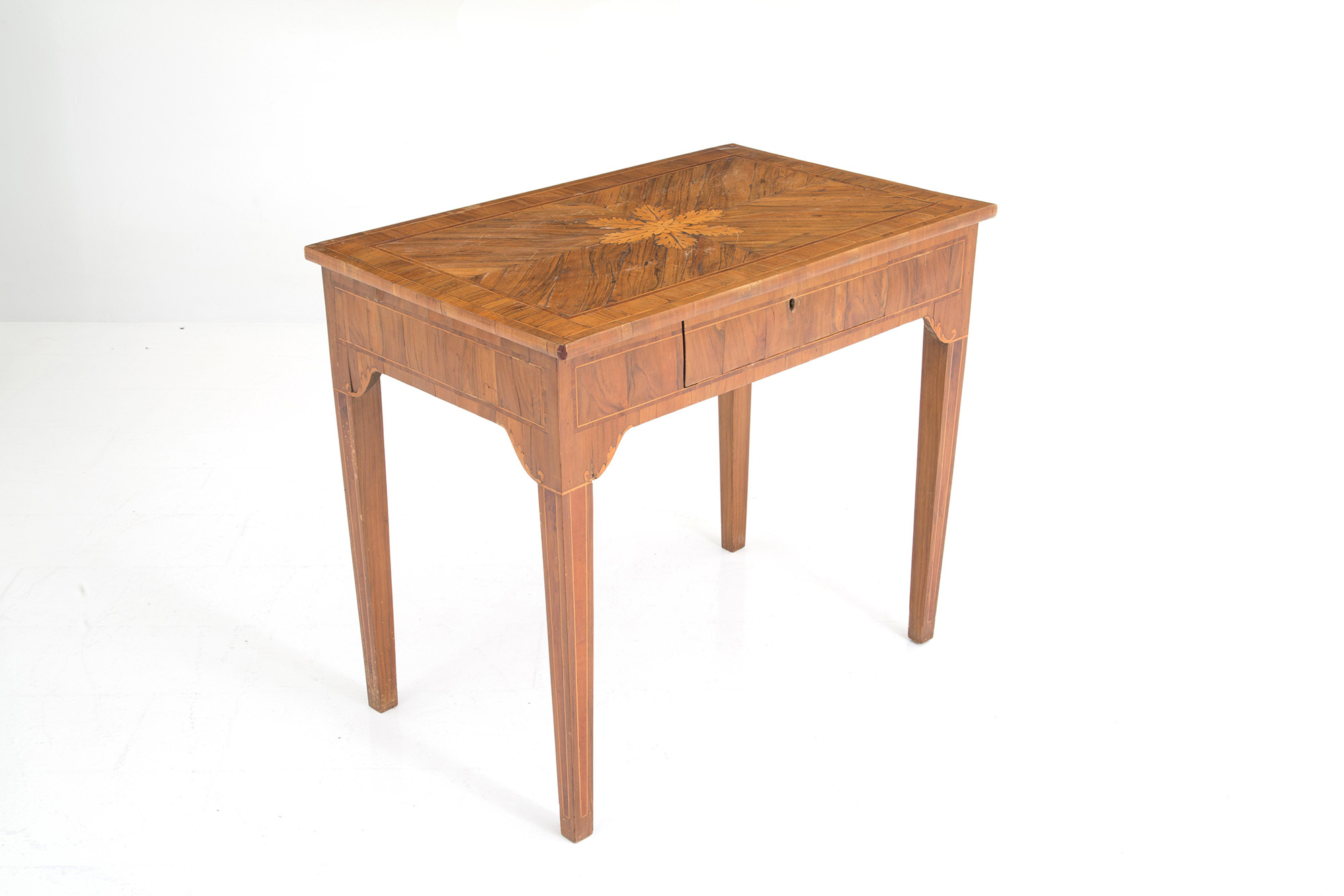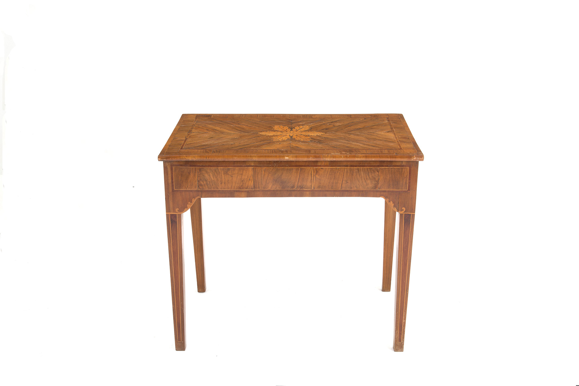 Veneered coffee table in various woods with rosette in the center of the top and tapered legs. Lombardy. Late 18th century. 68x78x50 cm approx. Tavolino lastronato in legni vari con rosone al centro del piano e gambe rastremate. Lombardia. Fine XVIII secolo. 68x78x50 cm ca.