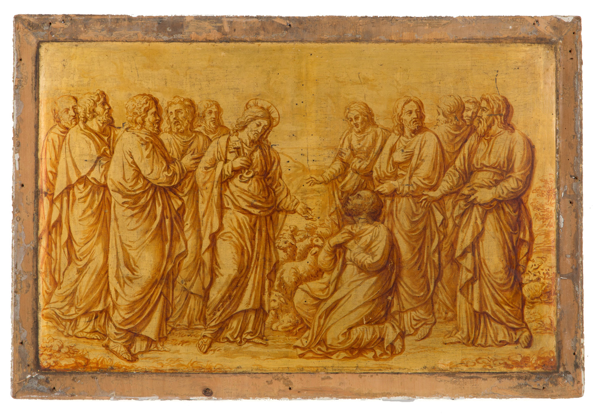 Oil painting on panel depicting "CHRIST WITH APOSTLES". 19th century. Defects. 49.5x72 cm approx. Dipinto olio su tavola raffigurante "CRISTO CON APOSTOLI". XIX secolo. Difetti. 49,5x72 cm ca.