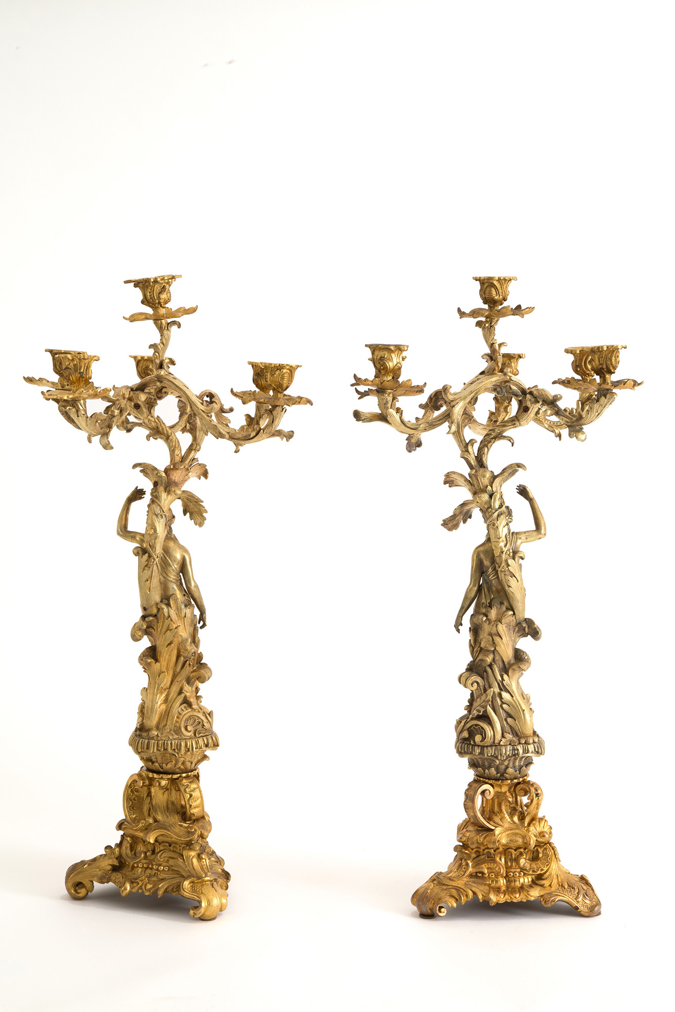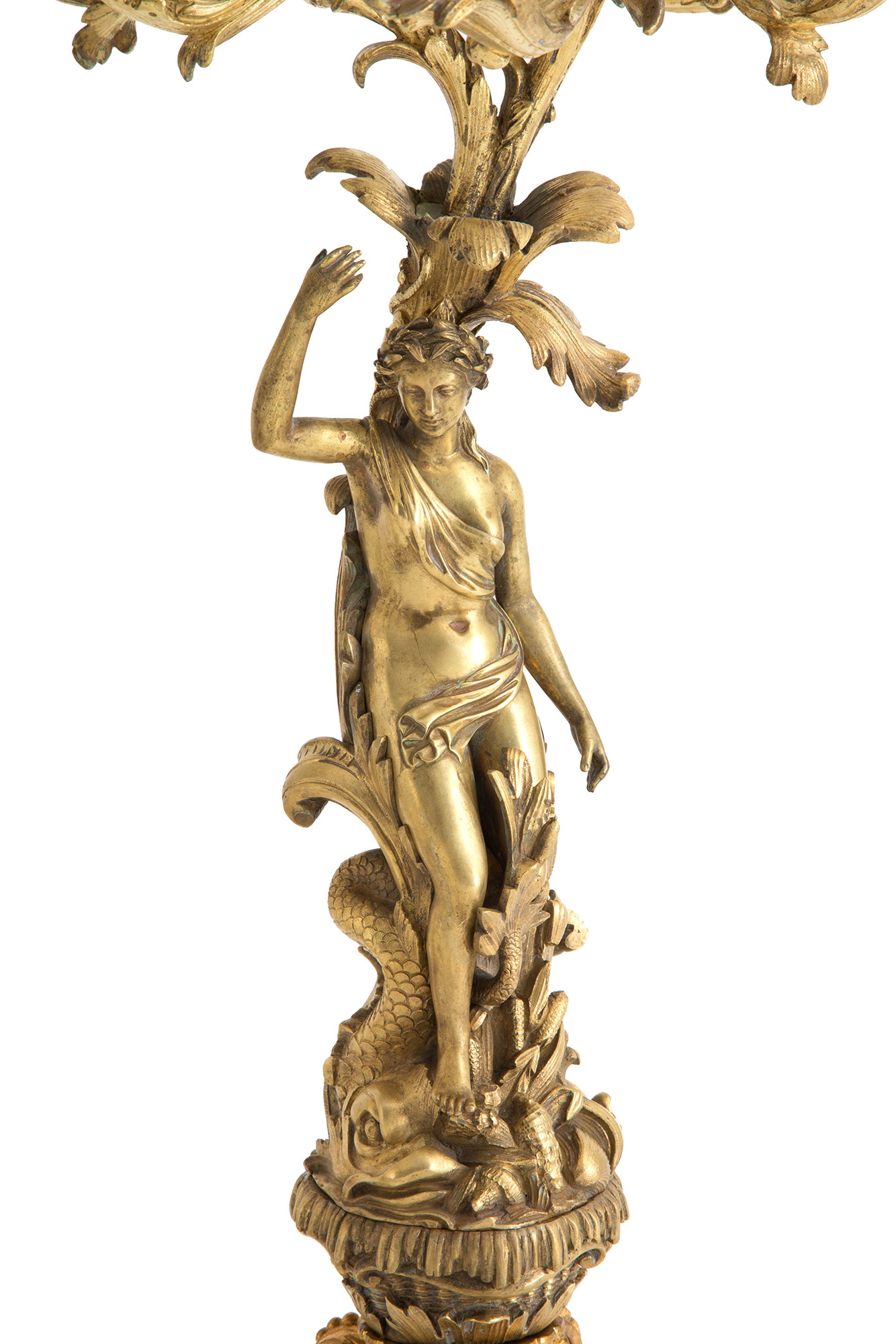 Pair of six-flame candelabra in chiseled bronze with statues depicting Venus. France. Late 18th-early 19th century. 70x35x30 cm approx. Coppia di candelabri sei fiamme in bronzo cesellato con statue raffiguranti Venere. Francia. Fine XVIII-inizi XIX secolo. 70x35x30 cm ca.