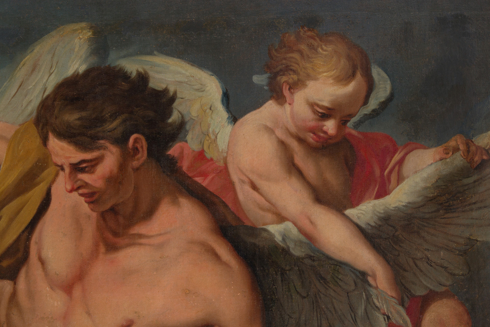 LOMBARDO-VENETO SCHOOL OF THE FIRST HALF OF THE 18TH CENTURY. Oil painting on canvas depicting "ALLEGORY OF THE ZODIAC SIGNS". In frame. Already relined and reframed. Restorations. 94x165.5 cm approx. SCUOLA LOMBARDO VENETO DELLA PRIMA META' DEL XVIII SECOLO. Dipinto olio su tela raffigurante "ALLEGORIA DEI SEGNI ZODIACALI". In cornice. Gia' rintelato e rintelaiato. Restauri. 94x165,5 cm ca.