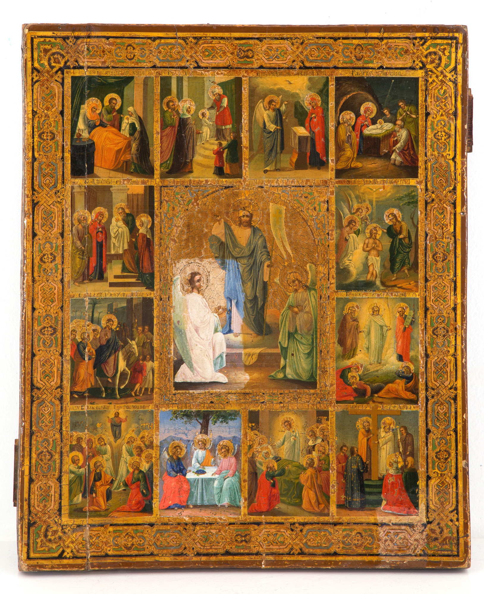 Icon on panel depicting "RESURRECTION WITH TWO ANGELS AND GOSPEL STORIES". Eastern Europe. Nineteenth century. Defects and restorations. 54x44cm approx. Icona su tavola raffigurante "RESURREZIONE CON DUE ANGELI E STORIE DEL VANGELO". Est Europa. XIX secolo. Difetti e restauri. 54x44 cm ca.