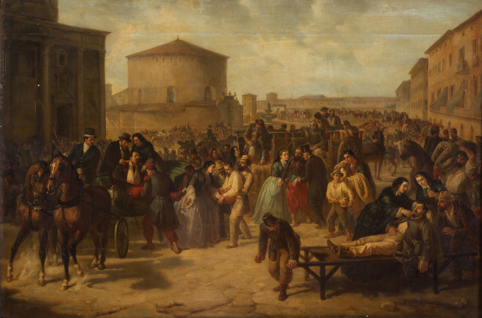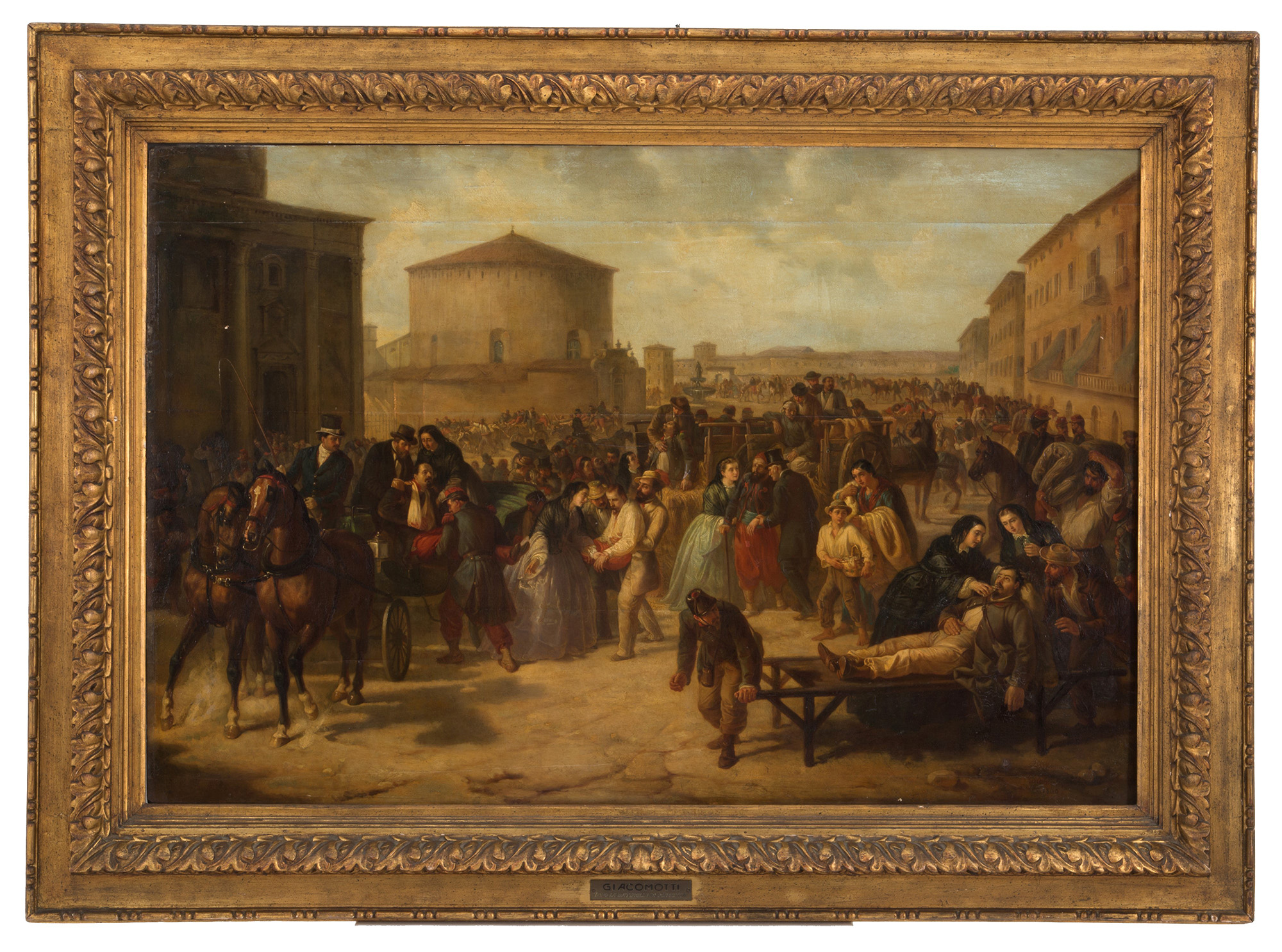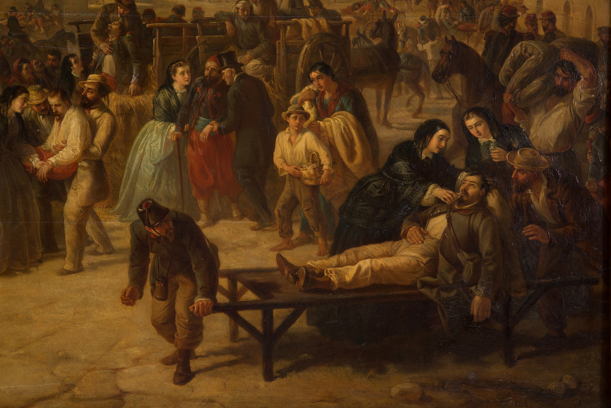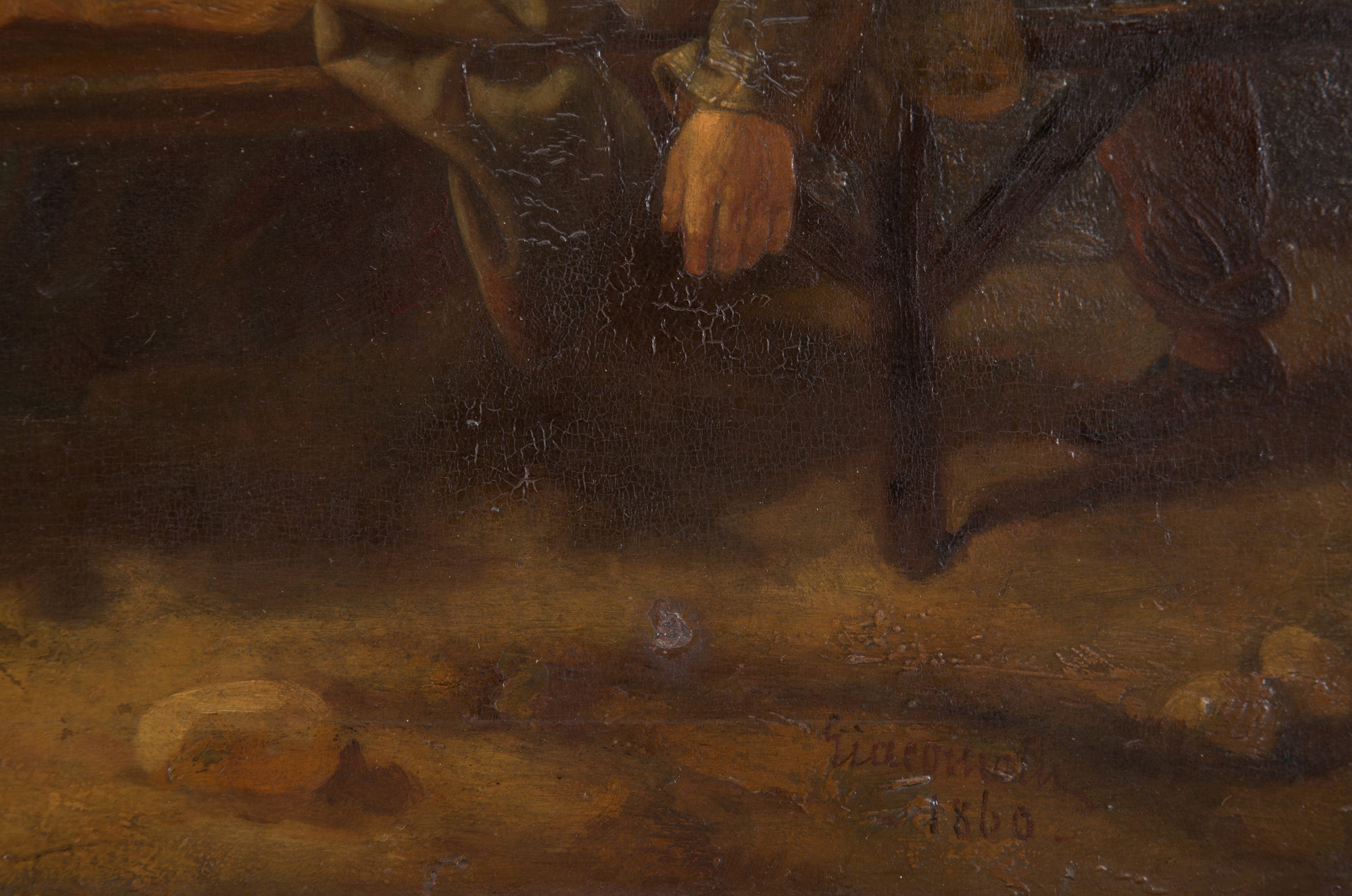 FELIX HENRI GIACOMOTTI (Quingey 1828-Besancon 1909). Oil painting on a scaffolded panel depicting "AFTER THE BATTLE OF MAGENTA". Signed and dated 1860 lower right. In frame. Slight defects.  78x120 cm approx. FELIX HENRI GIACOMOTTI (Quingey 1828-Besancon 1909). Dipinto olio su tavola impalchettata raffigurante "DOPO LA BATTAGLIA DI MAGENTA". Firmato e datato 1860 in basso a destra. In cornice. Lievi difetti.  78x120 cm ca.