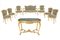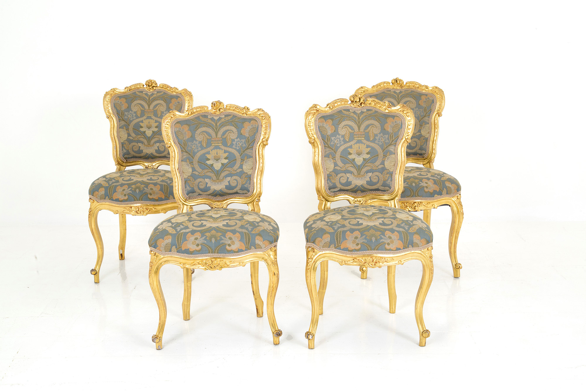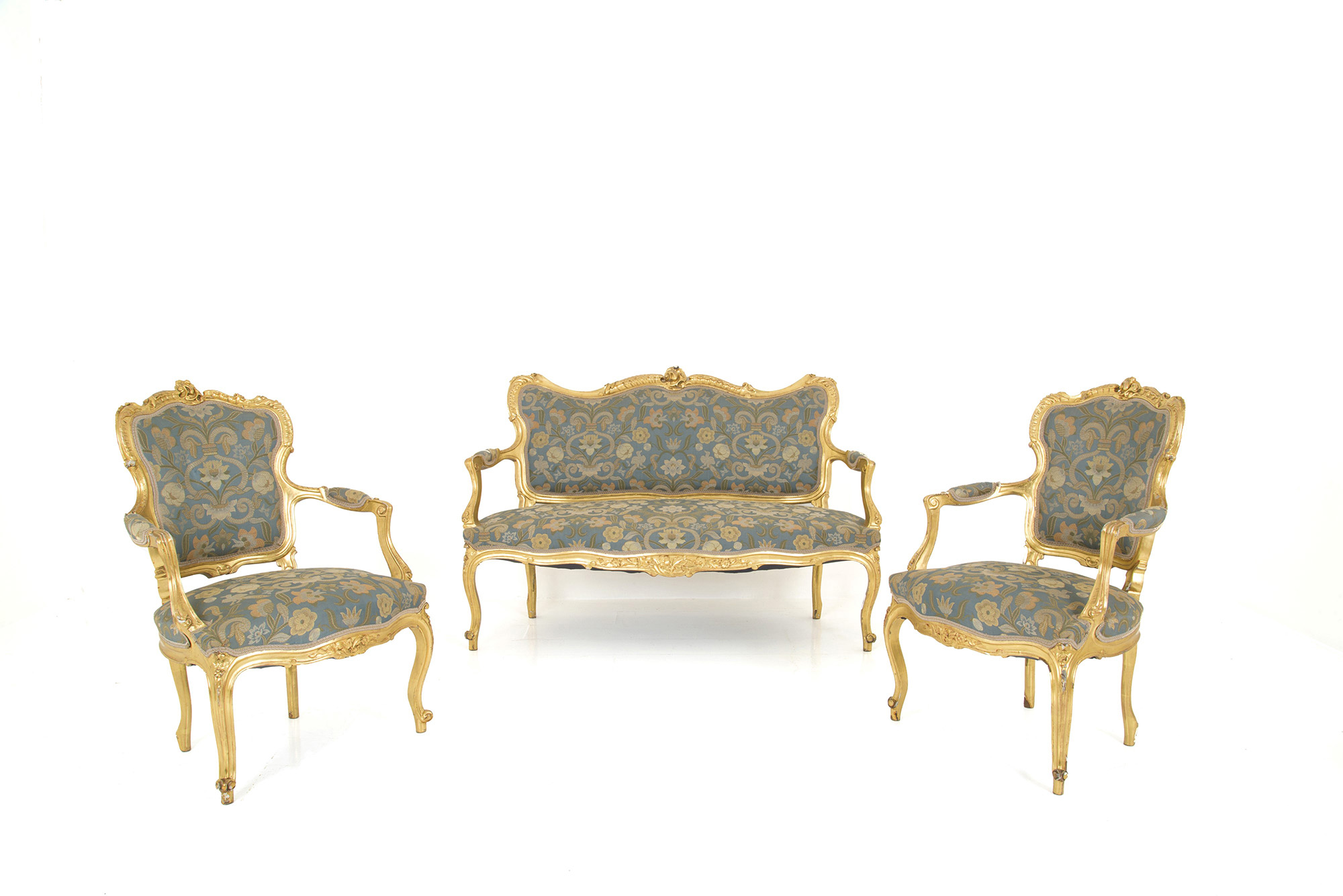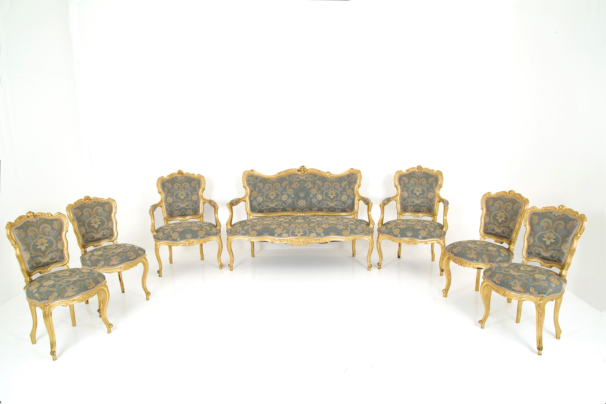 Living room in carved and gilded wood, composed of a two-seater sofa, two armchairs, a center table and four chairs. Late 19th century. Slight defects on the gilding. Salotto in legno intagliato e dorato, composto da un divanetto a due posti, due poltrone, un tavolo da centro e quattro sedie. Fine XIX secolo. Lievi difetti alla doratura.