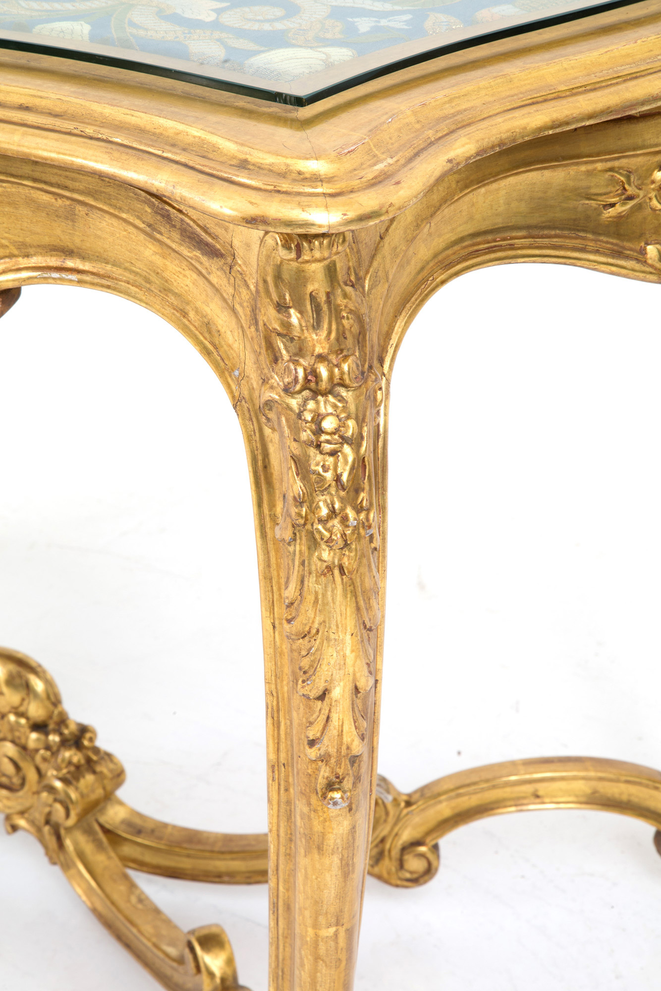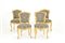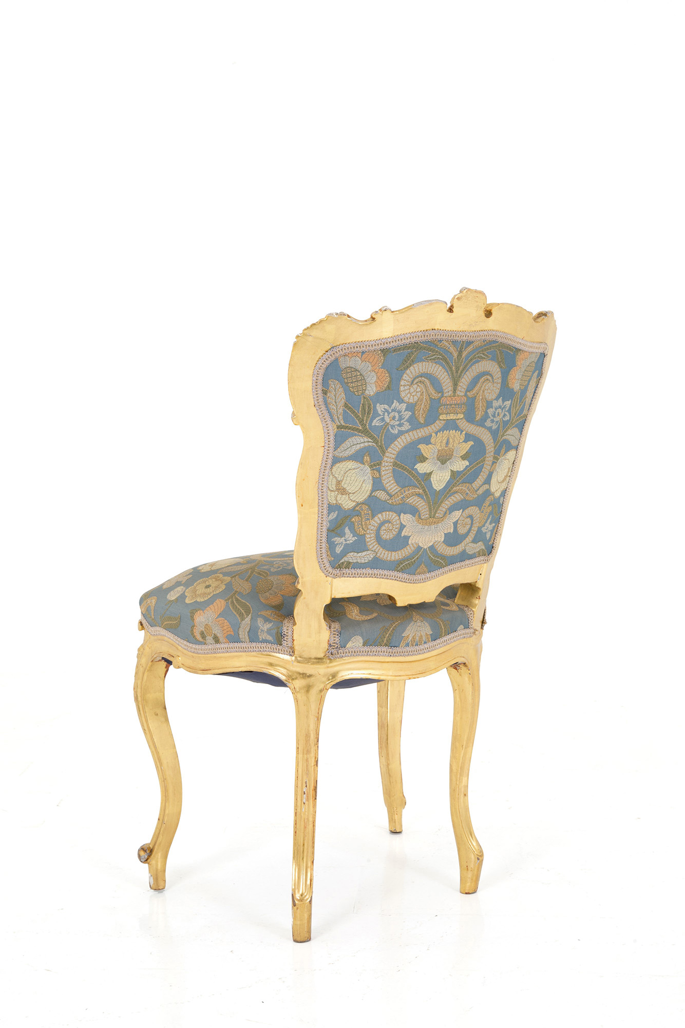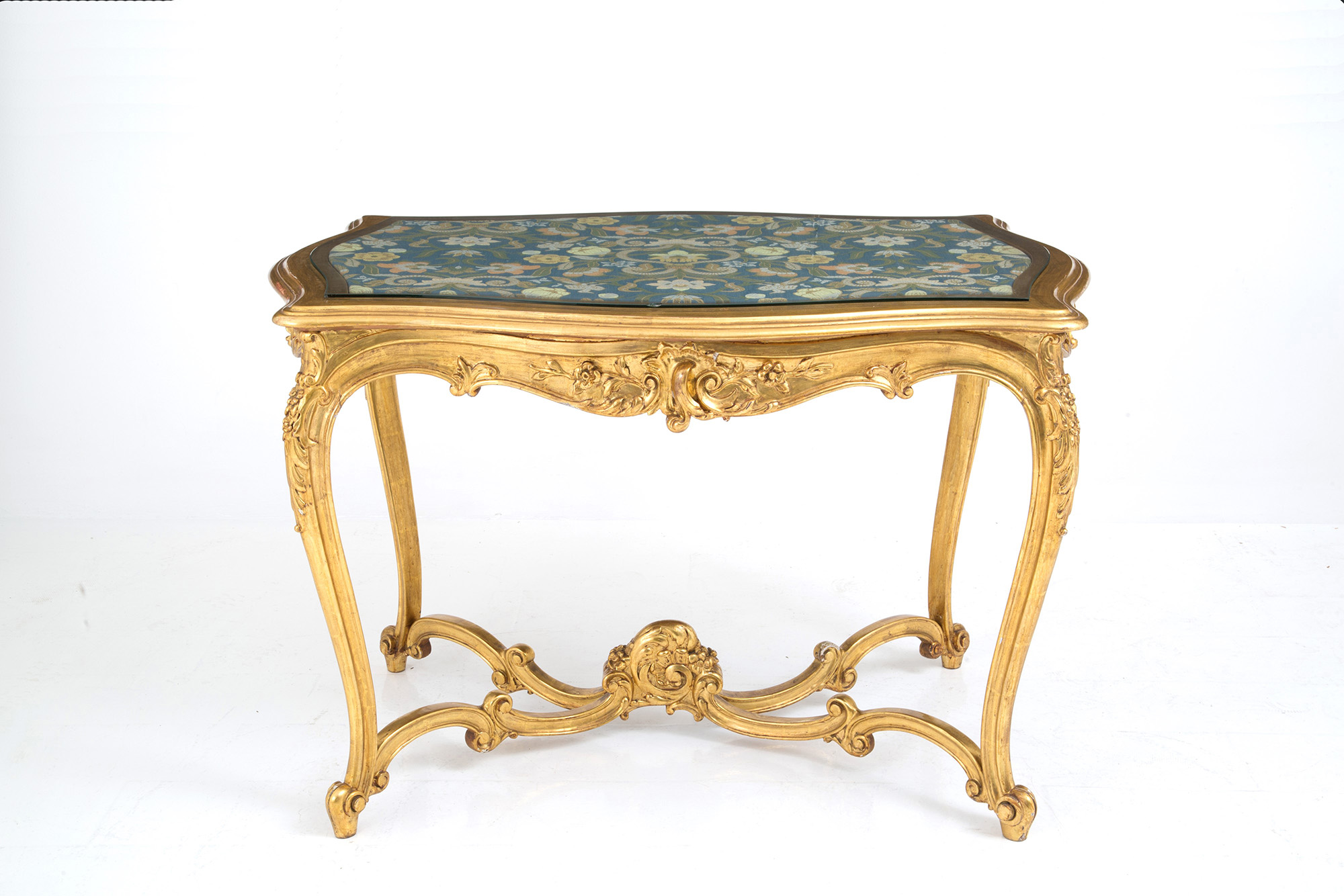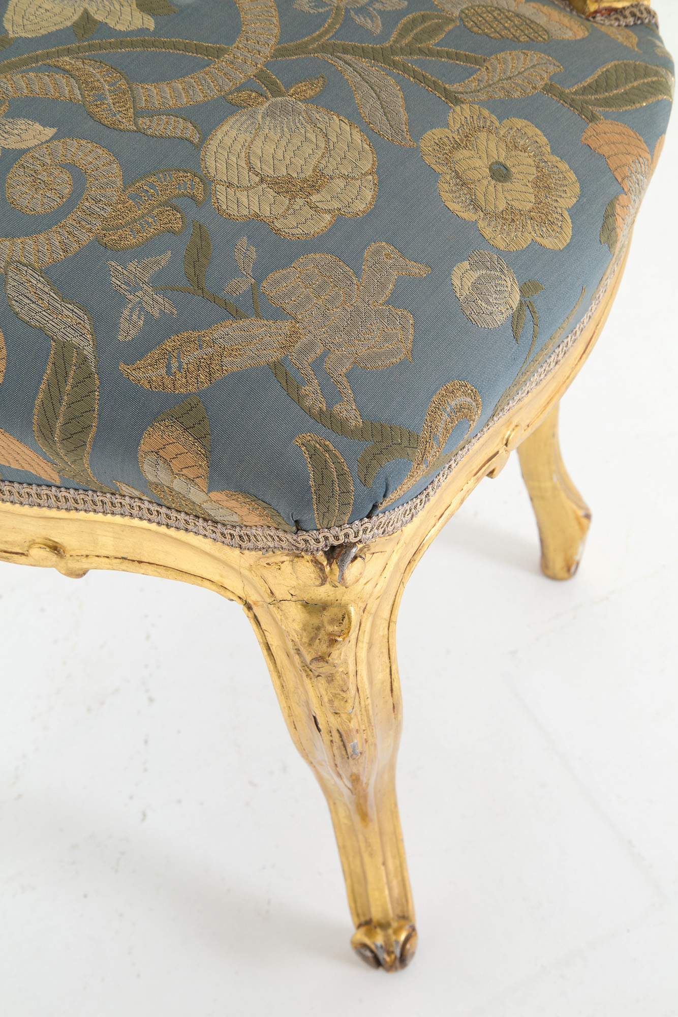 Living room in carved and gilded wood, composed of a two-seater sofa, two armchairs, a center table and four chairs. Late 19th century. Slight defects on the gilding. Salotto in legno intagliato e dorato, composto da un divanetto a due posti, due poltrone, un tavolo da centro e quattro sedie. Fine XIX secolo. Lievi difetti alla doratura.