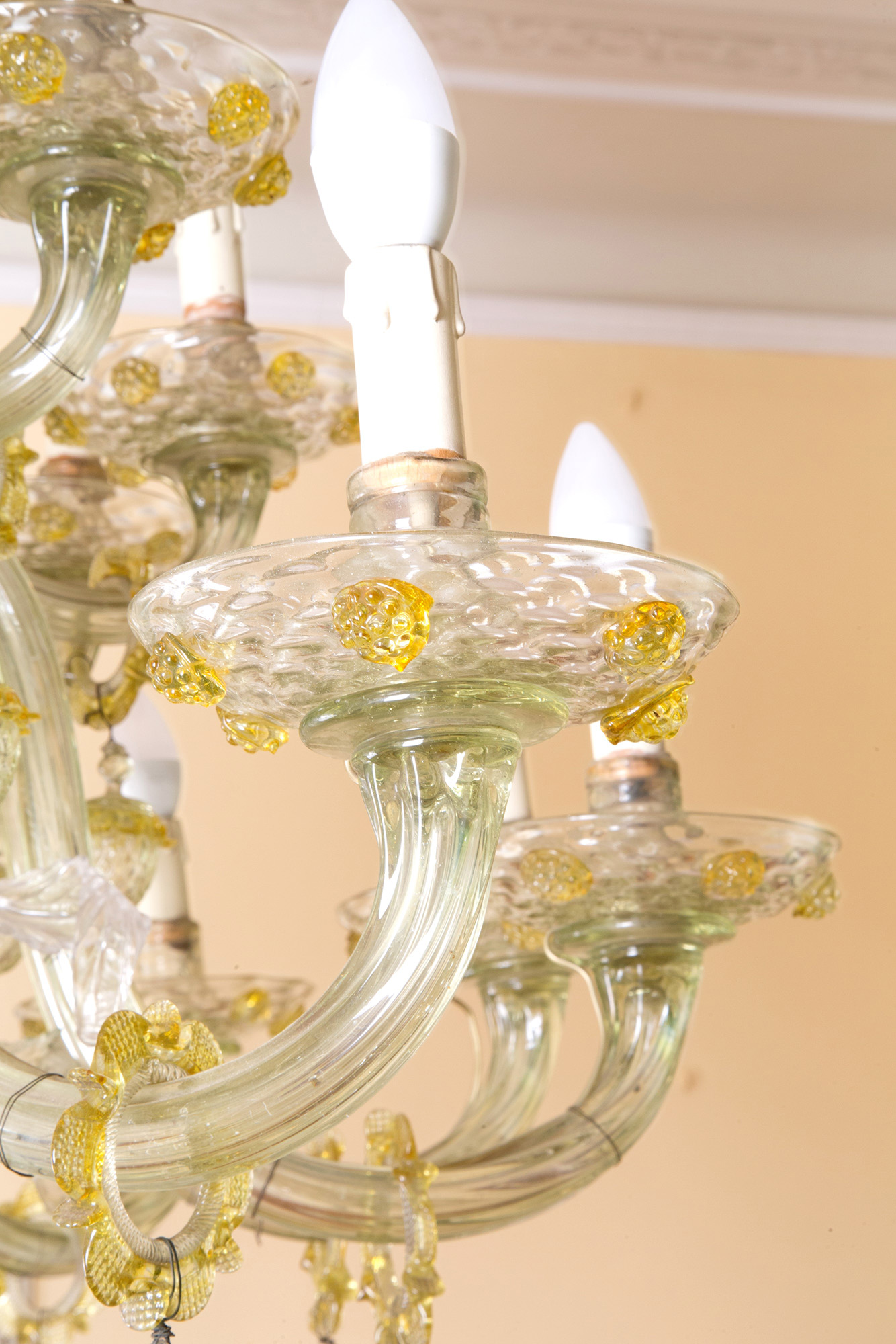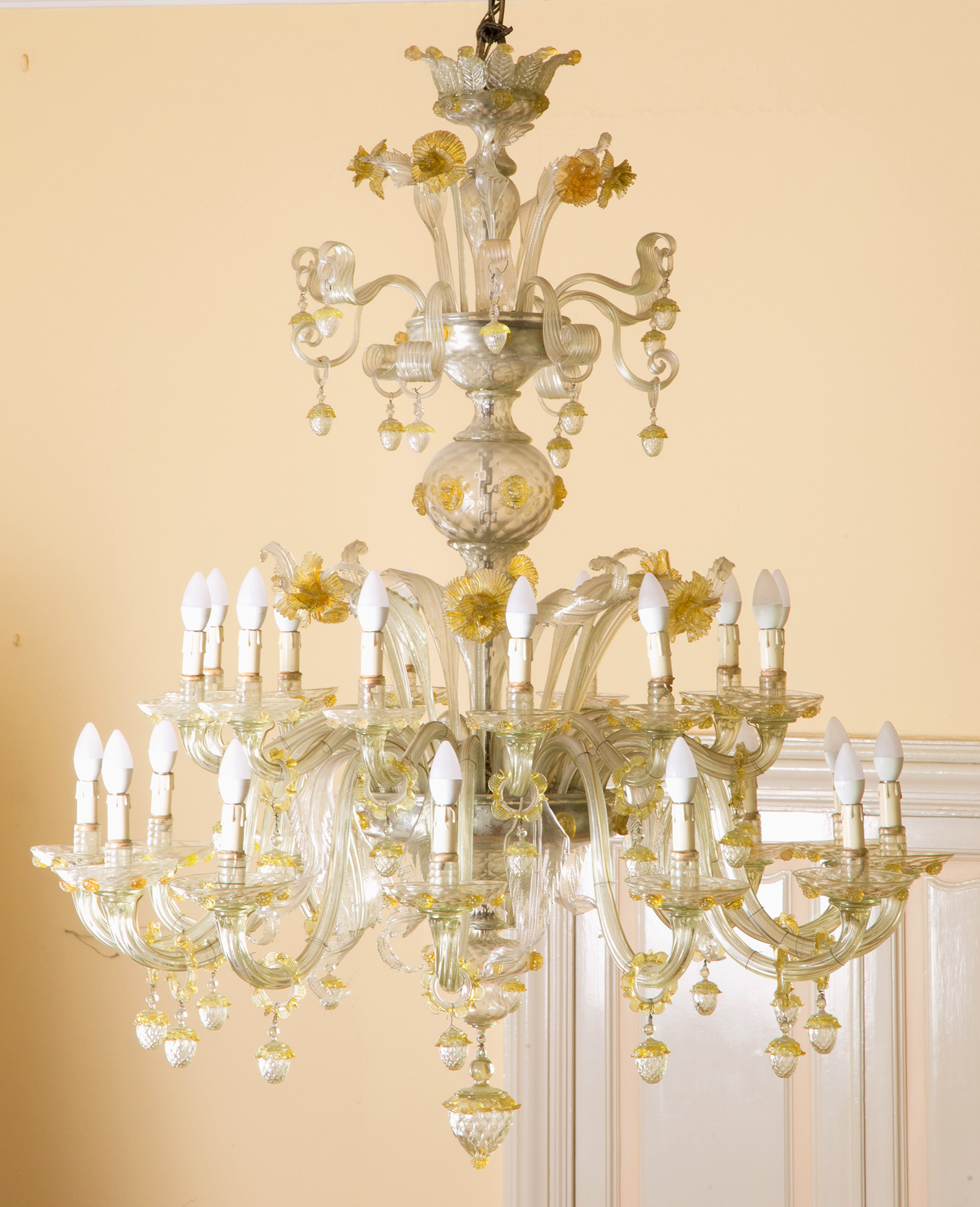 Two-stage chandelier in transparent and gold Murano glass. 19th century. Minor defects. 150x120cm approx. Lampadario a due palchi in vetro di Murano trasparente e oro. XIX secolo. Lievi difetti. 150x120 cm ca.
