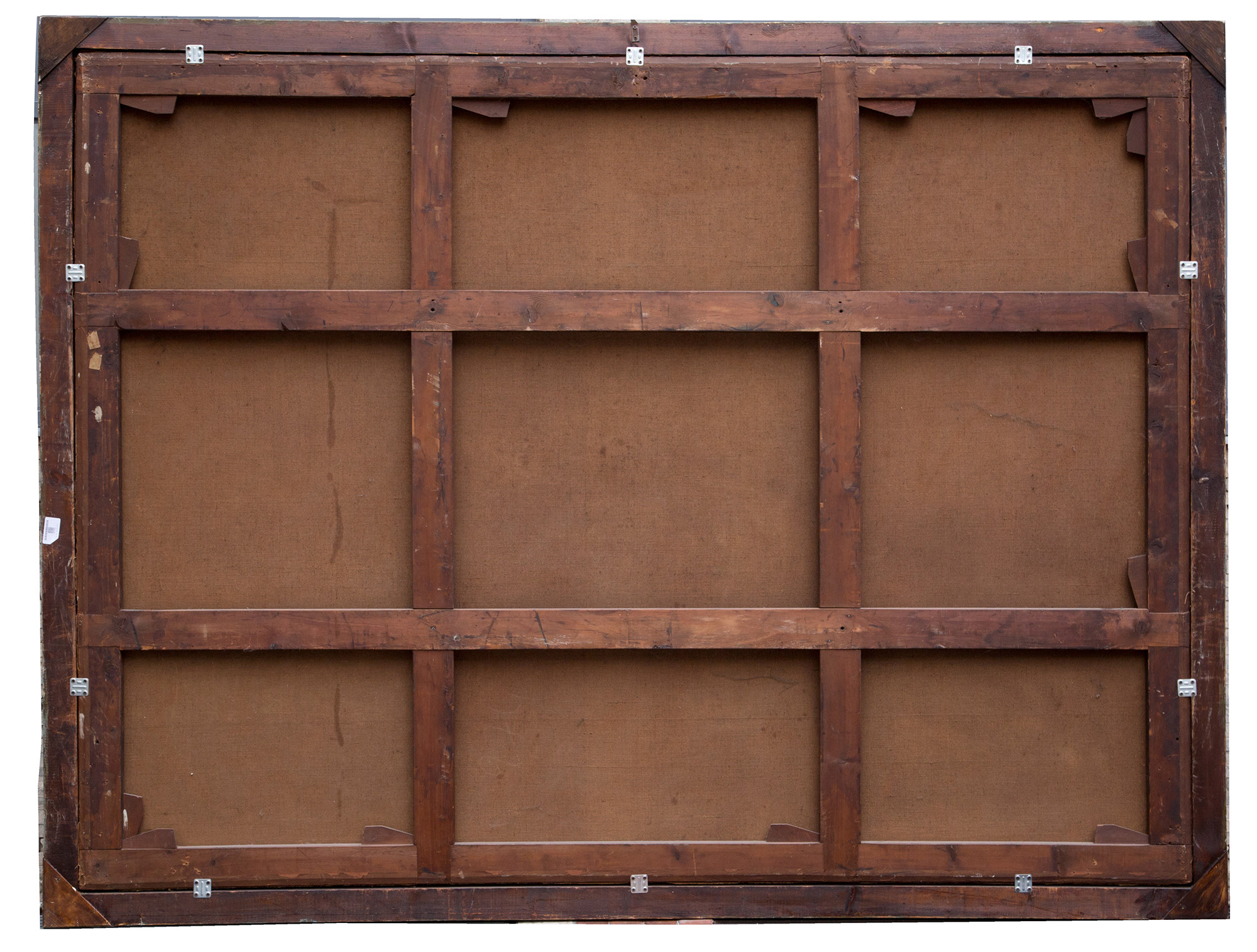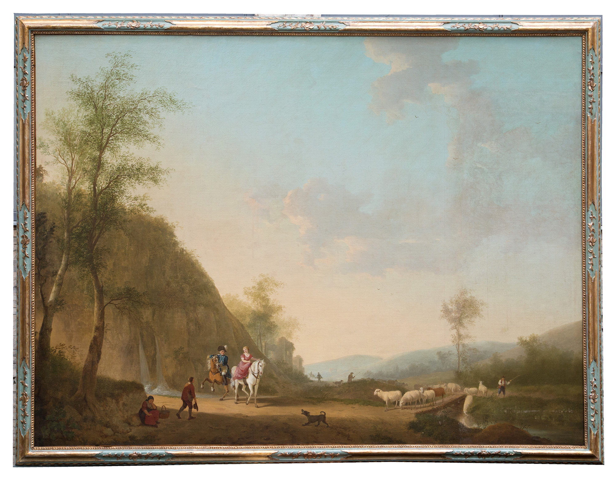Oil painting on canvas depicting "LANDSCAPE WITH CHARACTERS AND ANIMALS". Veneto. 18th century. In a contemporary carved, lacquered and gilded frame. Already relined. 176.5x240.5 cm approx. Dipinto olio su tela raffigurante "PAESAGGIO CON PERSONAGGI E ANIMALI". Veneto. XVIII secolo. In cornice coeva intagliata, laccata e dorata. Gia' rintelato. 176,5x240,5 cm ca.