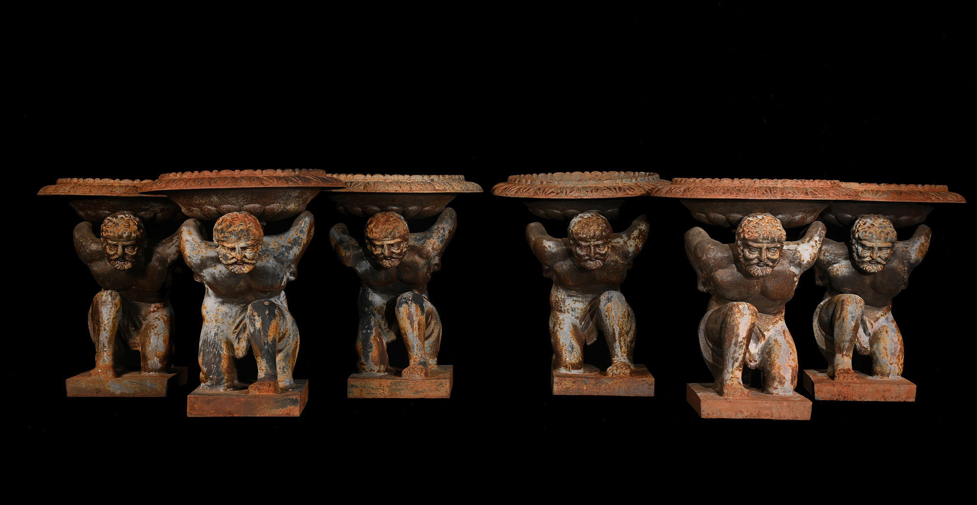 Six cast iron flower holders. 19th century. 68x62 cm approx. Sei portafiori in ghisa. XIX secolo. 68x62 cm ca.