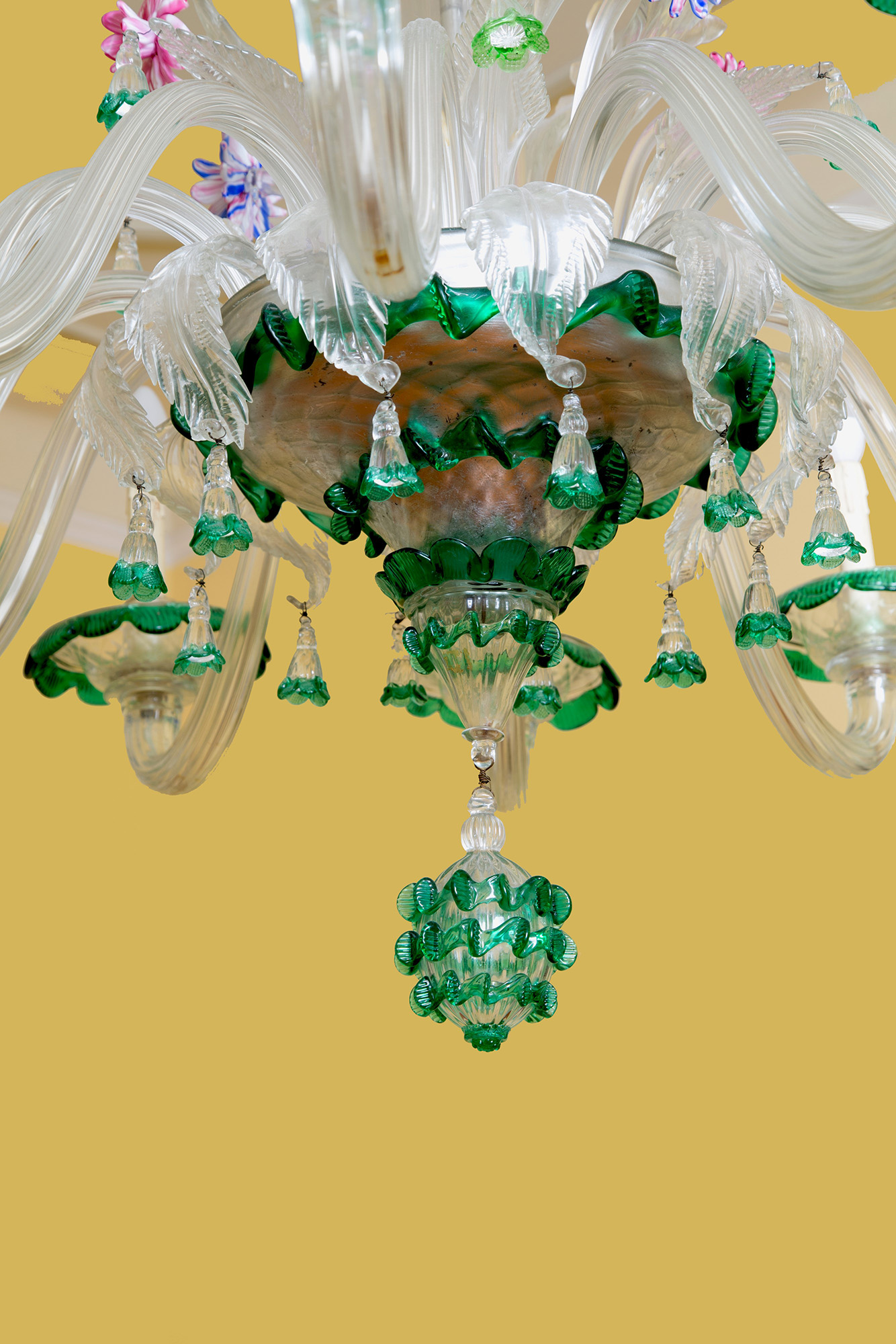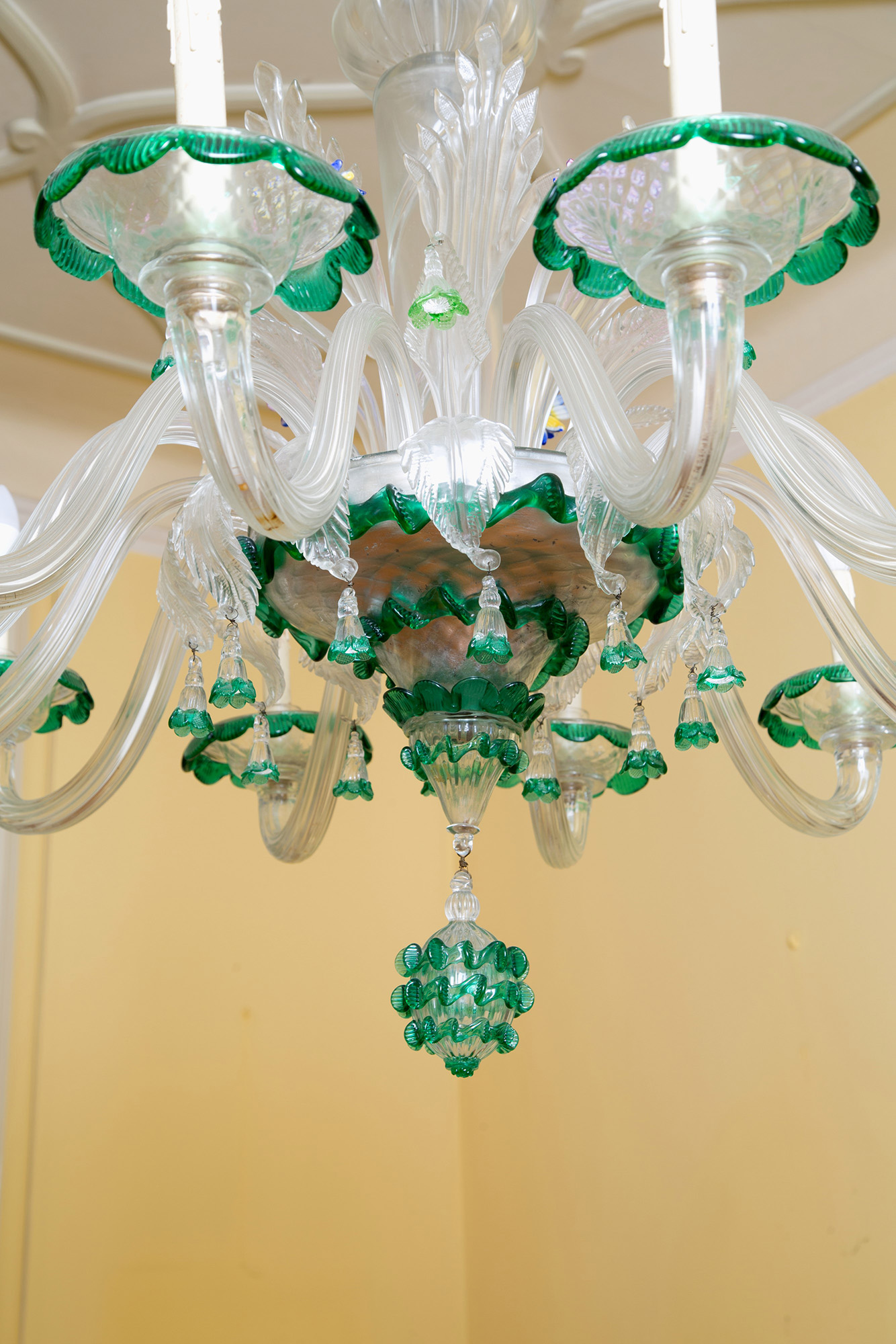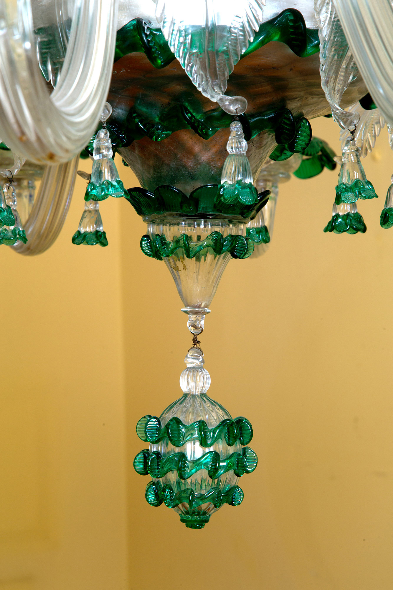Transparent and green Murano glass chandelier. 19th century. Minor defects. 147x110cm approx. Lampadario in vetro di Murano trasparente e verde. XIX secolo. Lievi difetti. 147x110 cm ca.