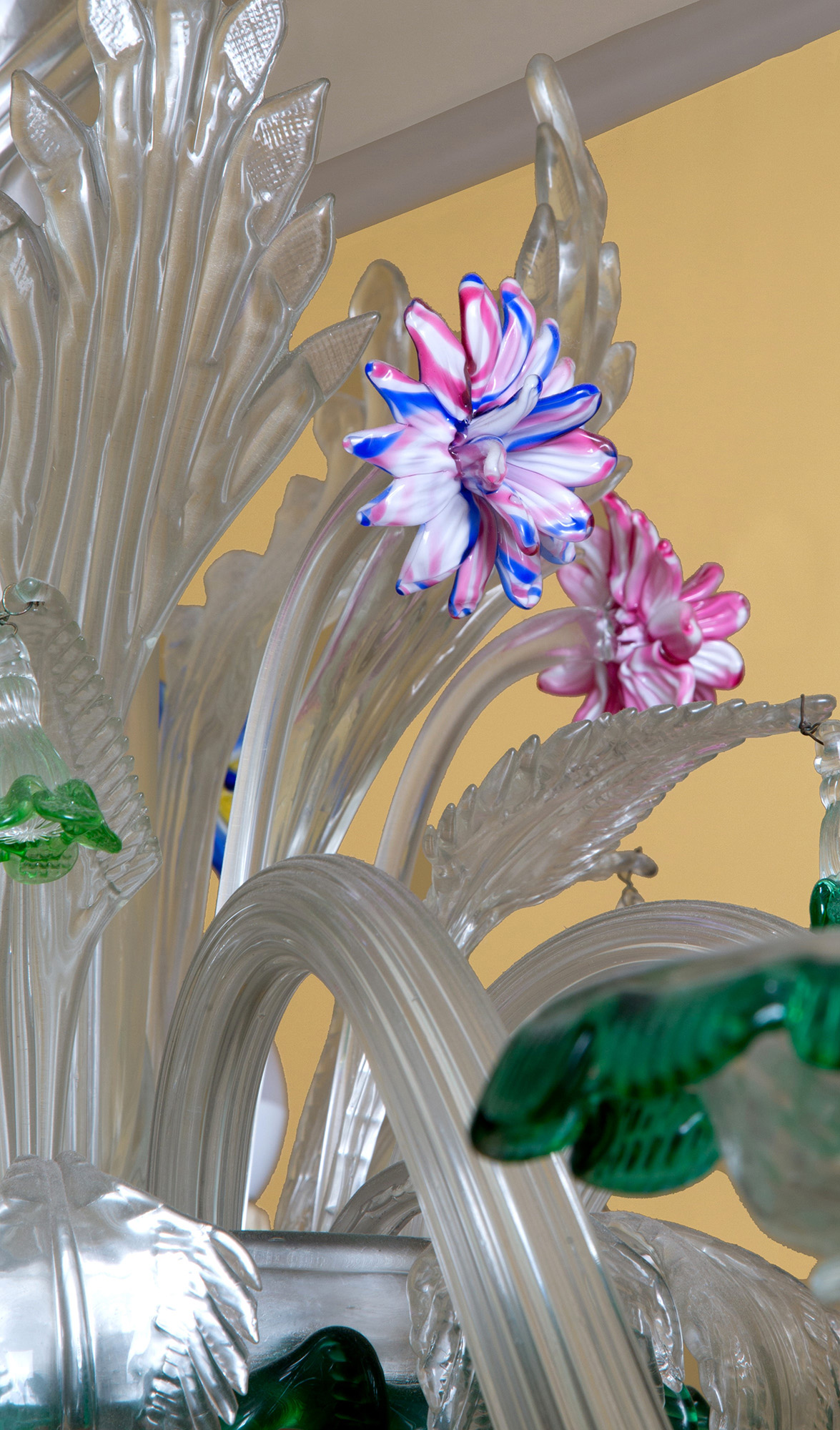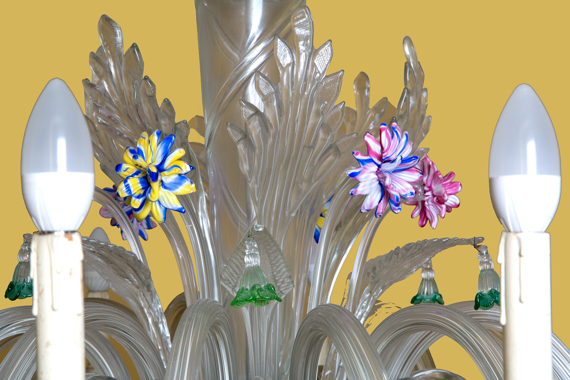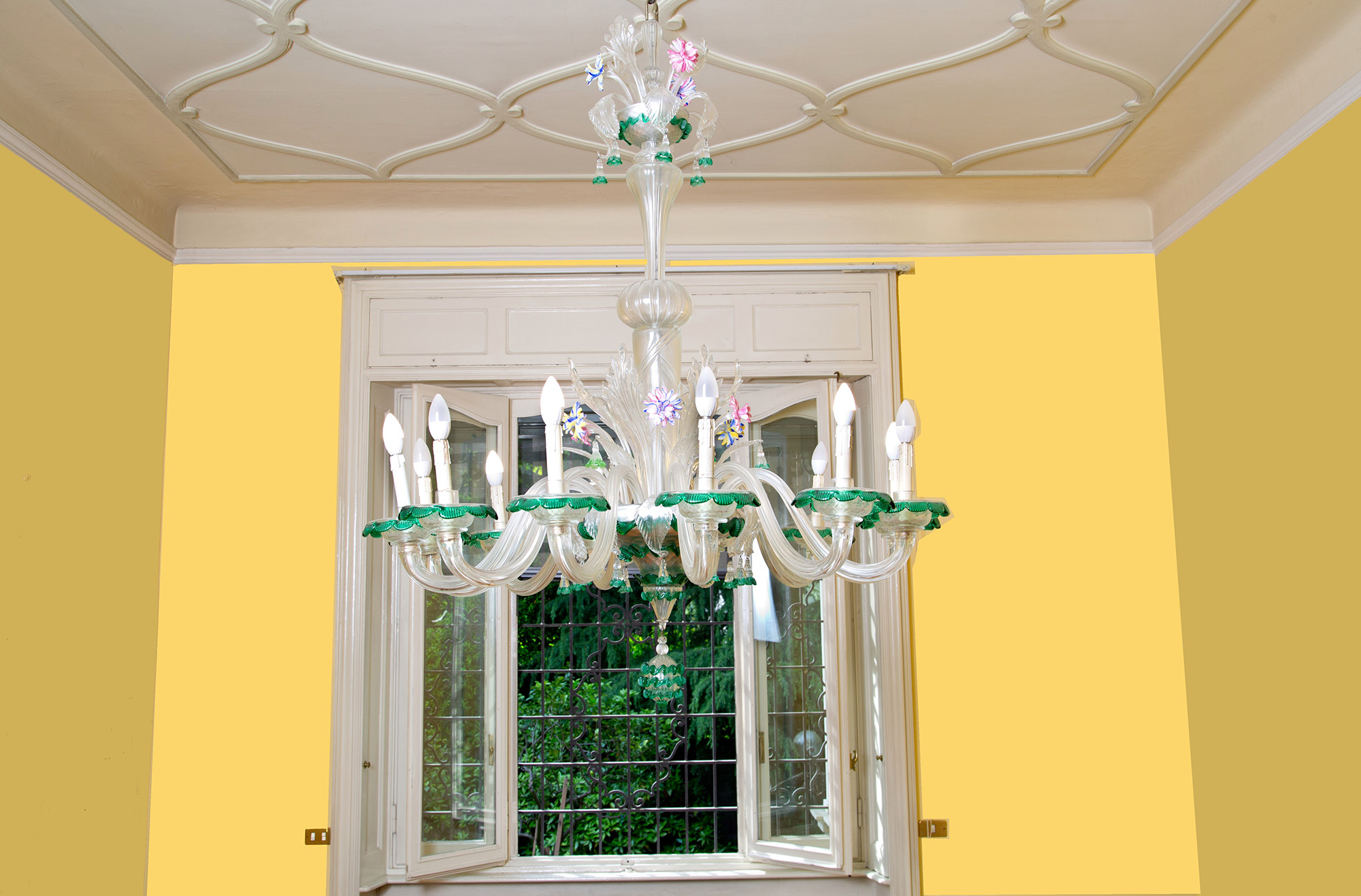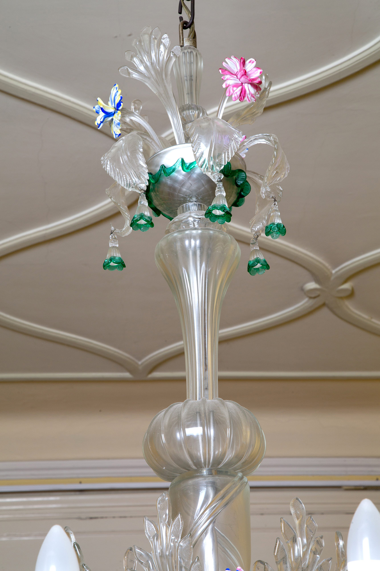 Transparent and green Murano glass chandelier. 19th century. Minor defects. 147x110cm approx. Lampadario in vetro di Murano trasparente e verde. XIX secolo. Lievi difetti. 147x110 cm ca.