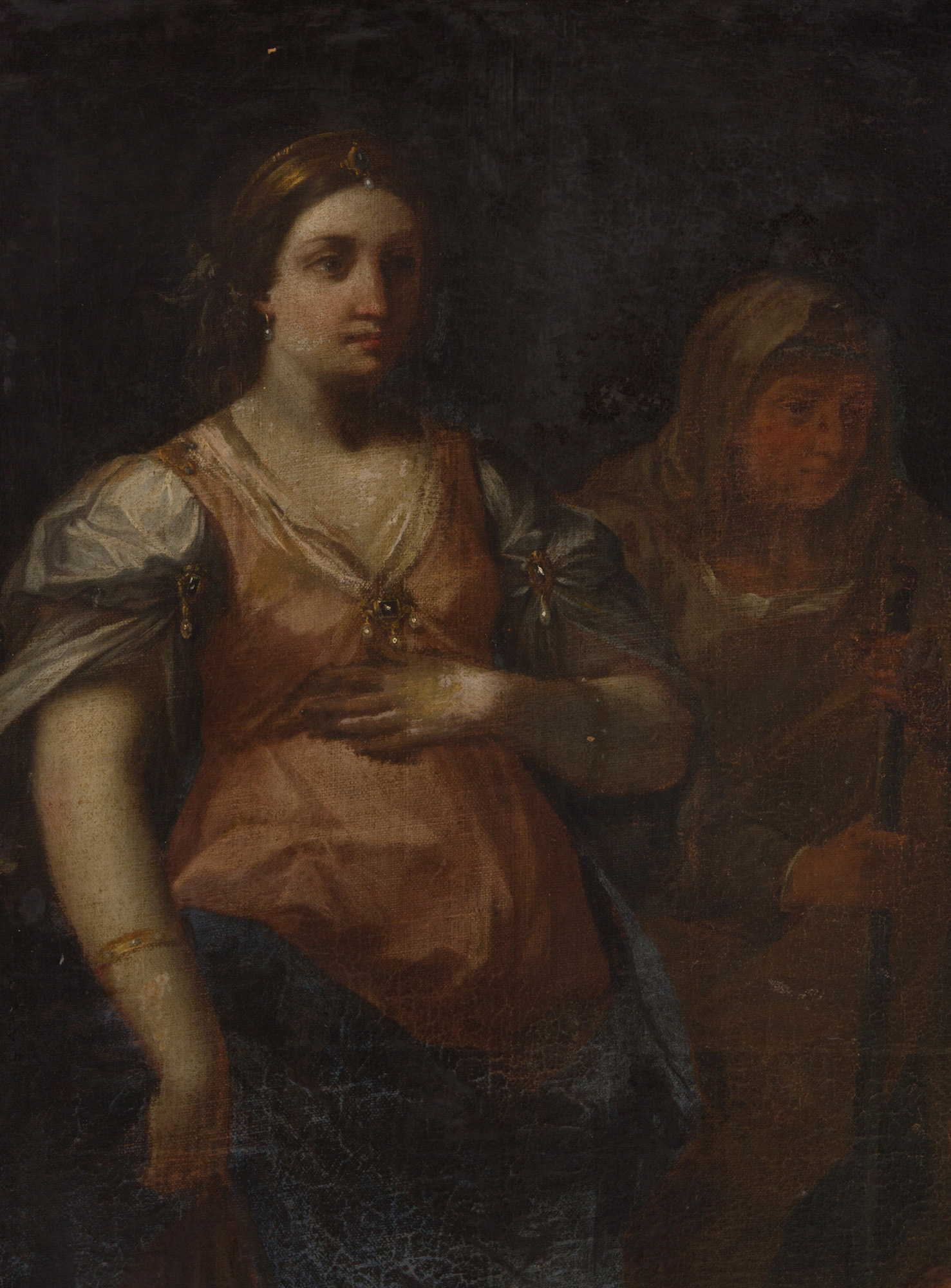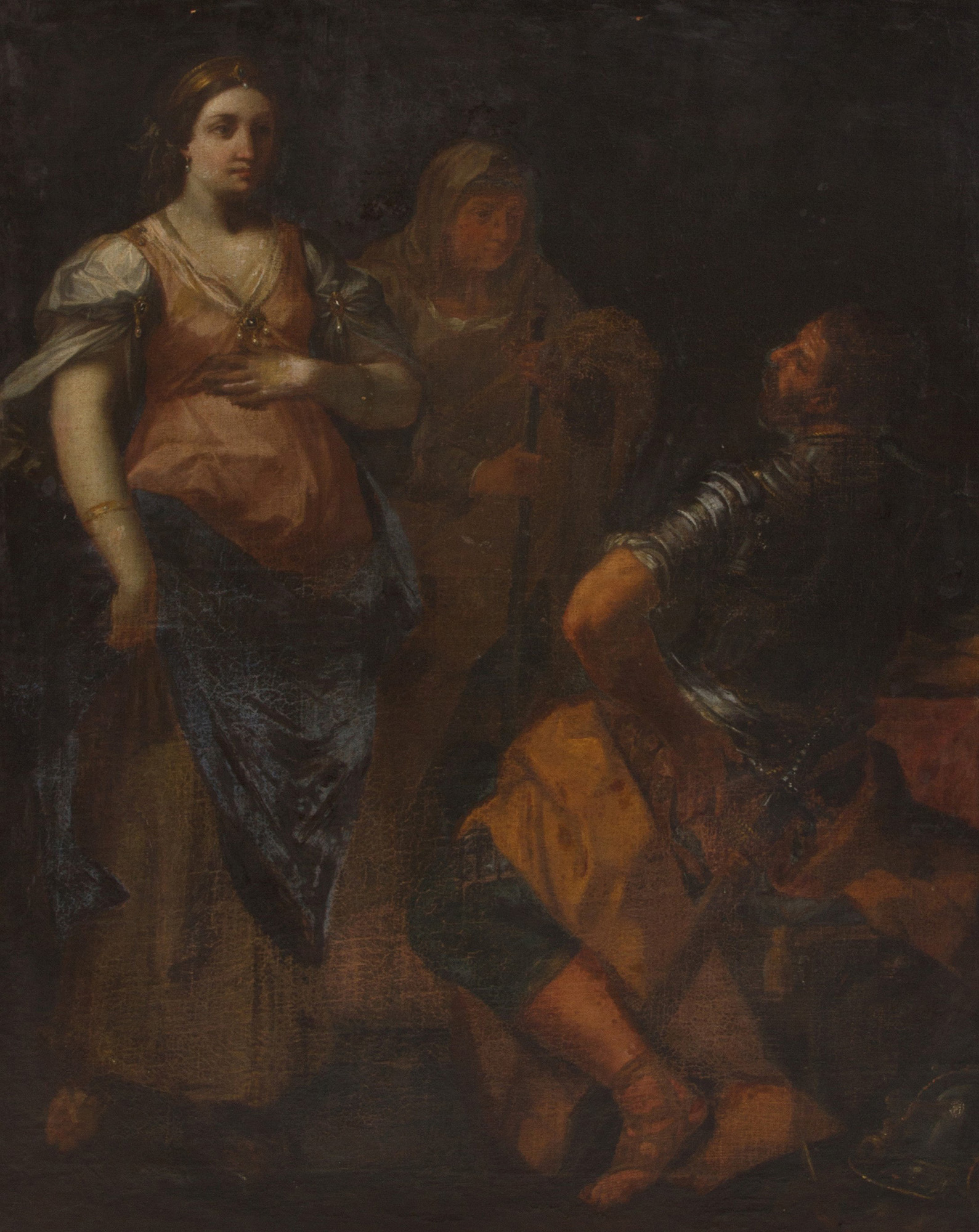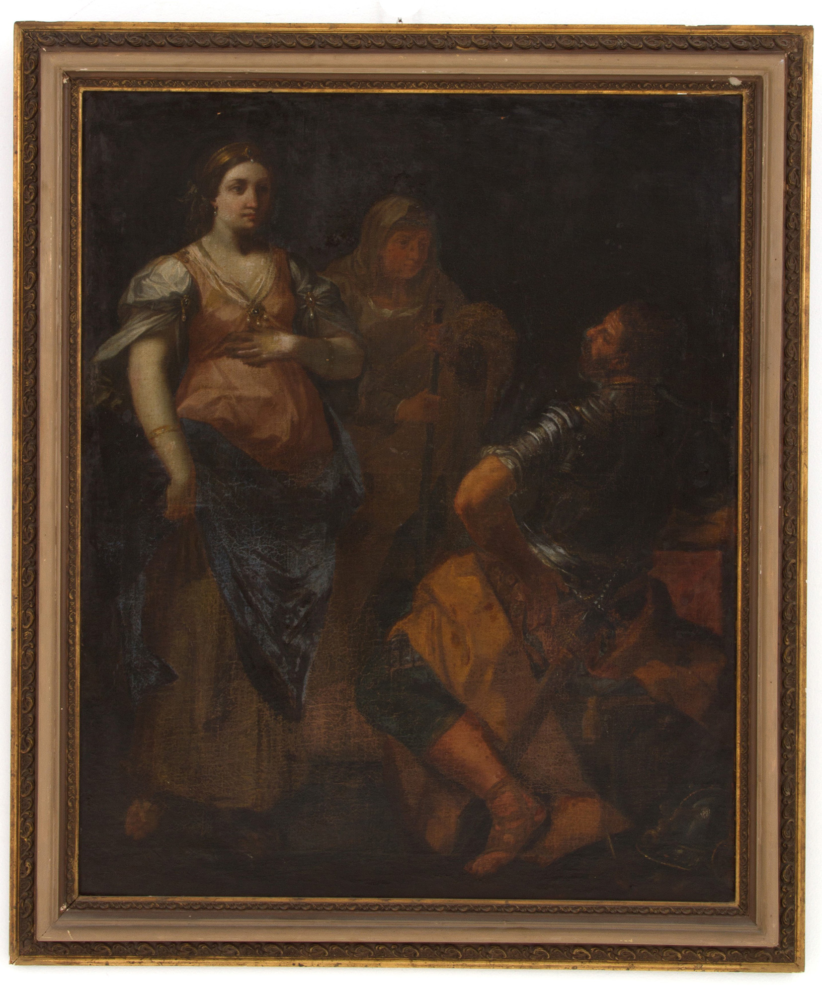 Oil painting on canvas depicting "MEETING OF DAVID AND ABIGAIL". 17th century. In frame. Defects and restorations. Already relined and reframed. 102.5x83 cm approx. Dipinto olio su tela raffigurante "INCONTRO DI DAVID E ABIGAIL". XVII secolo. In cornice. Difetti e restauri. Gia' rintelato e rintelaiato. 102,5x83 cm ca.