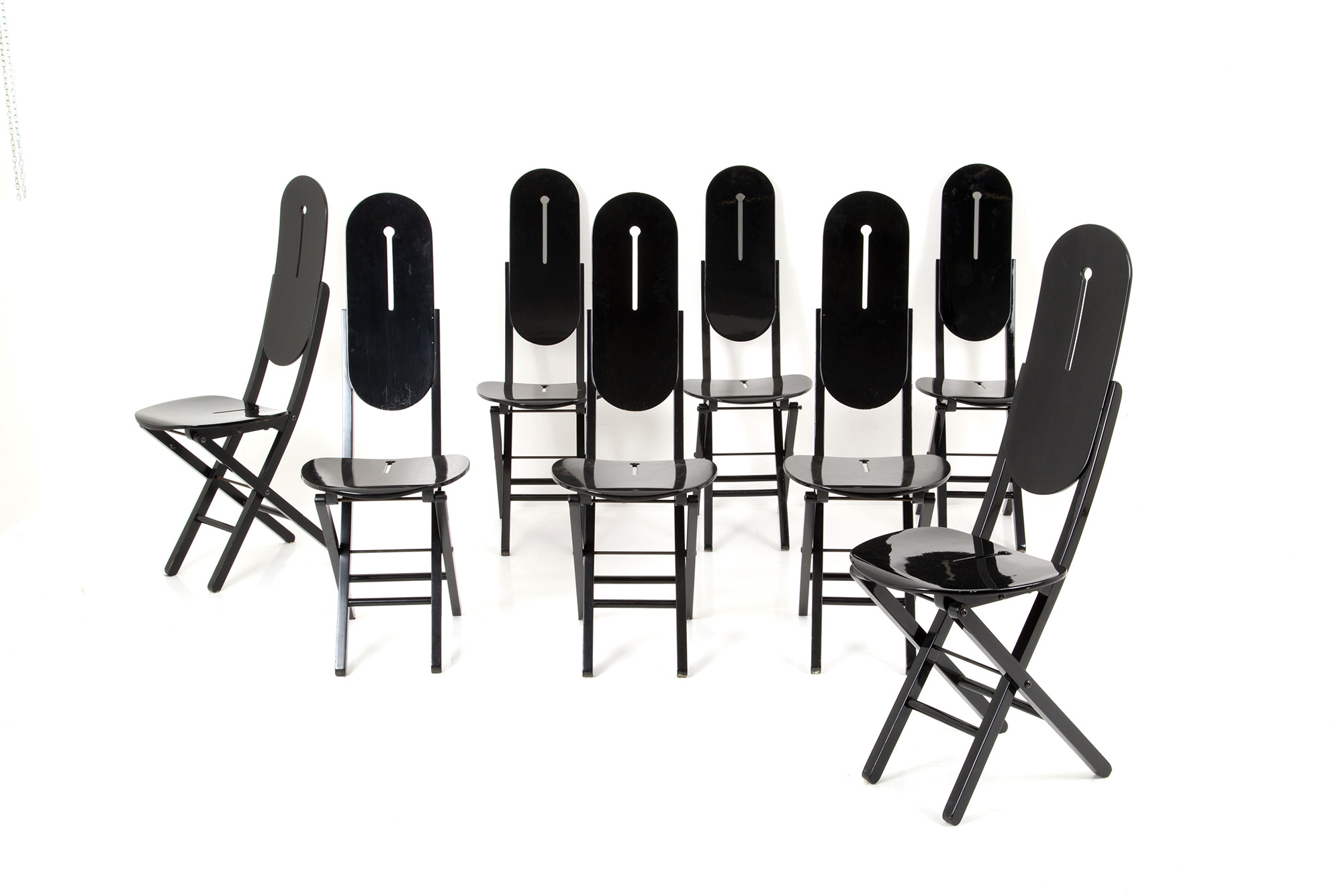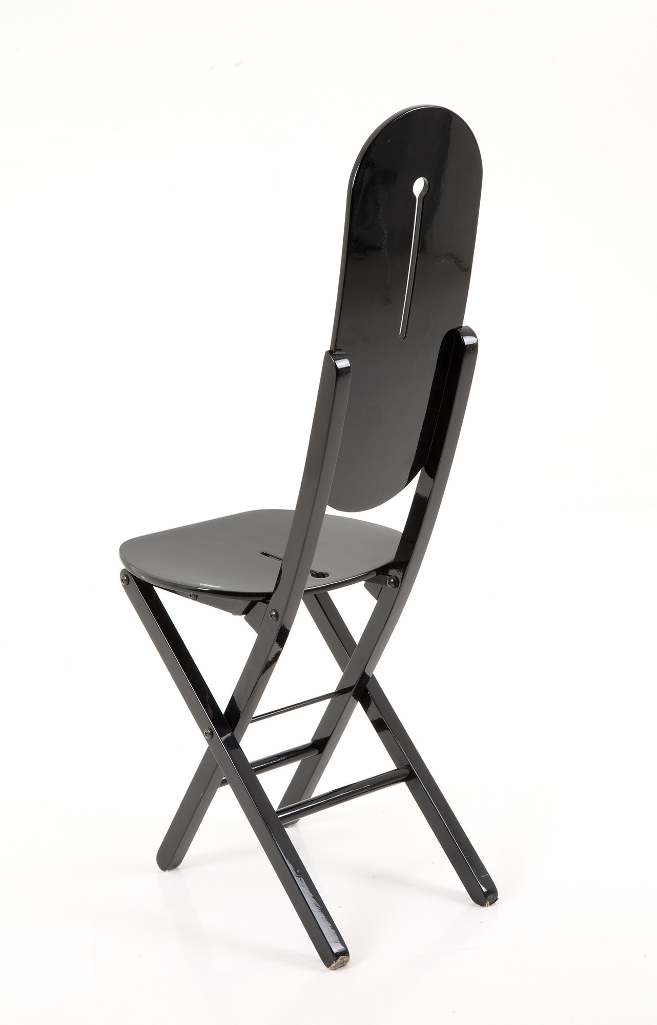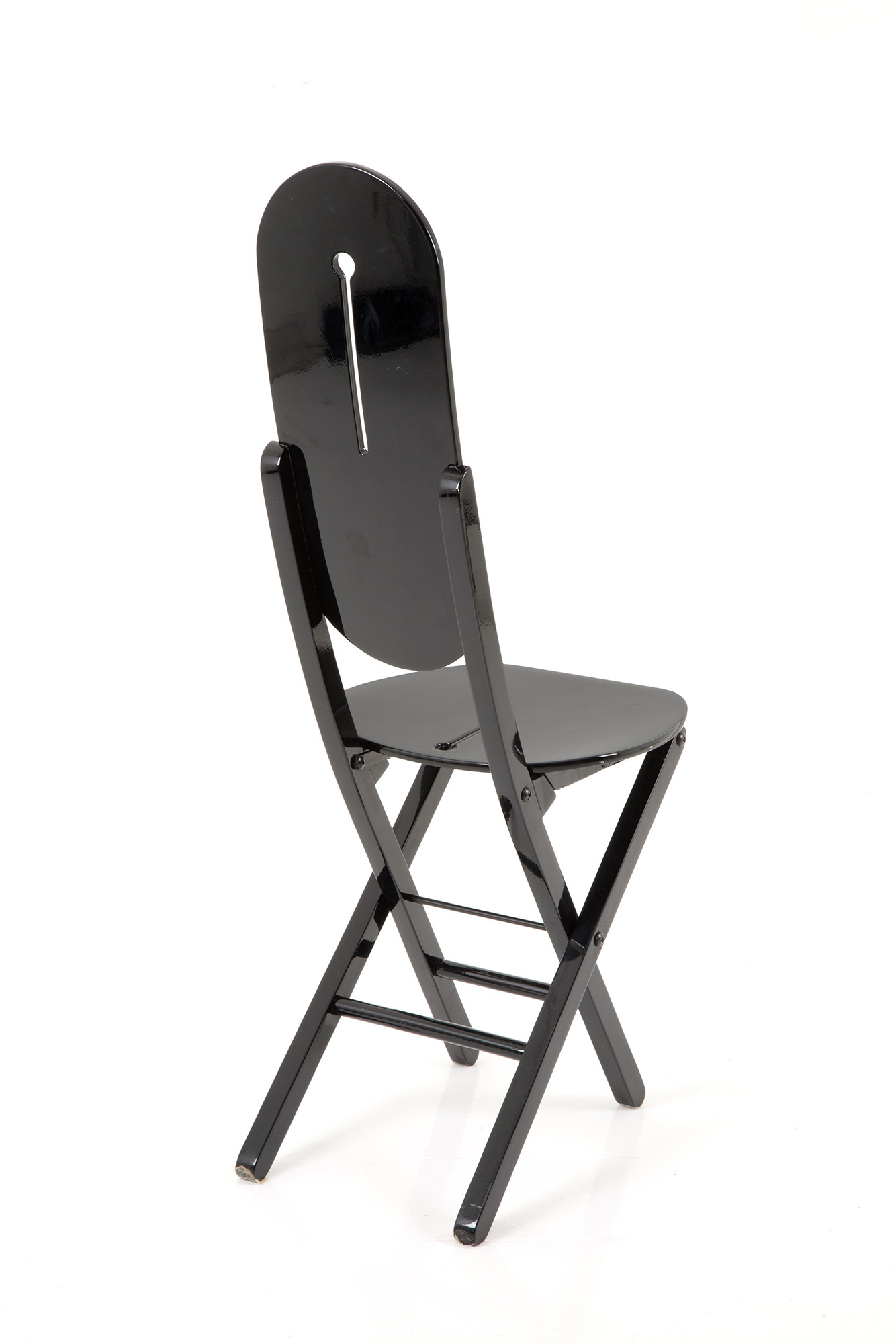 Eight folding chairs in black stained wood. Italian manufacturing. 70's. Defects and signs of wear and tear over time. 108x39x50 cm approx. Otto sedie pieghevoli in legno tinto nero. Manifattura italiana. Anni '70. Difetti e segni di usura del tempo. 108x39x50 cm ca.
