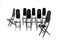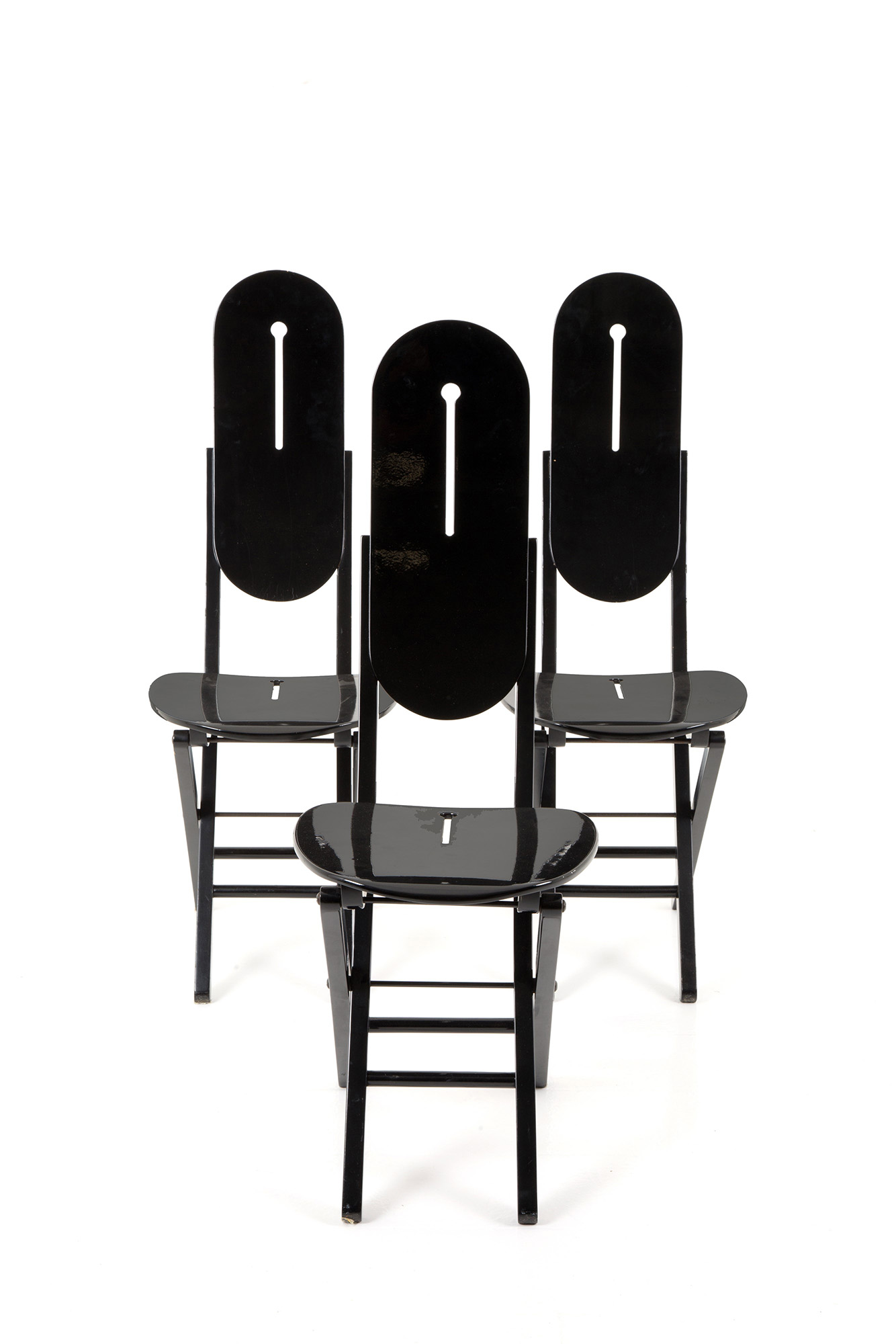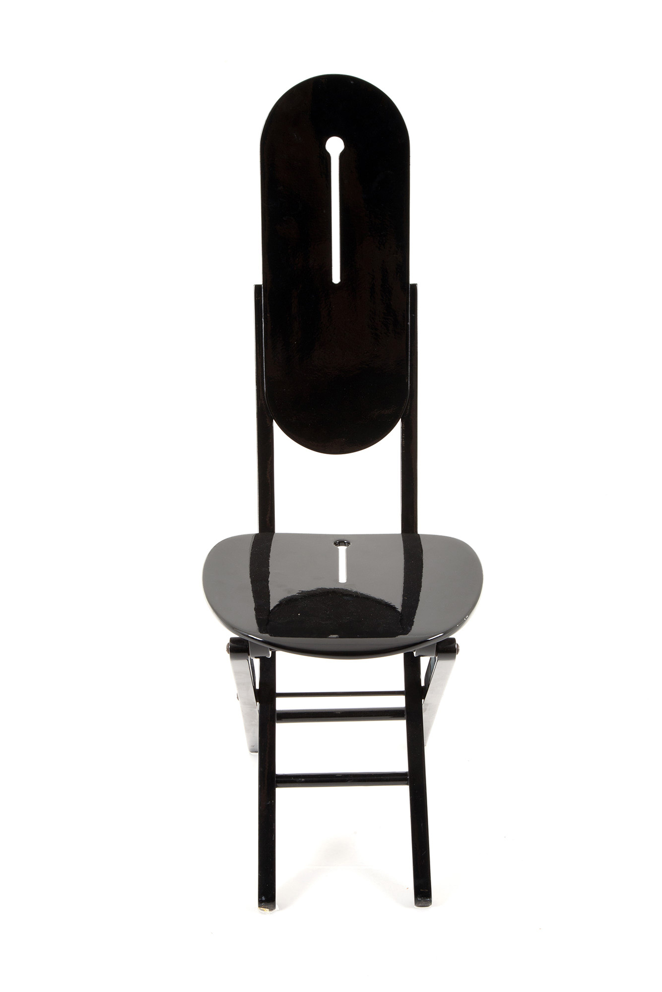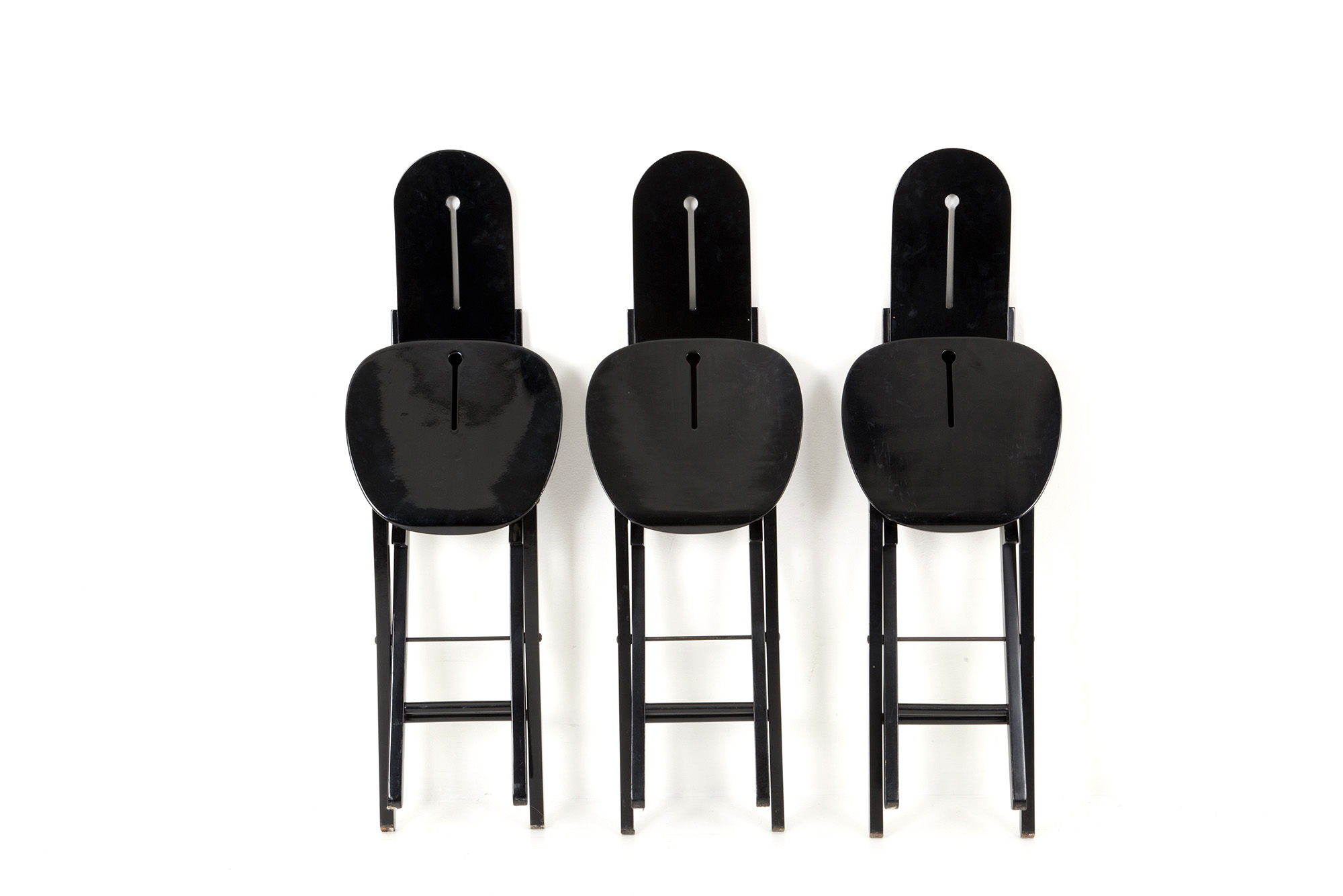 Eight folding chairs in black stained wood. Italian manufacturing. 70's. Defects and signs of wear and tear over time. 108x39x50 cm approx. Otto sedie pieghevoli in legno tinto nero. Manifattura italiana. Anni '70. Difetti e segni di usura del tempo. 108x39x50 cm ca.