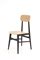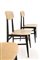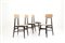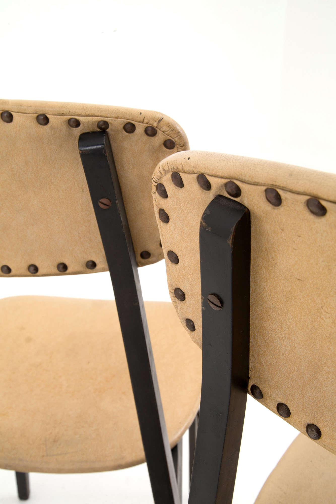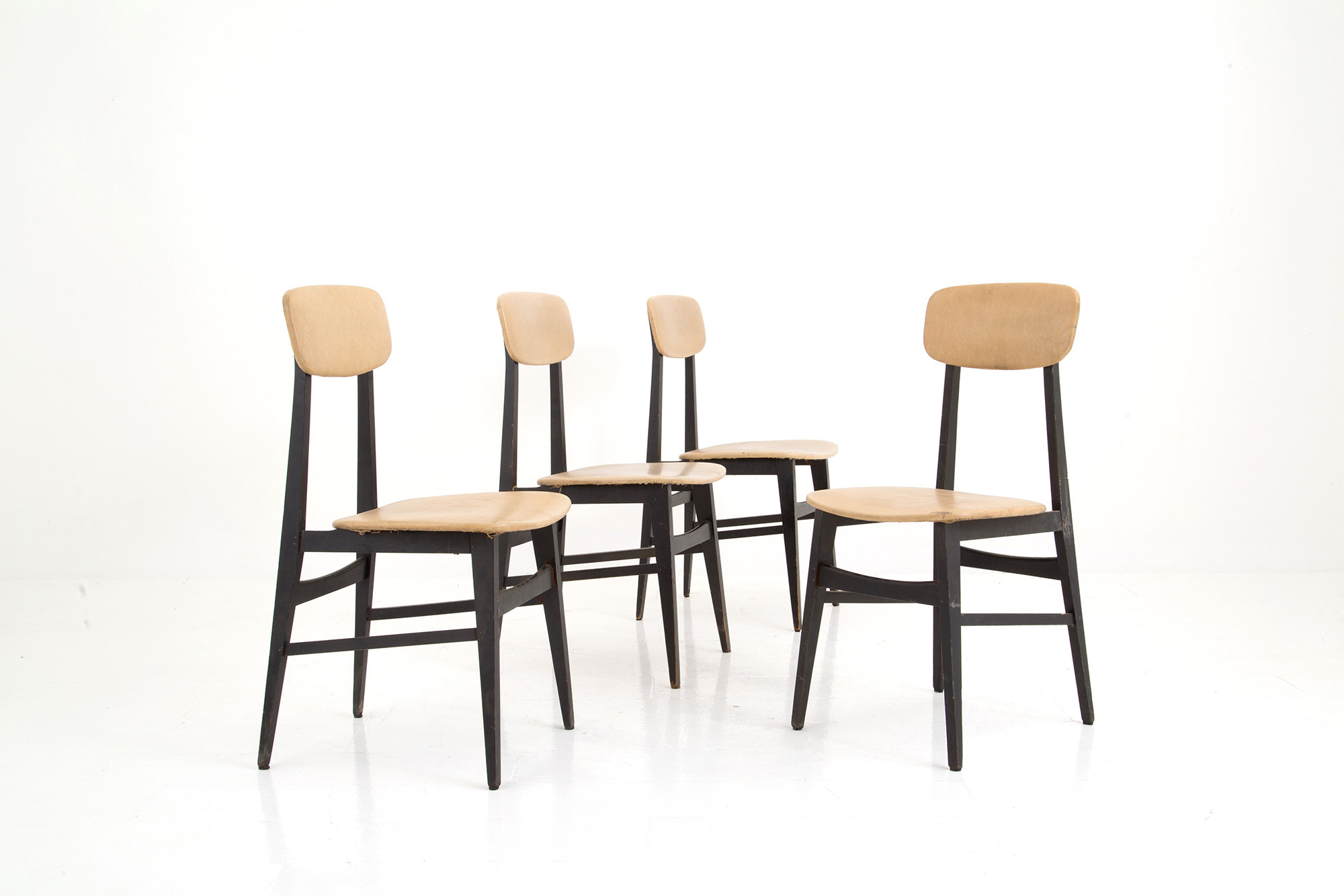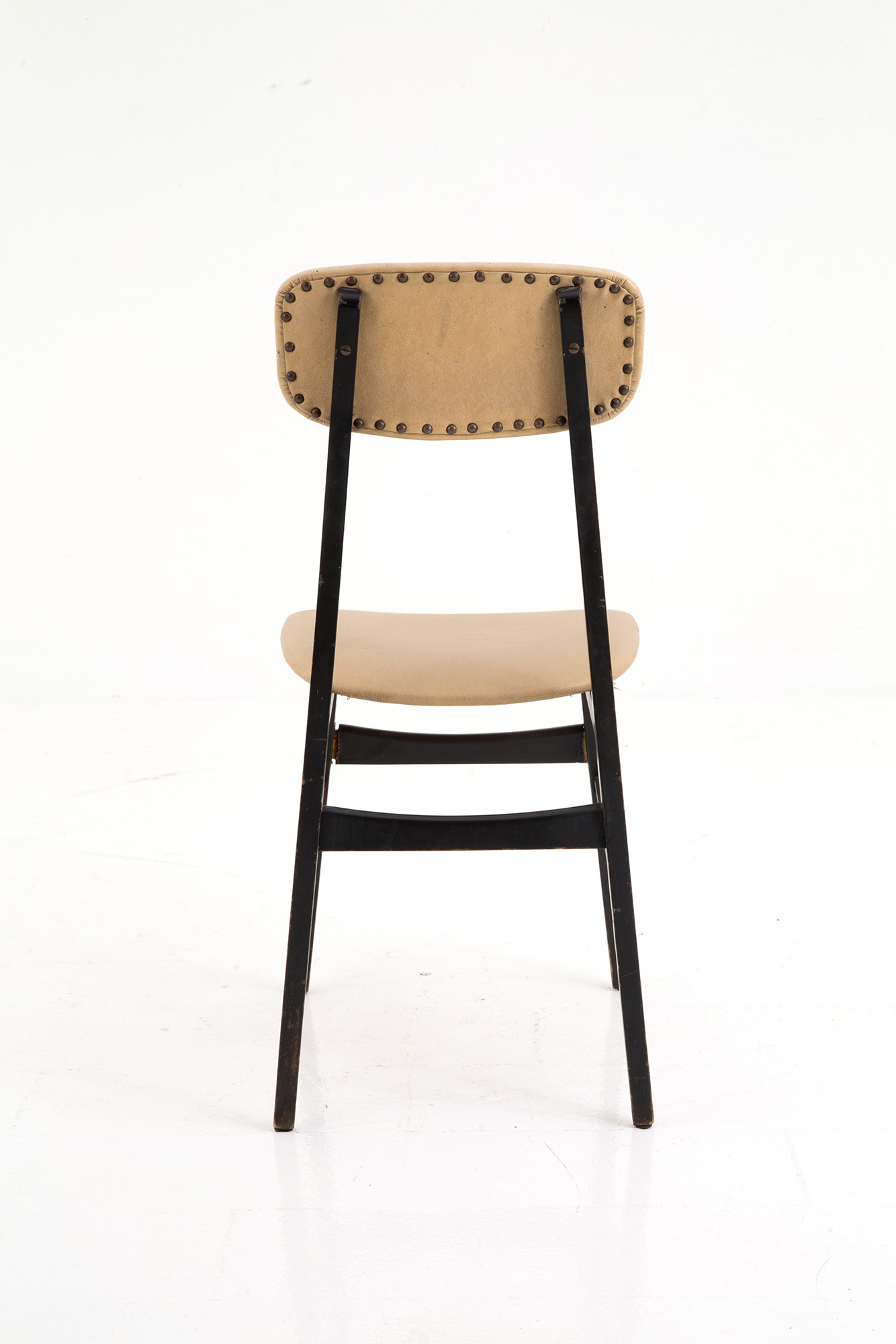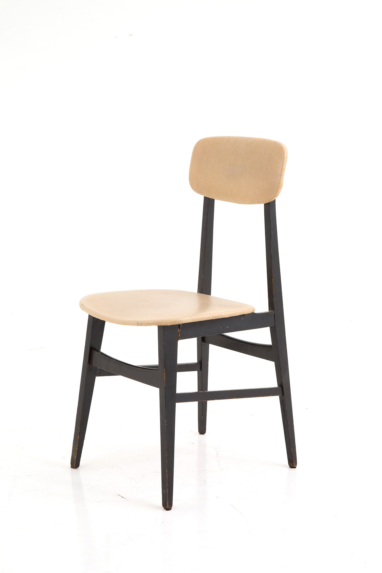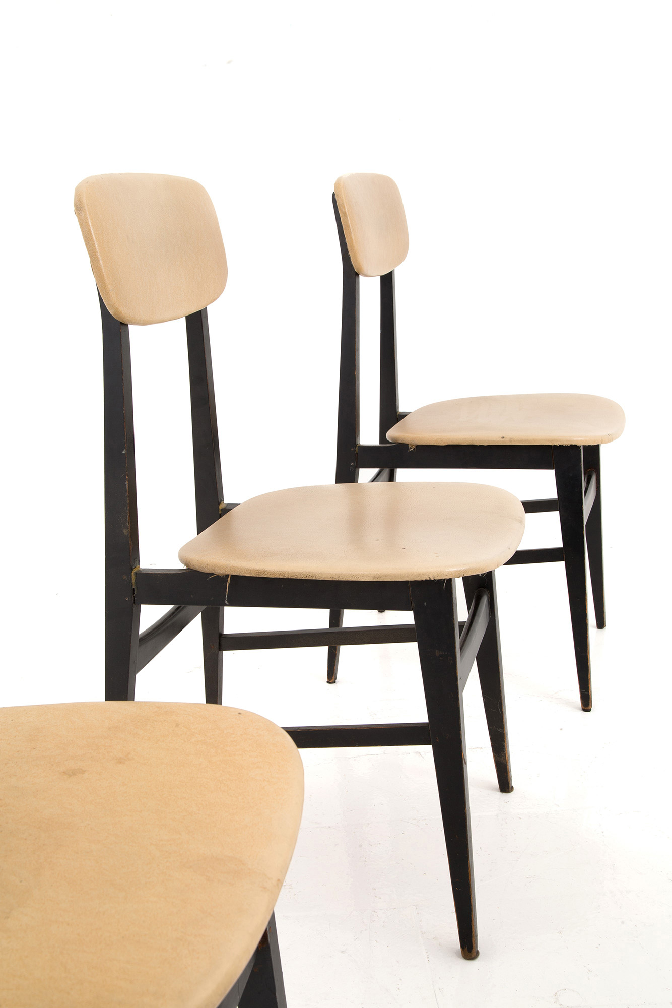 Four wooden chairs with beige skai seat and back. Italian manufacturing. 70's. Minor defects. 85x40x48 cm approx. Quattro sedie in legno con seduta e schienale in skai beige. Manifattura Italiana. Anni '70. Lievi difetti. 85x40x48 cm ca.