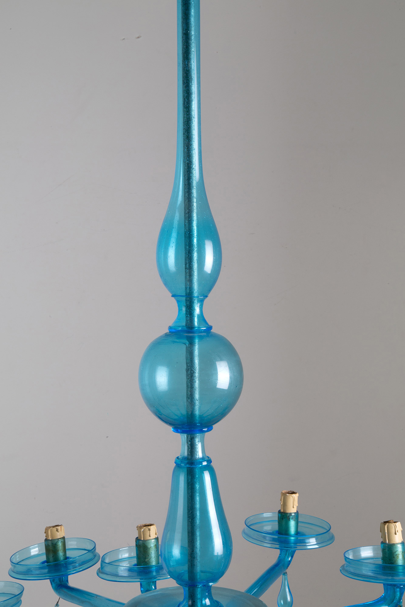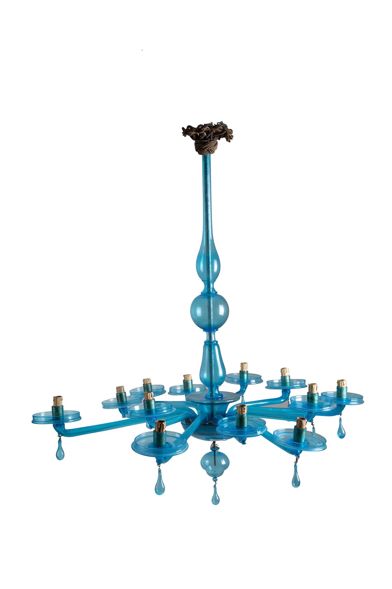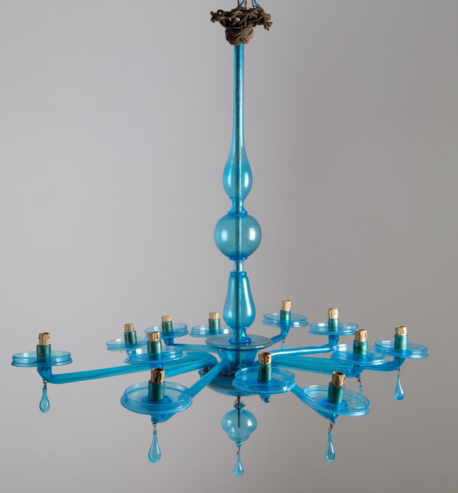 Twelve-arm chandelier in light blue Murano blown glass with drop pendants. VENINI production. 125x120x90 cm approx. Lampadario dodici braccia in vetro soffiato di Murano color azzurro con pendenti a goccia. Produzione VENINI. 125x120x90 cm ca.