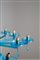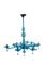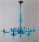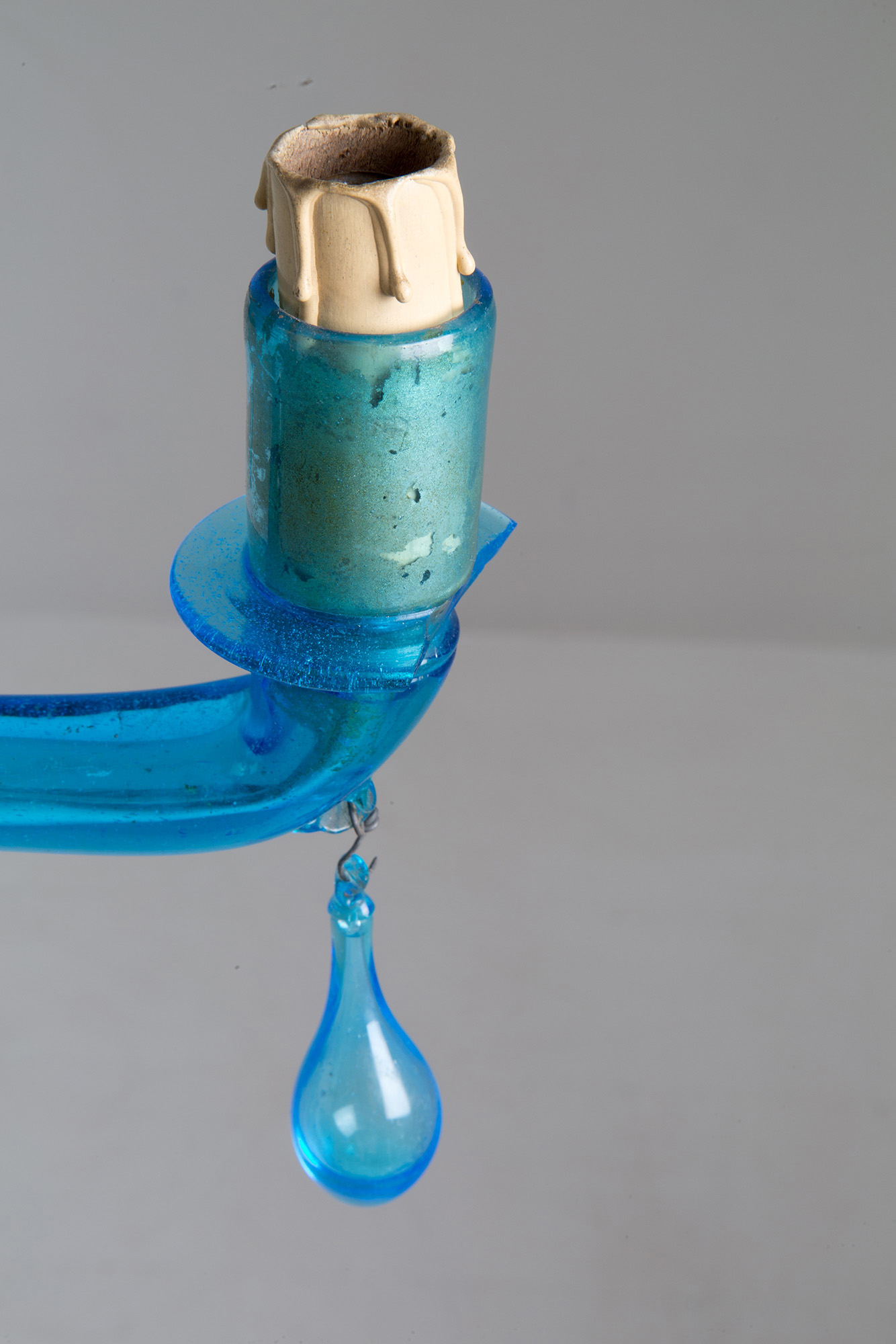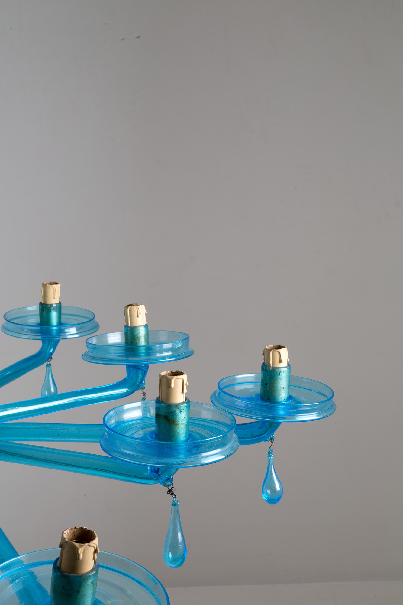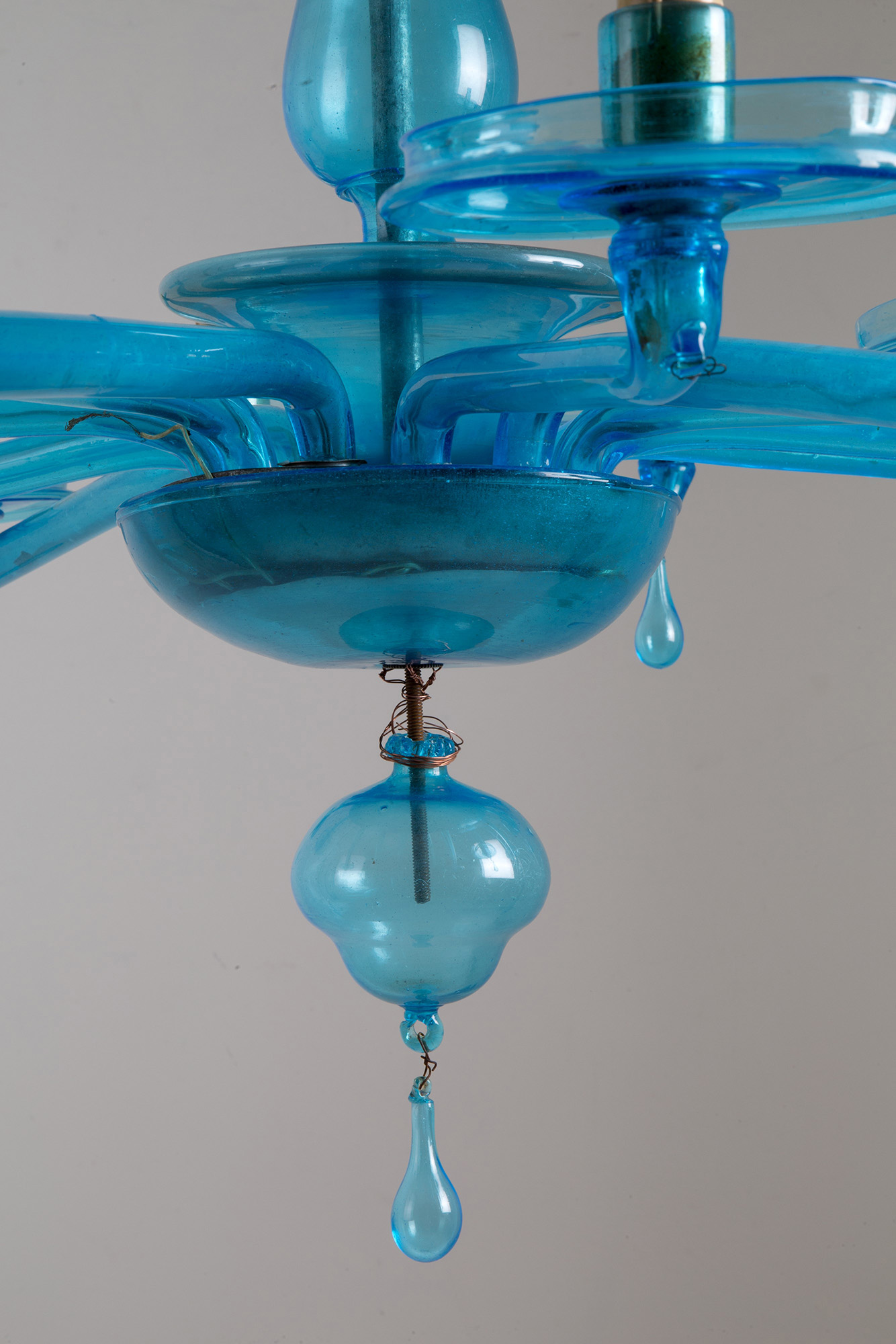 Twelve-arm chandelier in light blue Murano blown glass with drop pendants. VENINI production. 125x120x90 cm approx. Lampadario dodici braccia in vetro soffiato di Murano color azzurro con pendenti a goccia. Produzione VENINI. 125x120x90 cm ca.