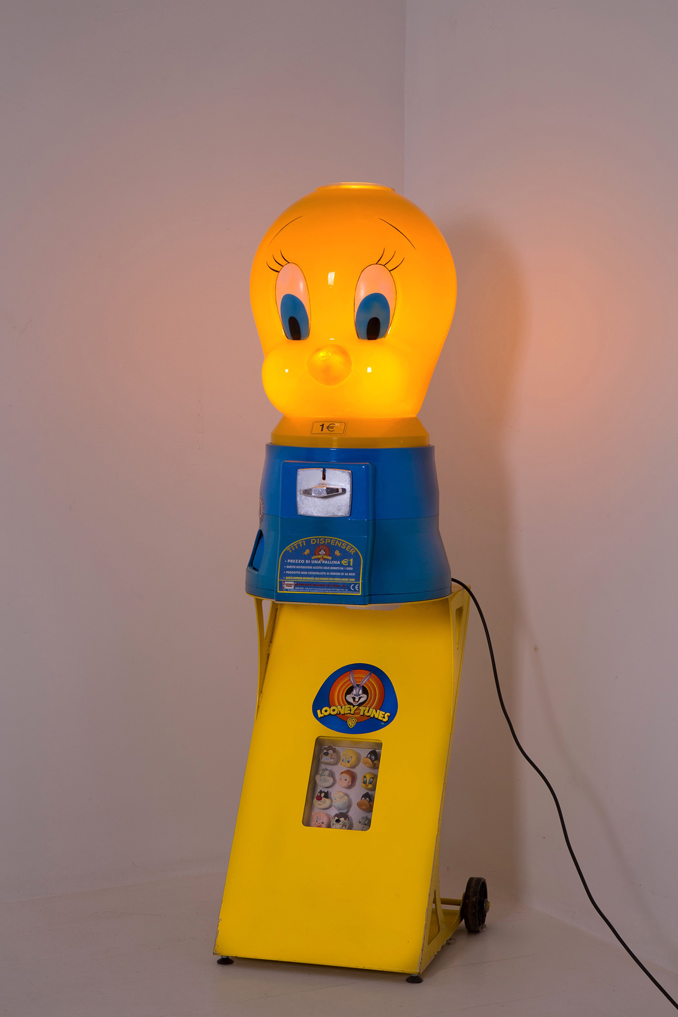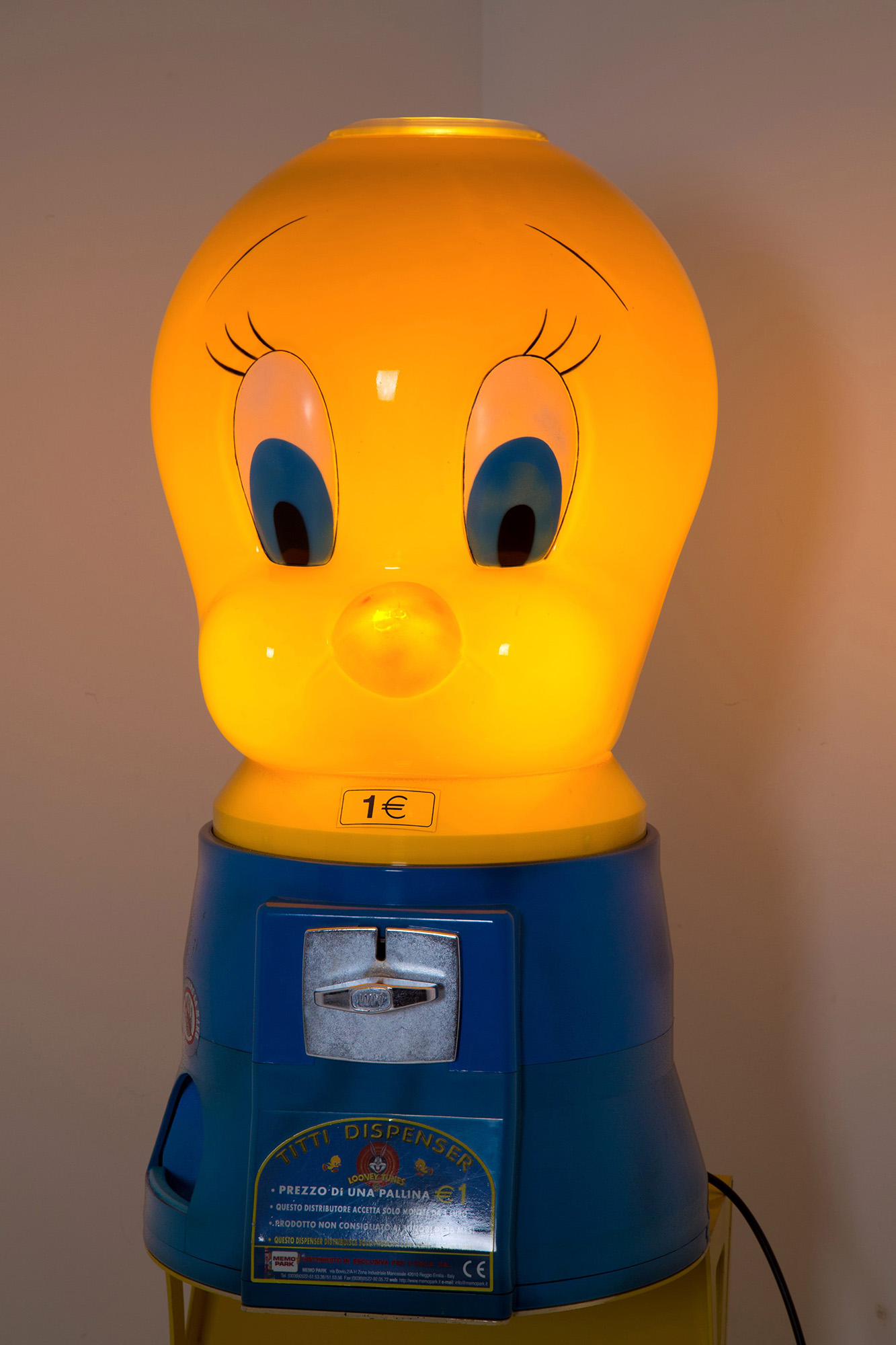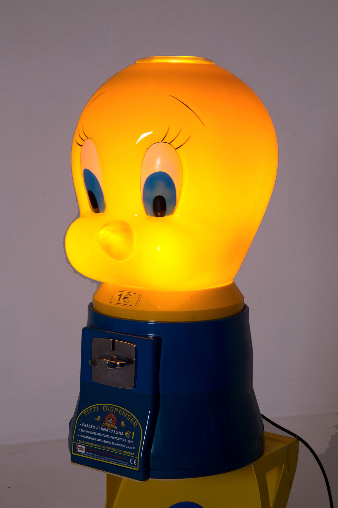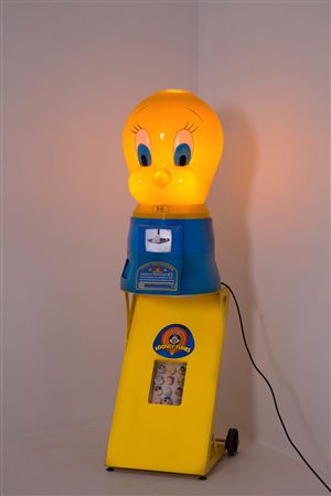 Vending machine transformed into a lamp in plastic and metal depicting "TITTI" with lighting on the coin acceptor. 142x45 cm approx. Distributore automatico trasformato in lampada in materiale plastico e metallo raffigurante "TITTI" con accensione sulla gettoniera. 142x45 cm ca.