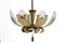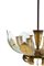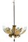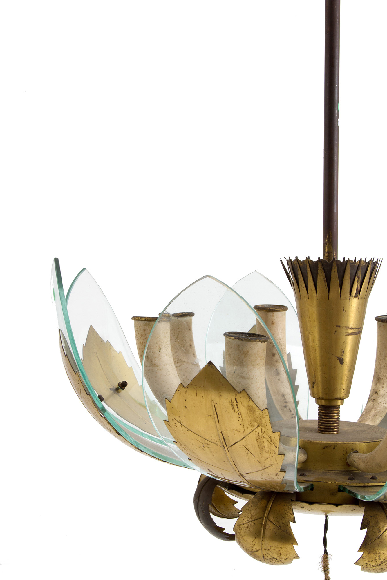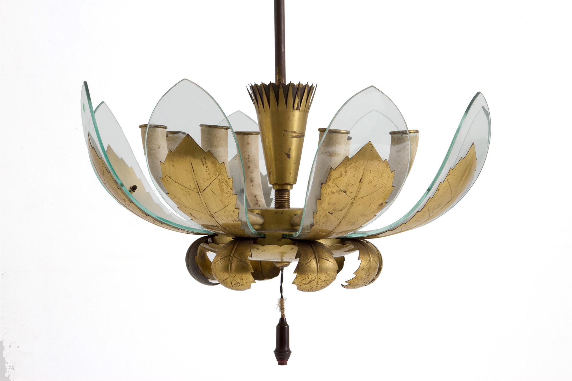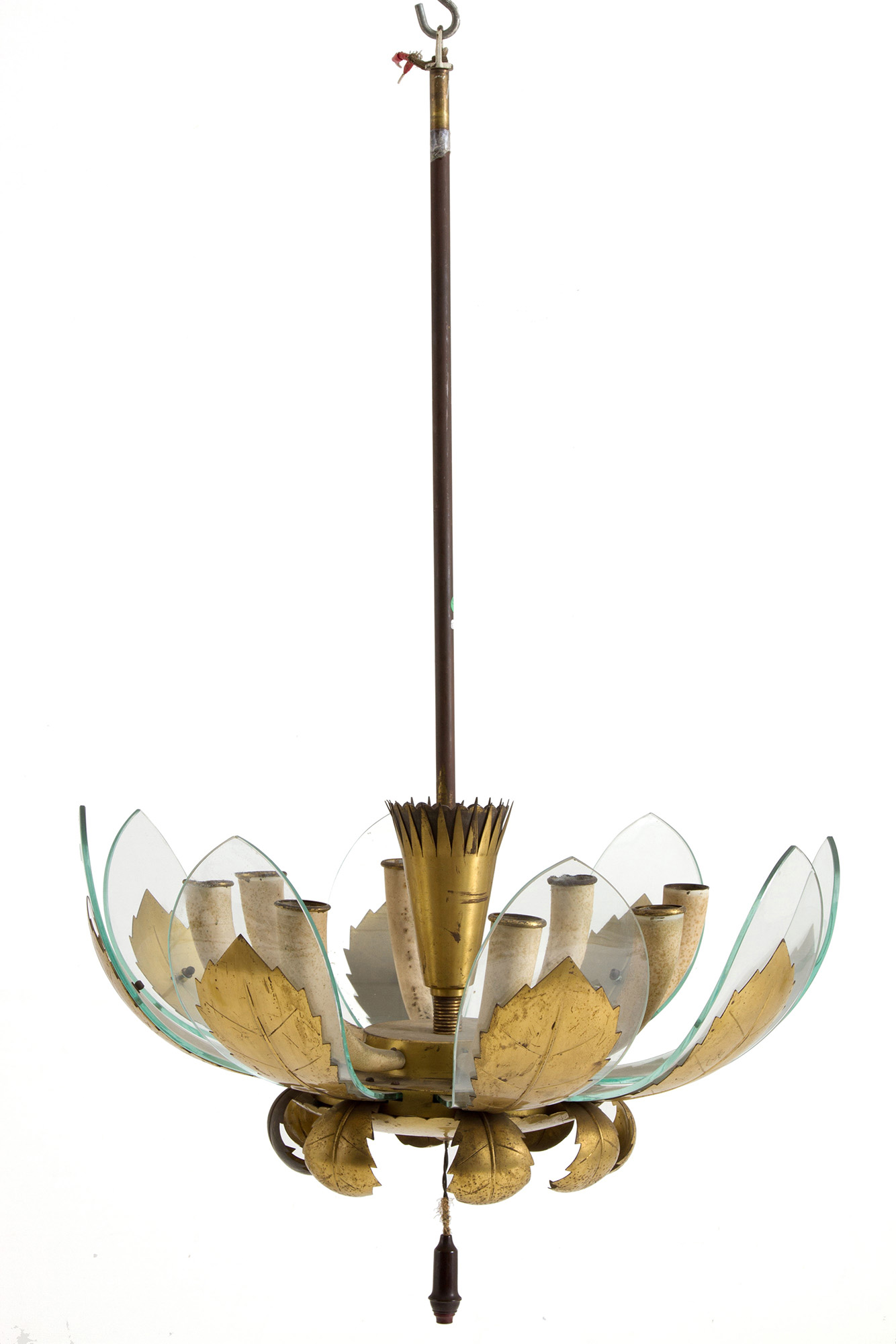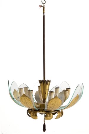 Chandelier with golden metal structure and leaves and glass diffusers. Italian manufacturing. 60's. Defects and breakage of a glass. 100x63 cm approx. Lampadario con struttura e foglie in metallo dorato e diffusori in vetro. Manifattura italiana. Anni '60. Difetti e rottura di un vetro. 100x63 cm ca.