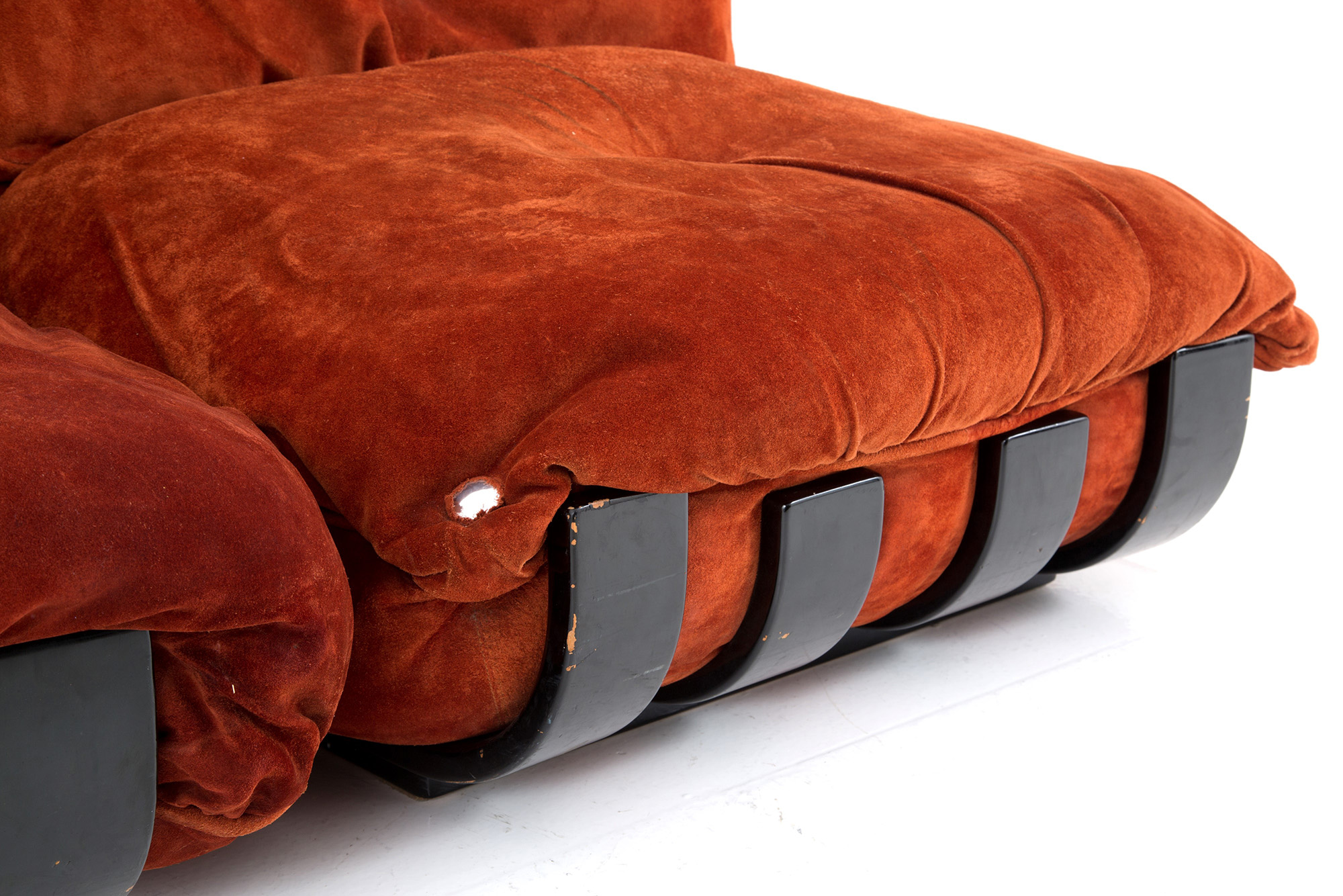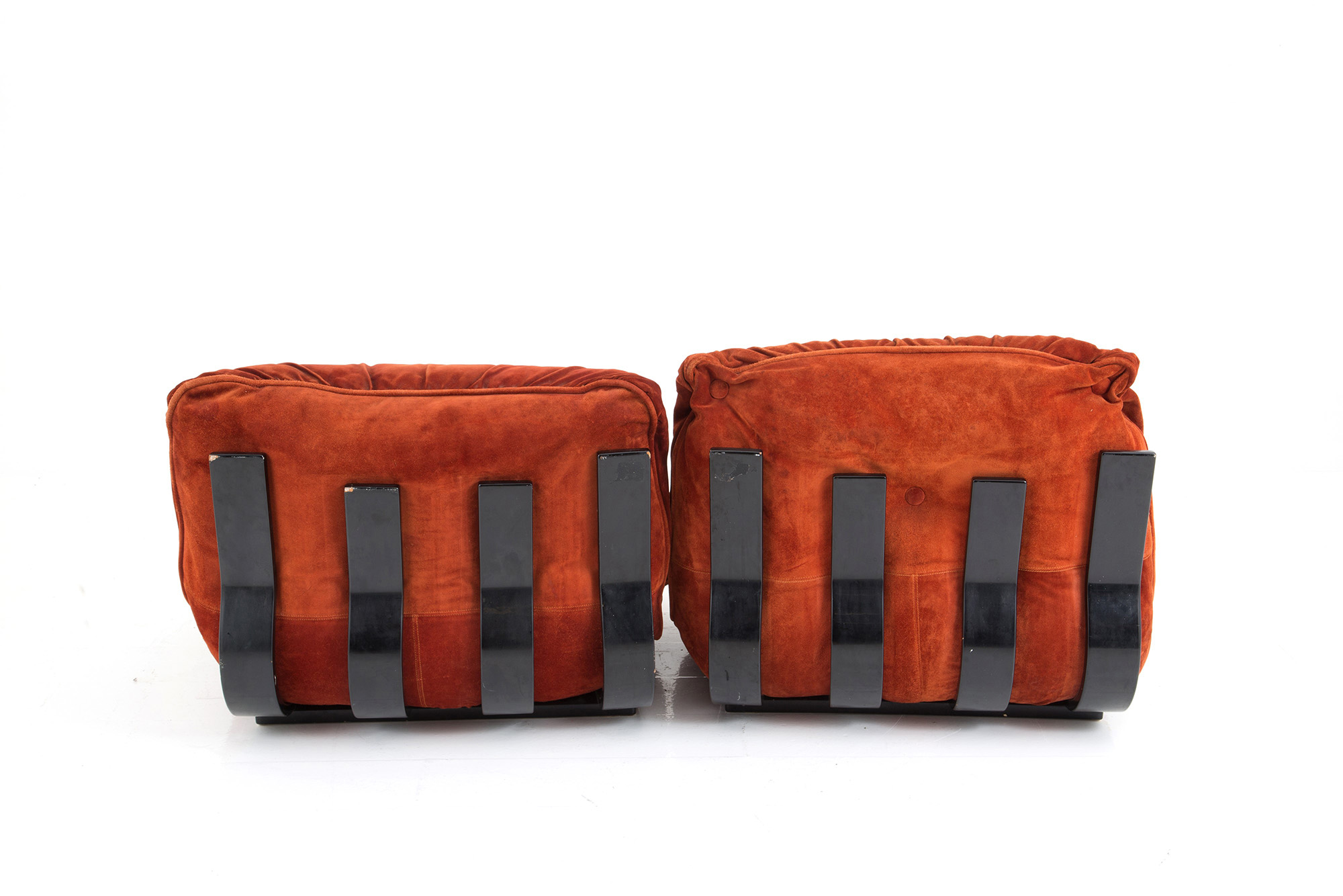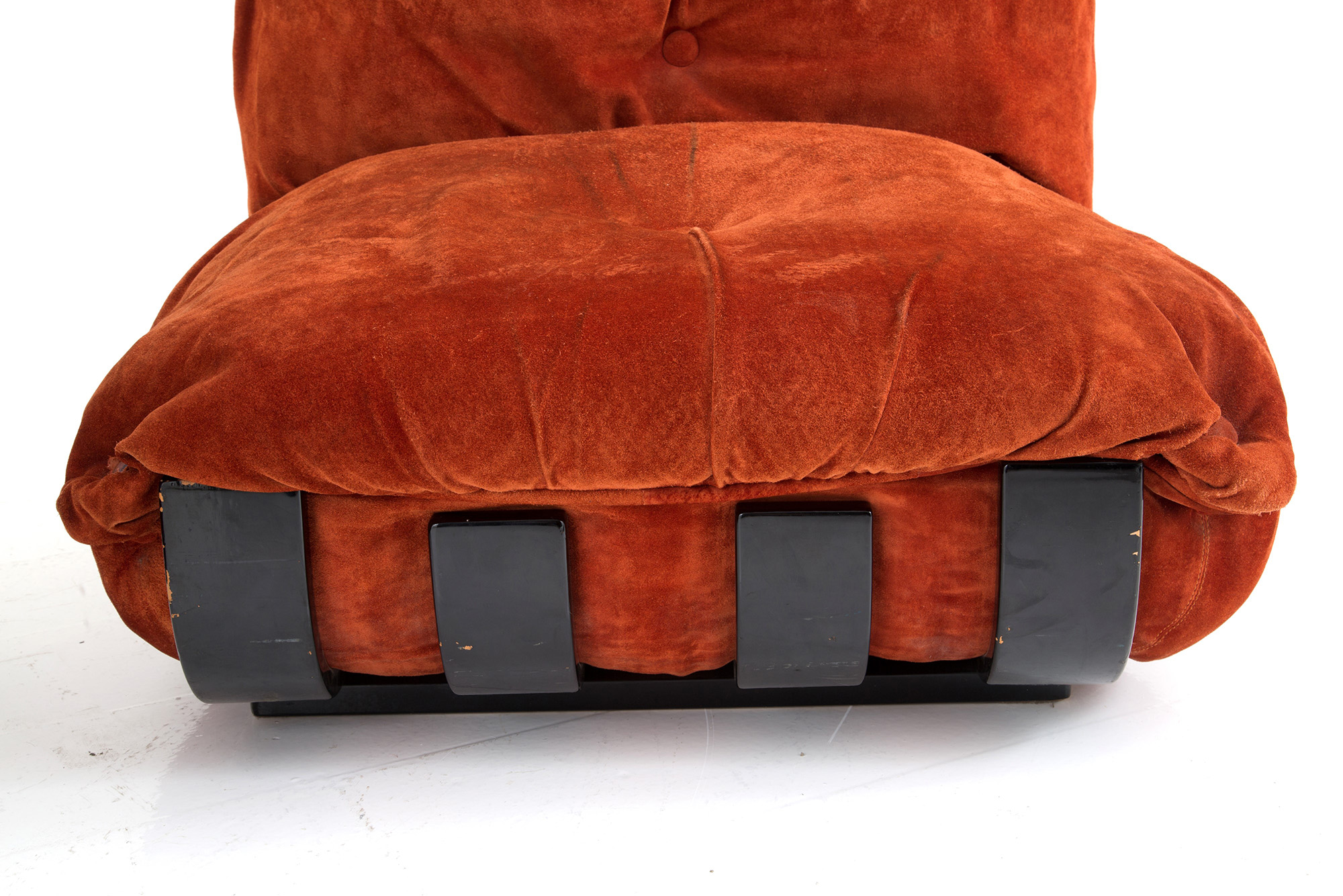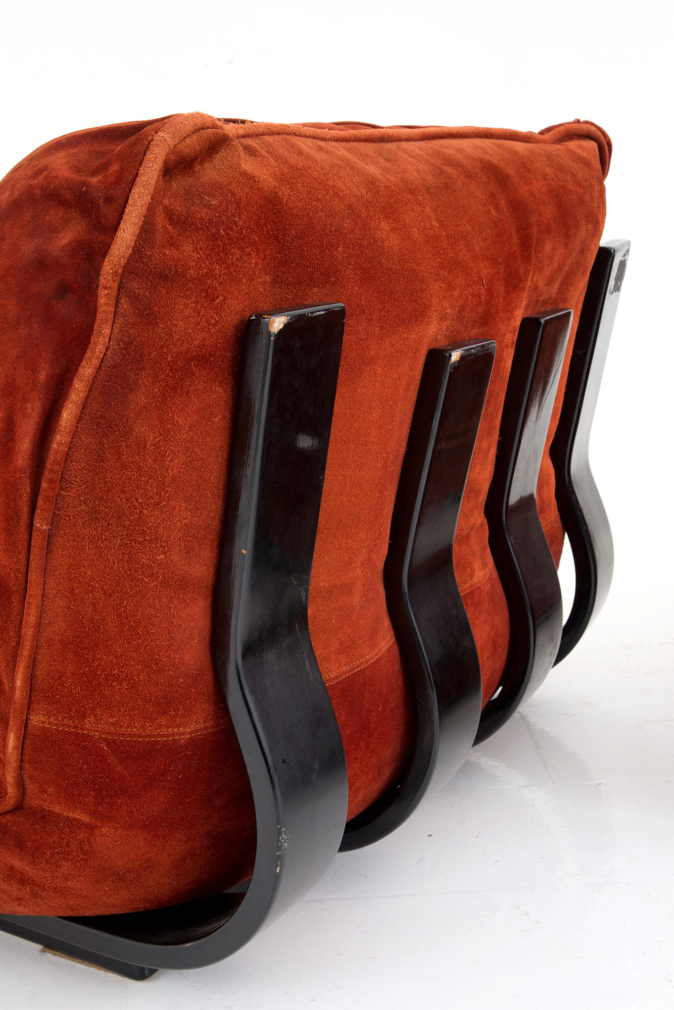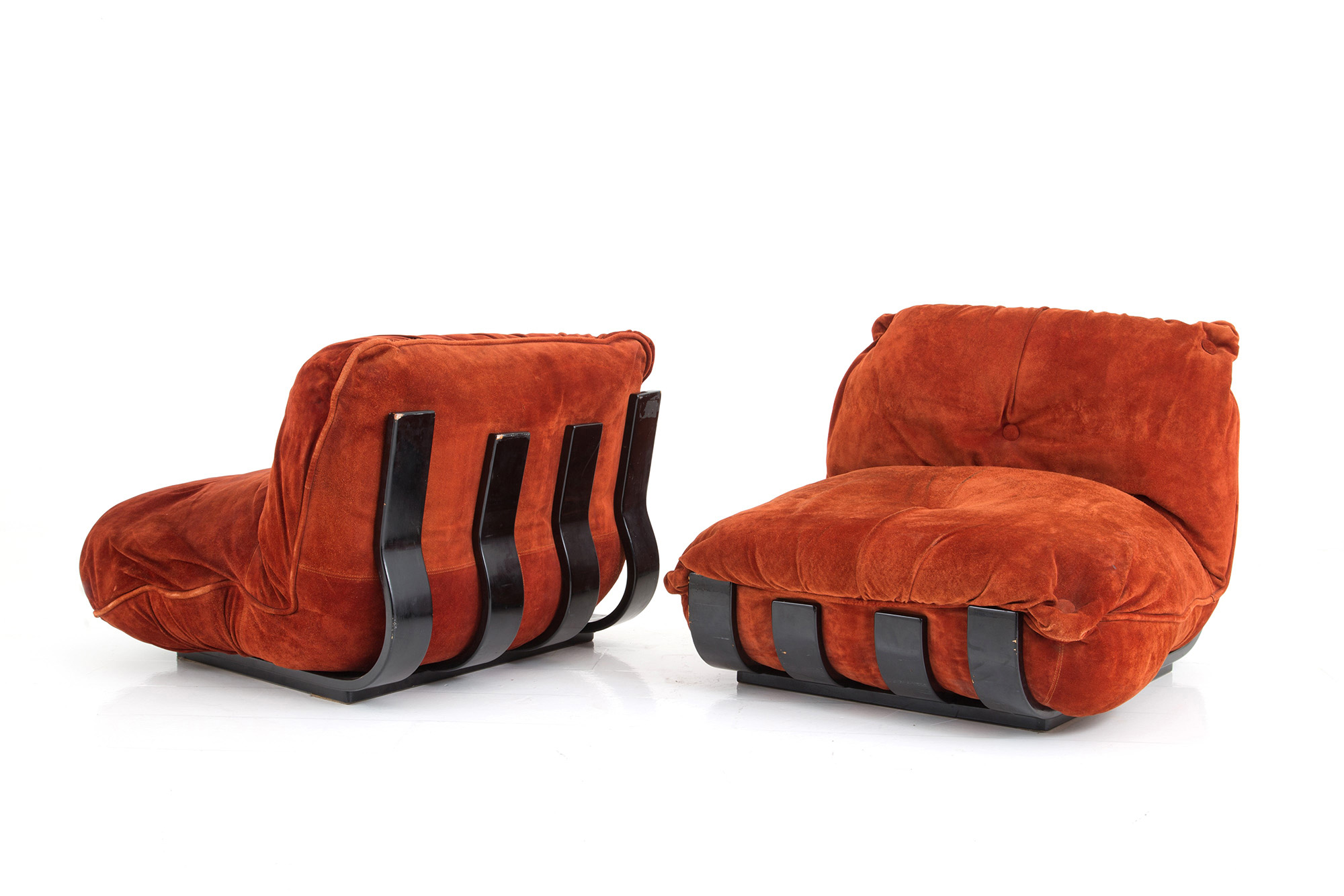 LUCIANO FRIGERIO (Desio 1928-Sanremo 1999). Pair of Gran Visir model armchairs in lacquered wood and chamois leather. FRIGERIO DI DESIO production. 70's. Defects on the leather and missing buttons on an armchair. 65x83x88 cm approx. LUCIANO FRIGERIO (Desio 1928-Sanremo 1999). Coppia di poltrone modello Gran Visir in legno laccato e pelle scamosciata. Produzione FRIGERIO DI DESIO. Anni '70. Difetti sulla pelle e mancante dei bottoni in una poltrona. 65x83x88 cm ca.