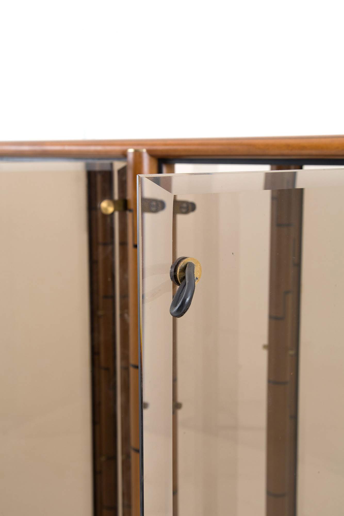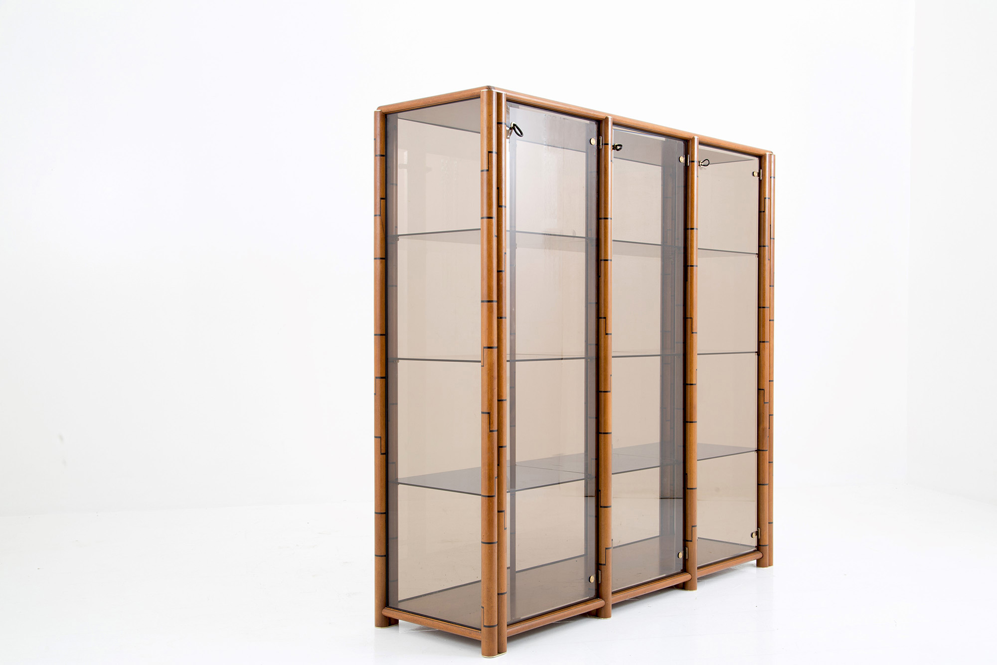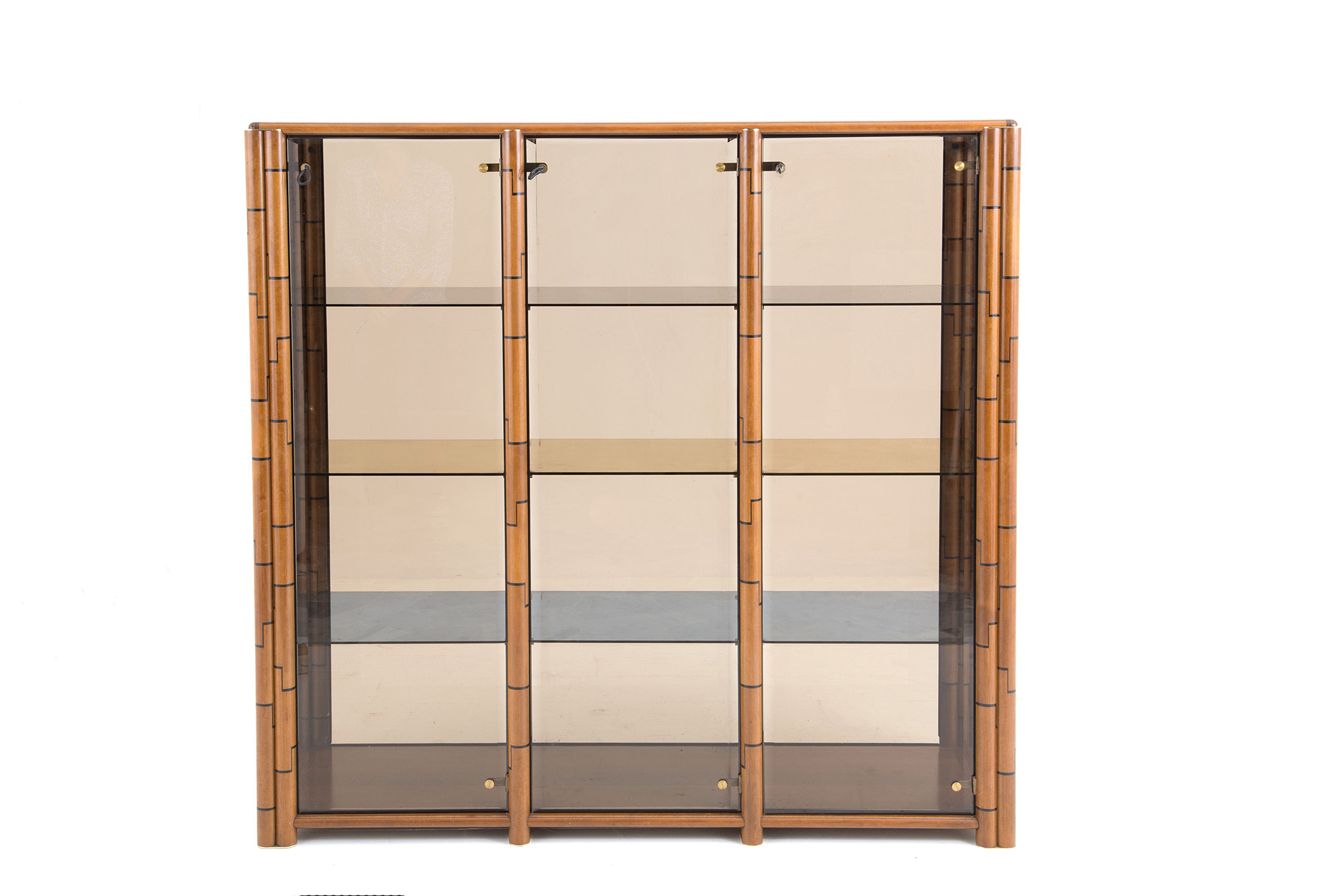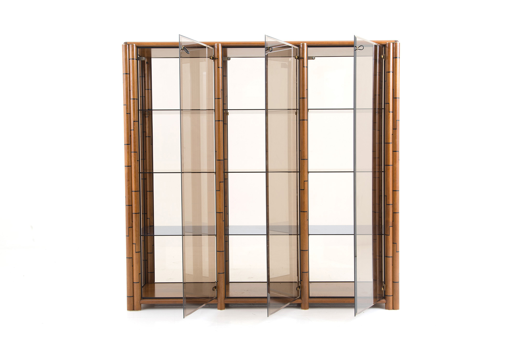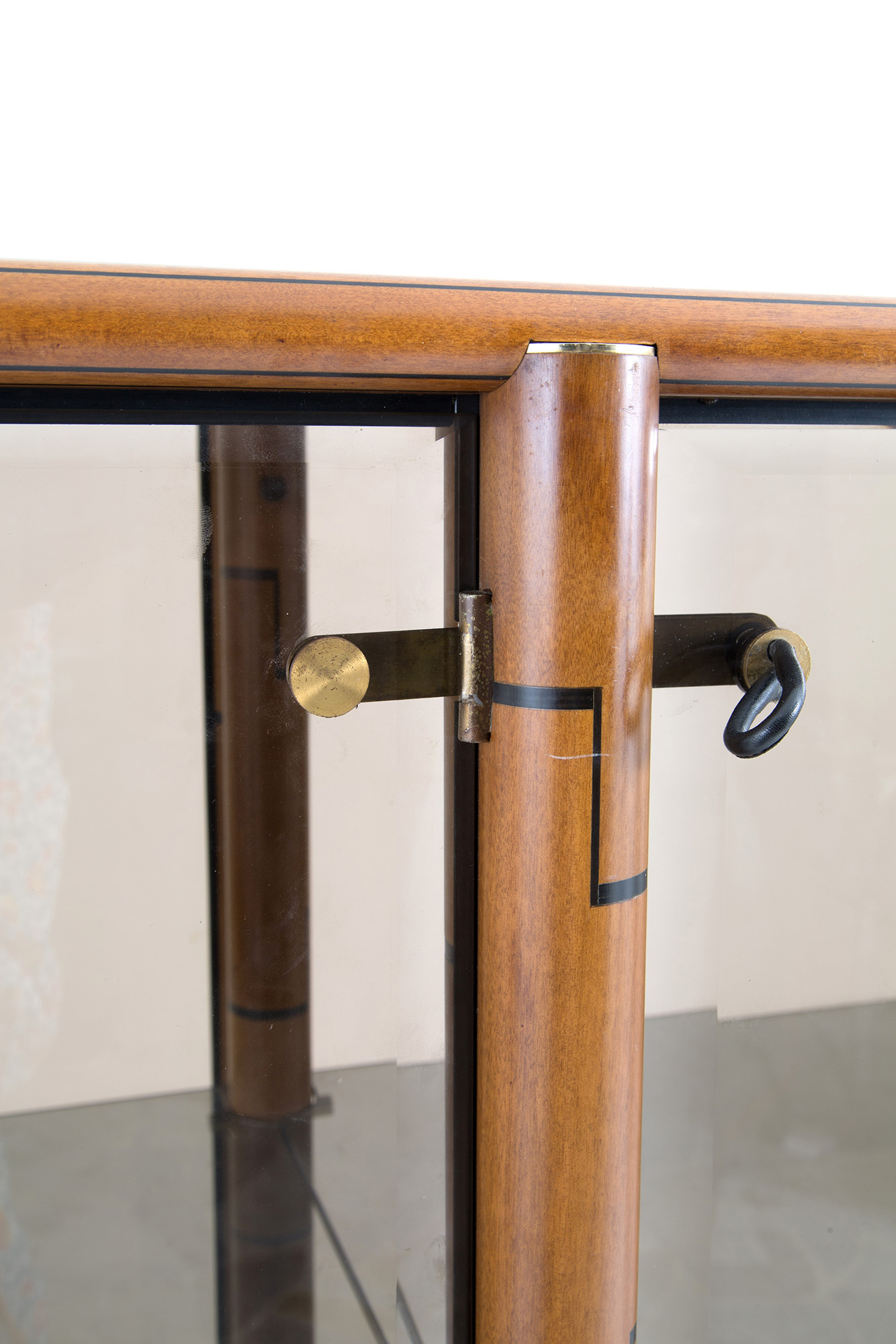 AFRA e TOBIA SCARPA. Artona series display cabinet with three doors in walnut wood inlaid in dark wood. MAXALTO production. 70's. Small flaw on the top. 141x143x44 cm approx. AFRA e TOBIA SCARPA. Vetrina serie Artona a tre ante in legno di noce intarsiata in legno scuro. Produzione MAXALTO. Anni '70. Piccolo difetto sul piano. 141x143x44 cm ca.