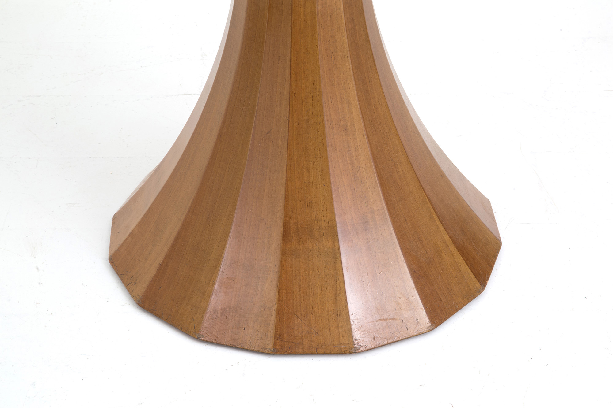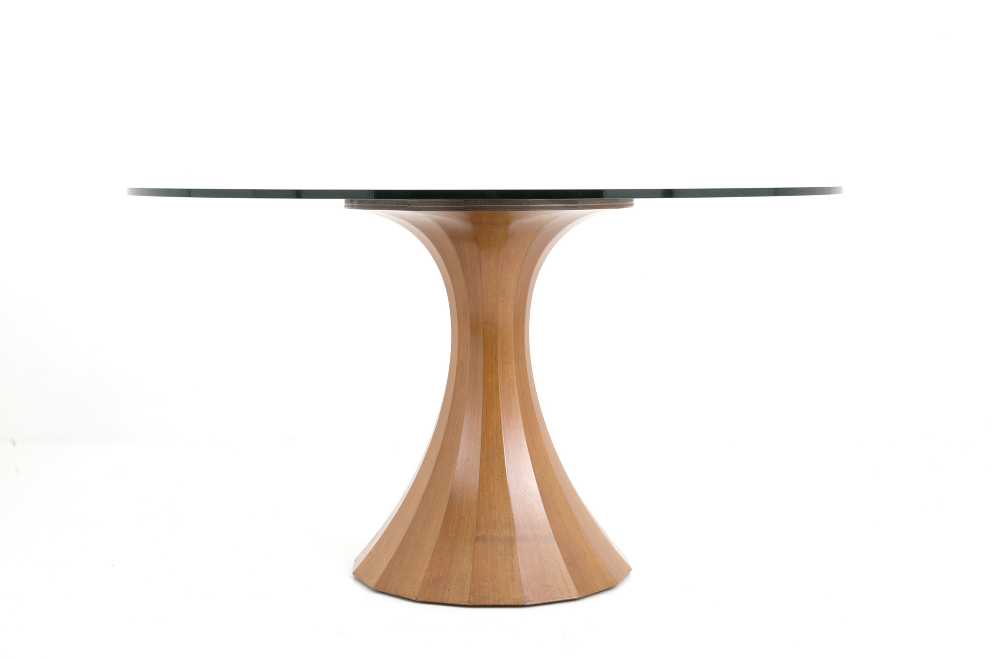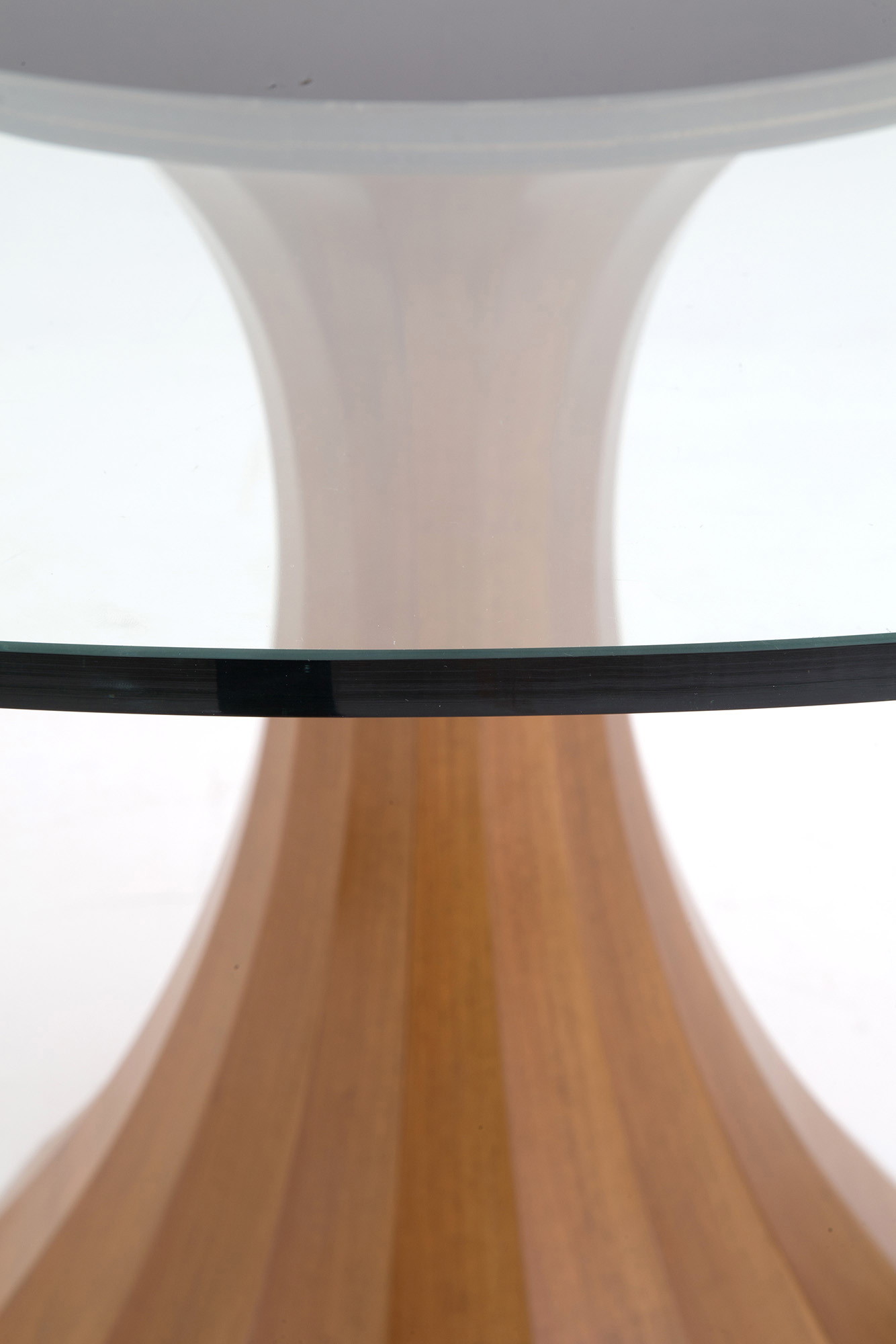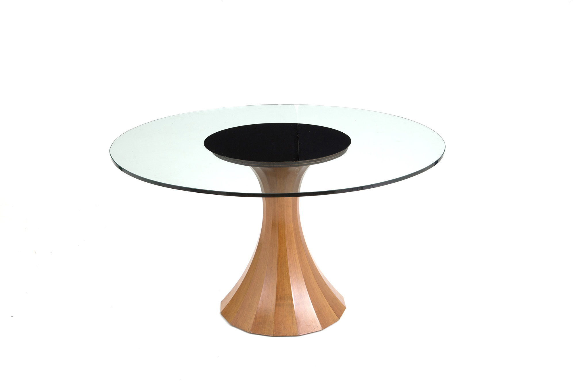 Table with polygonal wooden base and glass top. Slight defects. 76x135 cm approx. Tavolo con base poligonale in legno e piano in vetro. Lievi difetti. 76x135 cm ca.