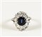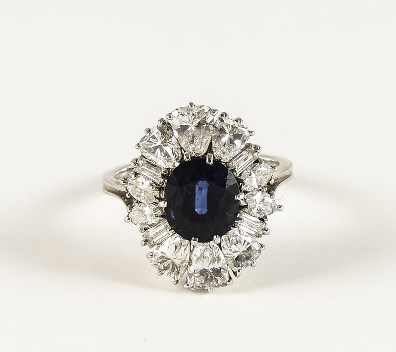 ANELLO A MARGHERITA IN ORO BIANCO, ZAFFIRO E DIAMANTI - WHITE GOLD, SAPPHIRE AND DIAMOND DAISY RING Anni Sessanta - 60s zaffiro centrale impreziosito da diamanti di taglio baguette, marchise e a goccia zaffiro ct 2,0 circa, diamanti ct 1,50 complessivi, gr 4,9