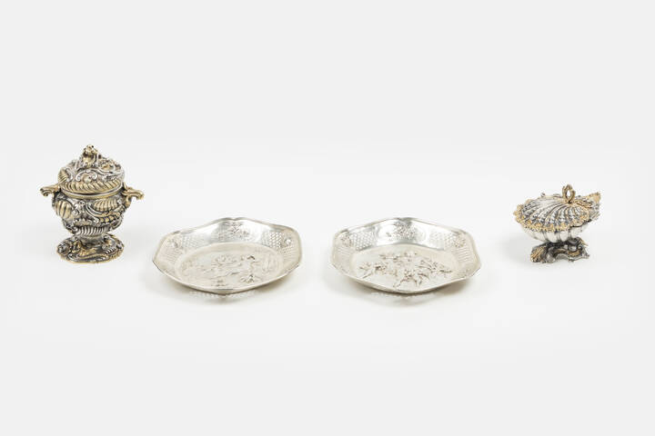 -2 piatti, probabilmente Francia o Olanda, con scene sbalzate ed incise raffigurante l'Allegoria dell'Abbondanza; bordo traforato e decori a fiori e motivi vegetali. Punzoni "F.L" e "S.S.H". Peso gr 727,2
