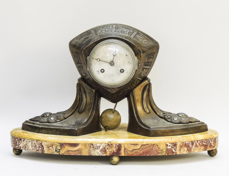 OROLOGIO DA TAVOLO IN ANTIMONIO PATINATO - PATINATED ANTIMONY TABLE CLOCK Anni Venti - 20's cassa di forma triangolare decorata con i segni zodiacali firmata P. Sega, quadrate in metallo con numeri romani sorretto da due sostegni sagomati sbalzati con fiori di gusto Decò, su base ovale in marmi colorati, da revisionare h cm 27x41x17