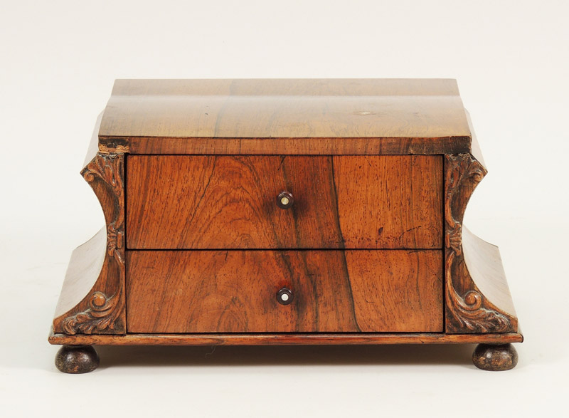 COFANETTO IMPIALLACCIATO IN NOCE - SMALL WALNUT VENEERED CHEST seconda metà del XIX secolo - second half of 19th Century due cassettini sul fronte, fregi laterali intagliati con foglie d'acanto, piedini a palla schicciata, difetti h cm 16x32x23