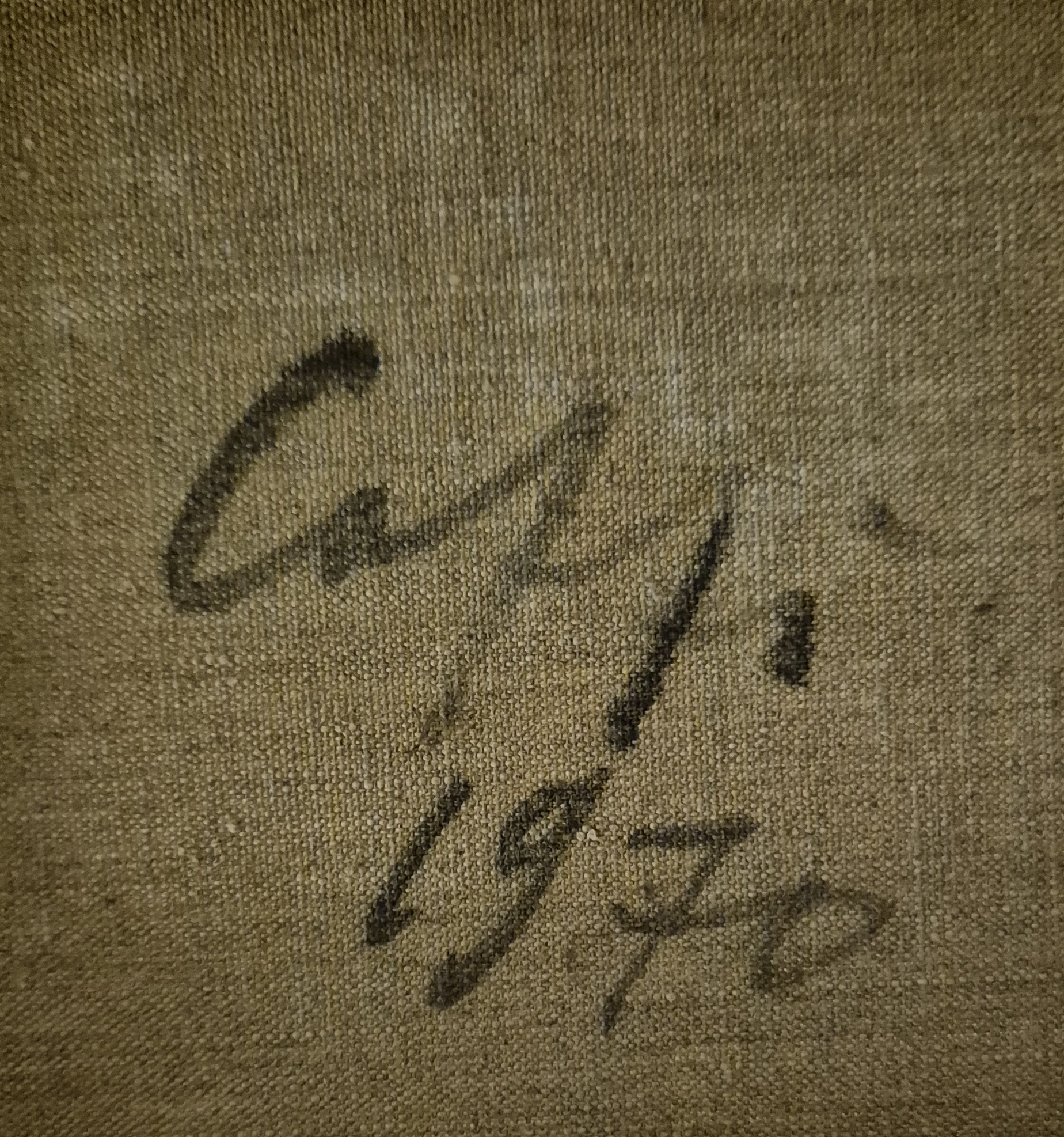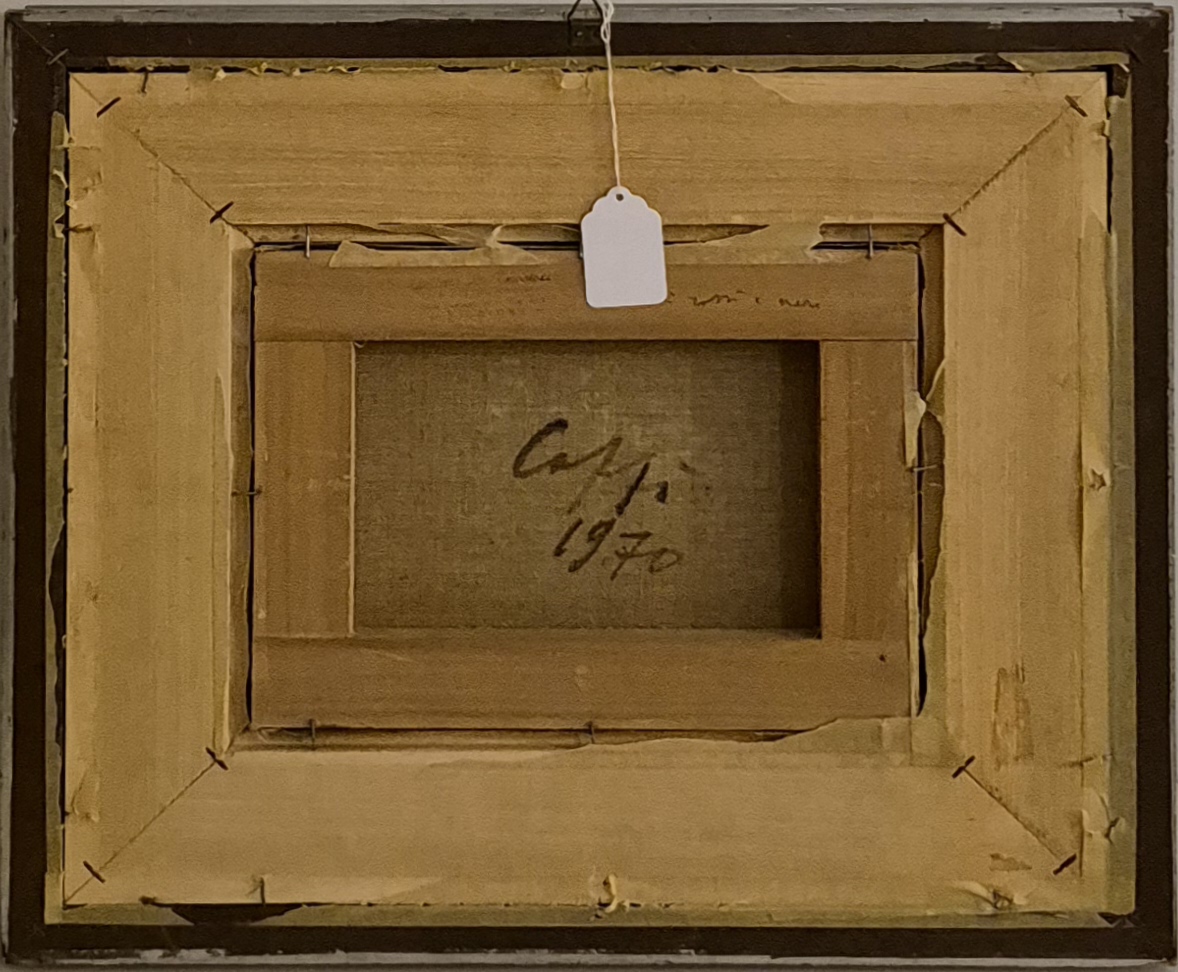 Olio su tela. Firmato in basso al centro Caffè. Al verso titolato, datato e firmato Caffè 1970 Romani rossi e neri.