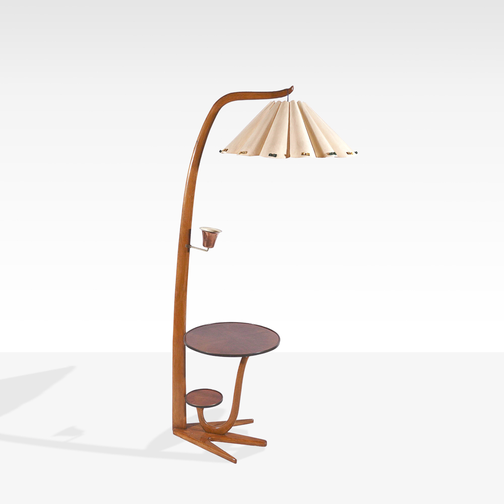 lampada da terra in legno curvato, ottone e rame, completa di paralume