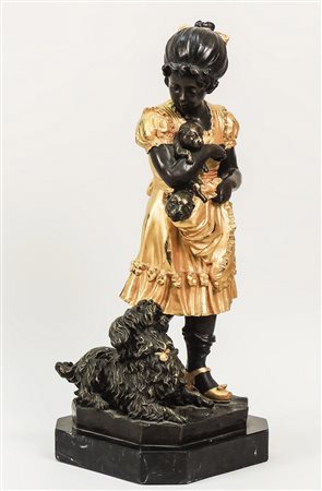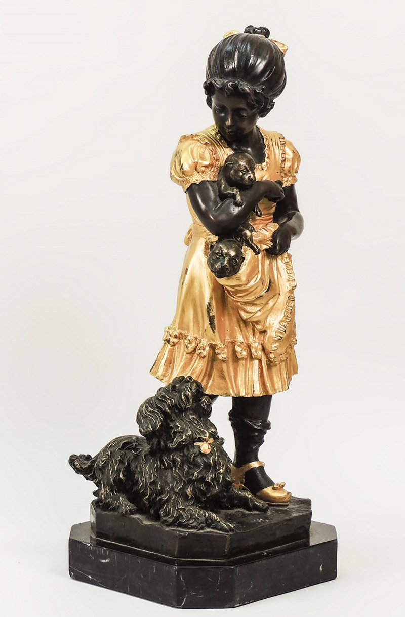 BAMBINA CON CAGNOLINI - YOUNG GIRL WITH DOGS scultura in bronzo in parte dorato - bronze sculpture su base ottagonale in marmo nero h cm 47