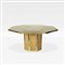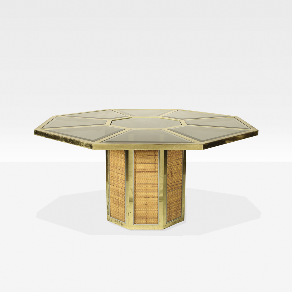 tavolo ottagonale mod. Topazio in ottone, rattan e vetro fumè, usure.