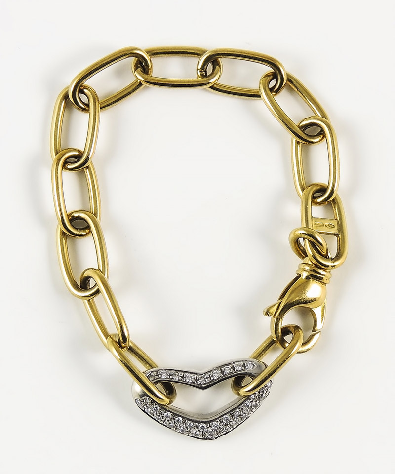 BRACCIALE IN ORO GIALLO E BRILLANTI - GOLD AND DIAMOND BRACELET realizzato a maglie allungate, impreziosito da cuore inpavè di brillanti gr 32,1