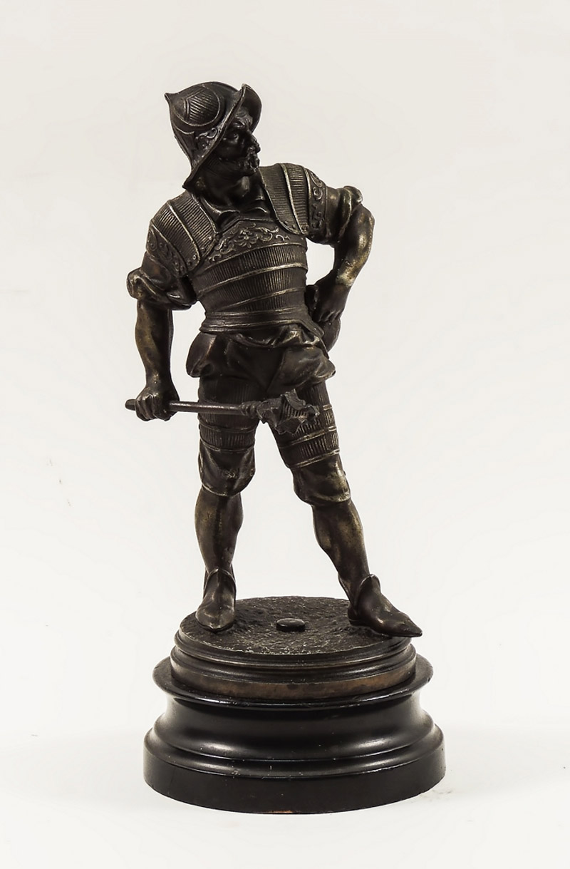 FIGURA DI GUERRIERO IN ARMATURA - WARRIOR IN ARMOUR scultura in metallo patinato - patinated metal sculpture su base in legno h cm 30