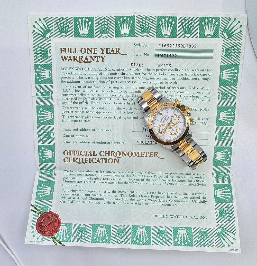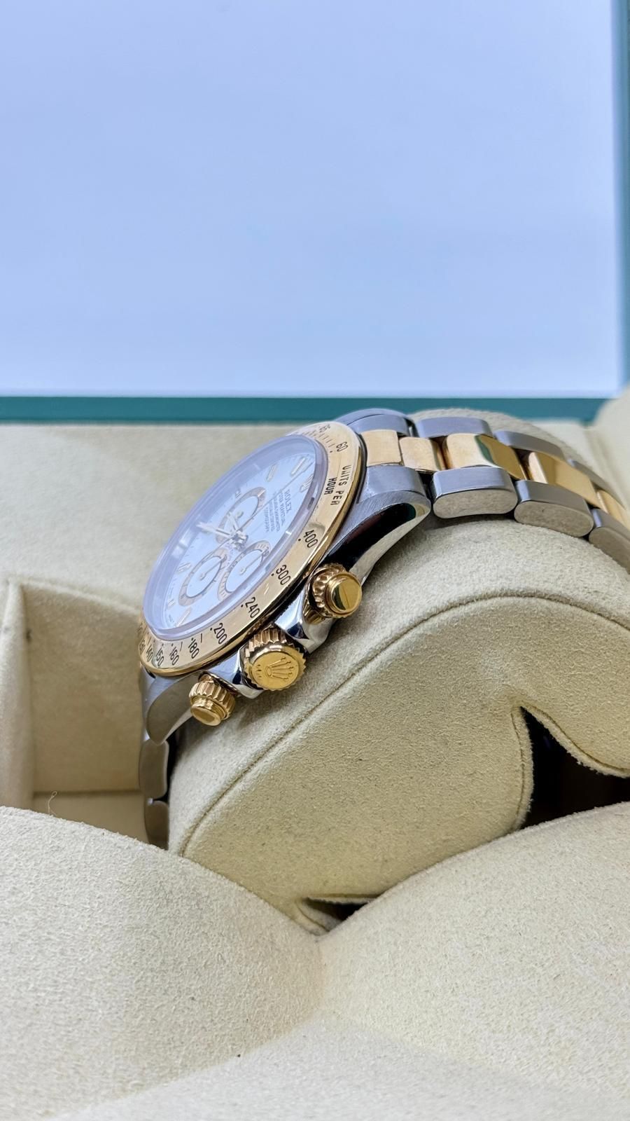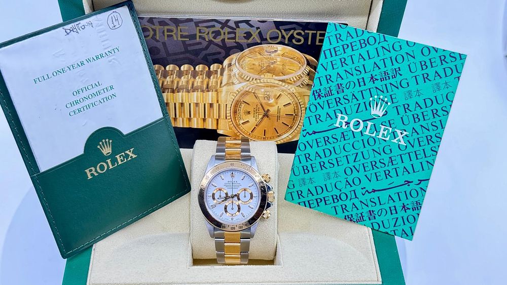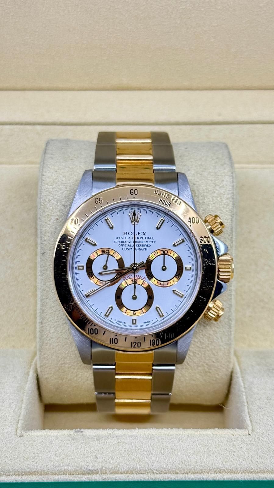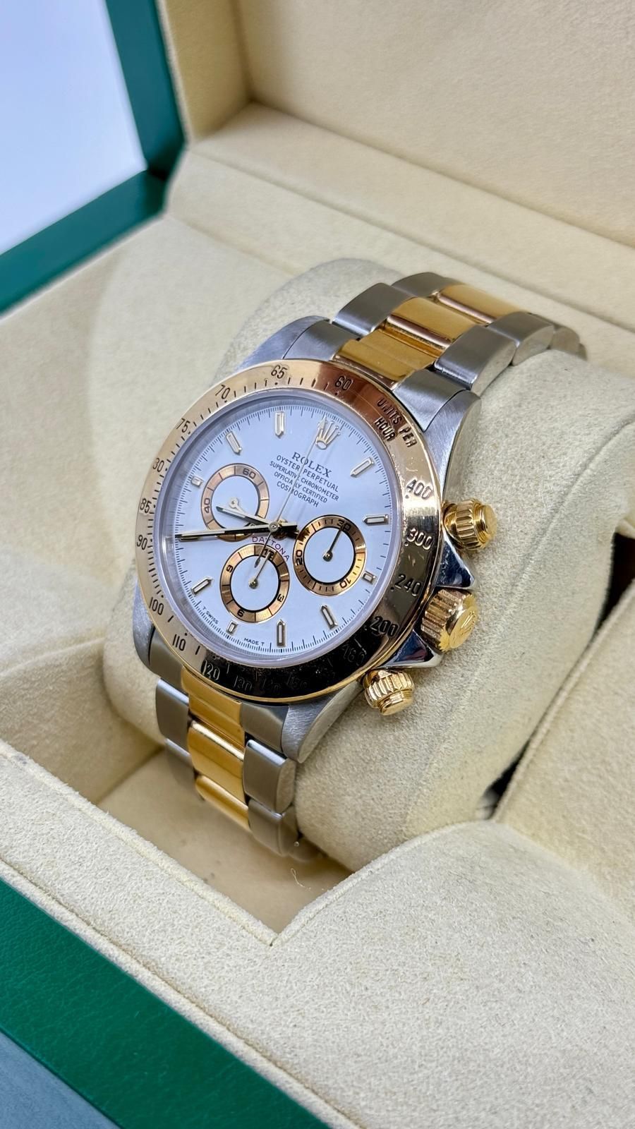 Marca Rolex Modello (Orologio) Daytona Numero di referenza 16523 Carica Automatico Materiale della cassa Oro/Acciaio Materiale cinturino Oro/acciaio Anno di produzione 1997/98 documenti originali Rolex, no box Calibro Carica Automatico Cassa Materiale della cassa Oro/Acciaio Diametro 40 mm Impermeabile 10 ATM Materiale lunetta Oro giallo Vetro Vetro zaffiro Cinturino Materiale cinturino Oro/acciaio Colore cinturino Oro/acciaio Chiusura Déployante Materiale chiusura Oro/Acciaio Funzioni Cronografo