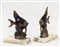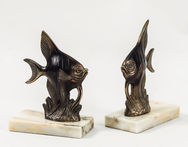 COPPIA DI FERMALIBRI IN METALLO PATINATO - PAIR OF PATINATED METAL BOOKENDS raffiguranti pesci tropicali, su basi in onice h cm 21