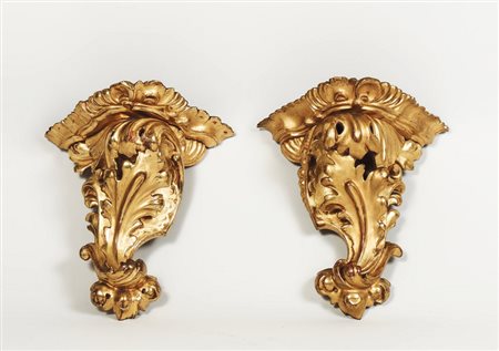 COPPIA DI MENSOLINE IN LEGNO INTAGLIATO E DORATO - A PAIR OF GILTWOOD SHELVES pianetto sagomato sostenuto da foglie d'acanto h cm 24