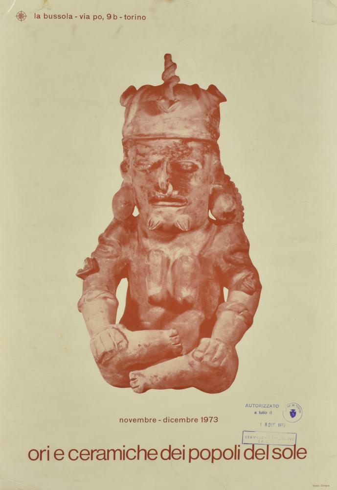 manifesto cm 50x34, realizzato da Grafic Olimpia per la mostra 'Ori e ceramiche dei popoli del sole' tenutasi alla Bussola di Torino da novembre a dicembre del 1973.