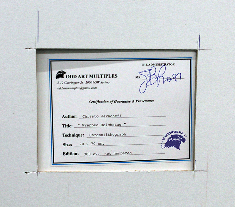 CHRISTO E JEANNE-CLAUDE, "Wrapped Reichstag", Cromolitografia su cartoncino in 300 esemplari, Dim. 70x70, Al verso: Certificato di Garanzia Odd. Arte Multiples (Sidney), Al fronte: Firmato in alto a sinistra