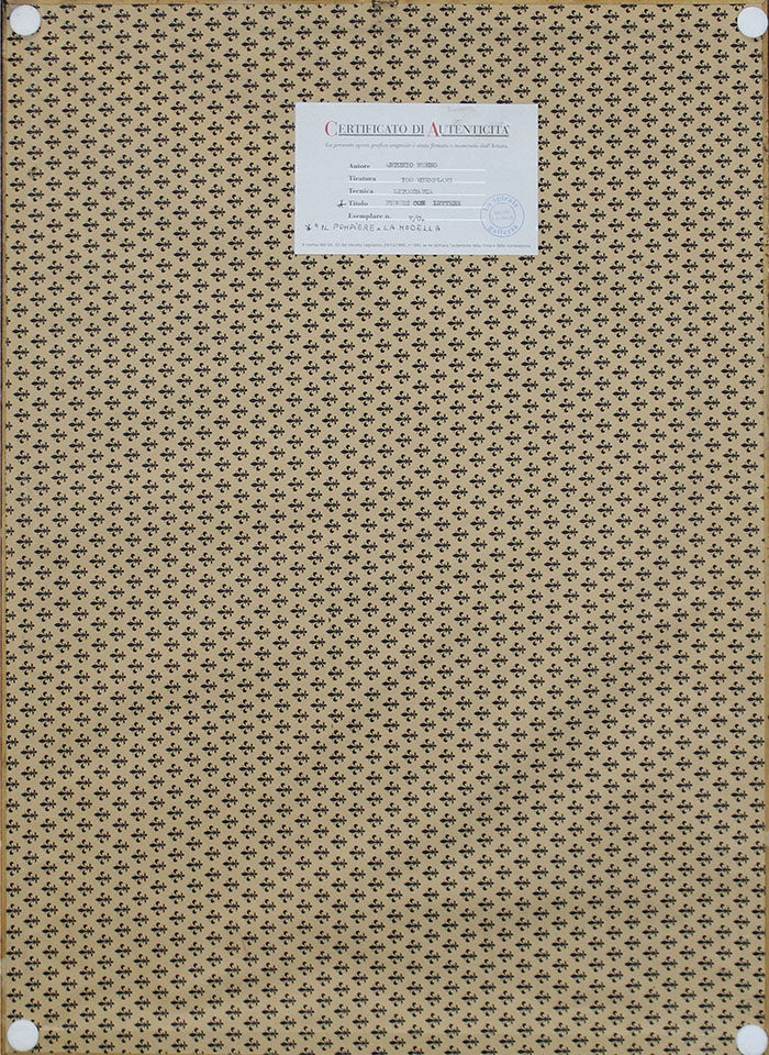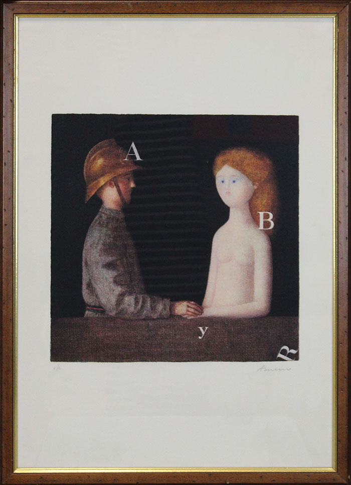 ANTONIO BUENO, "Pompiere e modella", Litografia su cartoncino, Dim. 65x45, Al fronte: in basso a sinistra esemplare V/C, in basso a destra firma, Opera con cornice