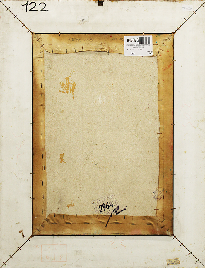 GIANBAR, "Donna dai capelli rossi", 1973, olio su tela intavolata, dim 50x40. Al fronte: firma in alto a destra. Al verso: in alto a destra etichetta: nome autore, titolo, anno, dimensioni. Opera con cornice.