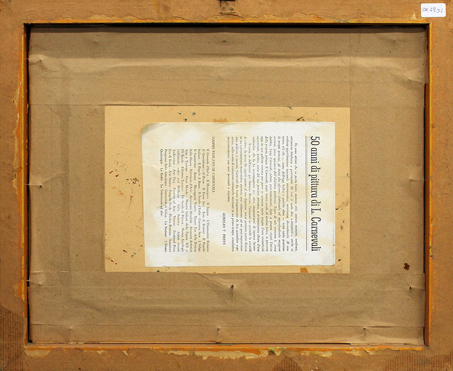 LUIGI CARNEVALI, "Natura Morta", anni '70 circa, olio su tavola, dim 24,5x33. Al verso: inserto di giornale "50 anni di pittura di L.Carnevali", testo di Aurelio T. Prete. Opera con cornice.
