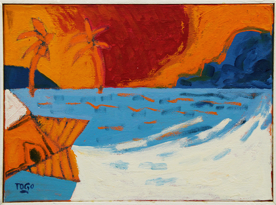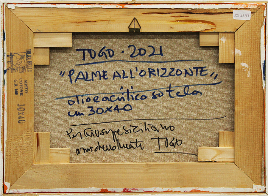 TOGO, "Palme all'Orizzonte", 2021, olio e acrilico su tela, dim 30x40, autentica su foto dell'artista. Al fronte: firma in basso a sinistra. Al verso: firma, titolo, anno, tecnica, dimensione, dedica.